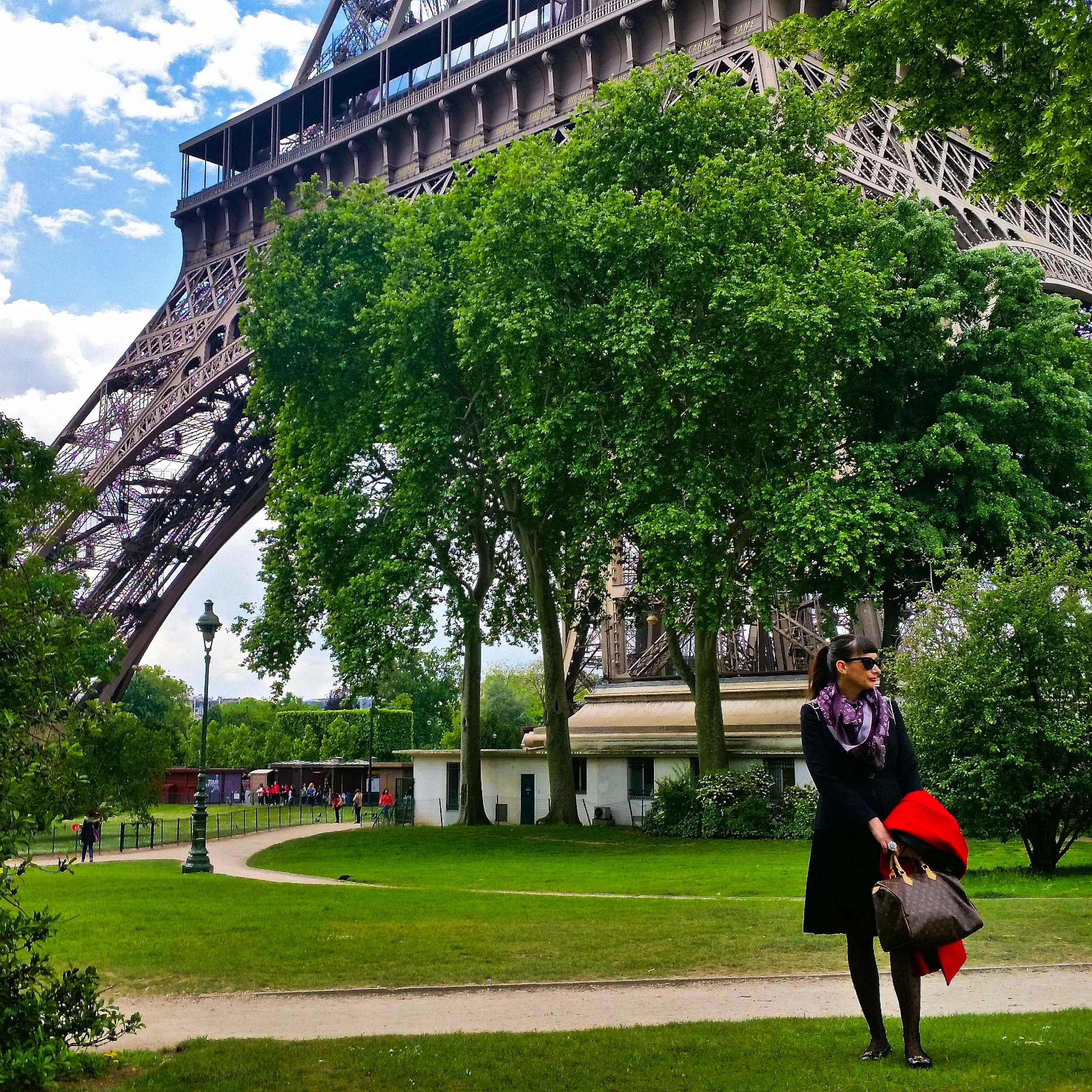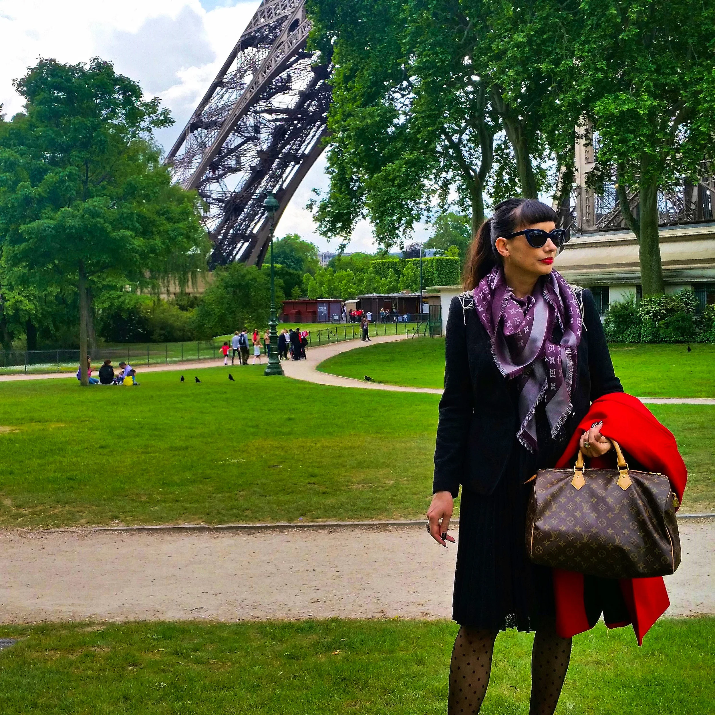 For the first day in Paris I chose to wear a beautiful sleeveless dress by Karen Millen with a jacket by Zara and my red coat from Debenhams because it was a bit cold. I added my purple pashmina for protection from the wind, my Louis Vuitton bag and flats and a pair of polka-dot stockings which I love. This dress has an amazing texture that looks like lace because of the pink fabric underneath. It matches the jacket perfectly because, this one, has a texture that resembles lace, as well. My bag, flats and pashmina were the accessories choices for almost all of my outfits in Paris as they work with everything.