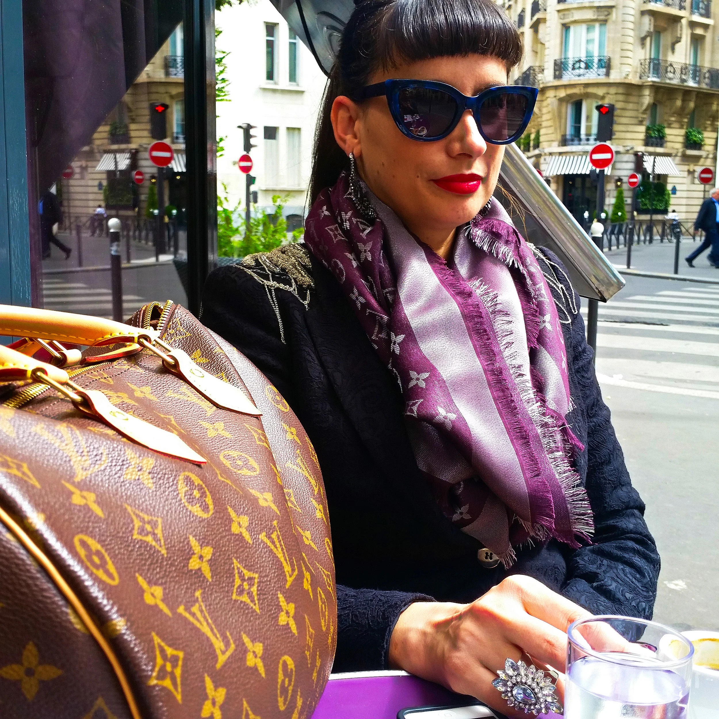 People watching and coffee sipping at the "cafe" next to our hotel. For this look I'm wearing a ring by h&m and my new blue sunnies by Uterque. On my next posts about Paris you will be noticing the same ring, sunnies, pashmina and handbag.