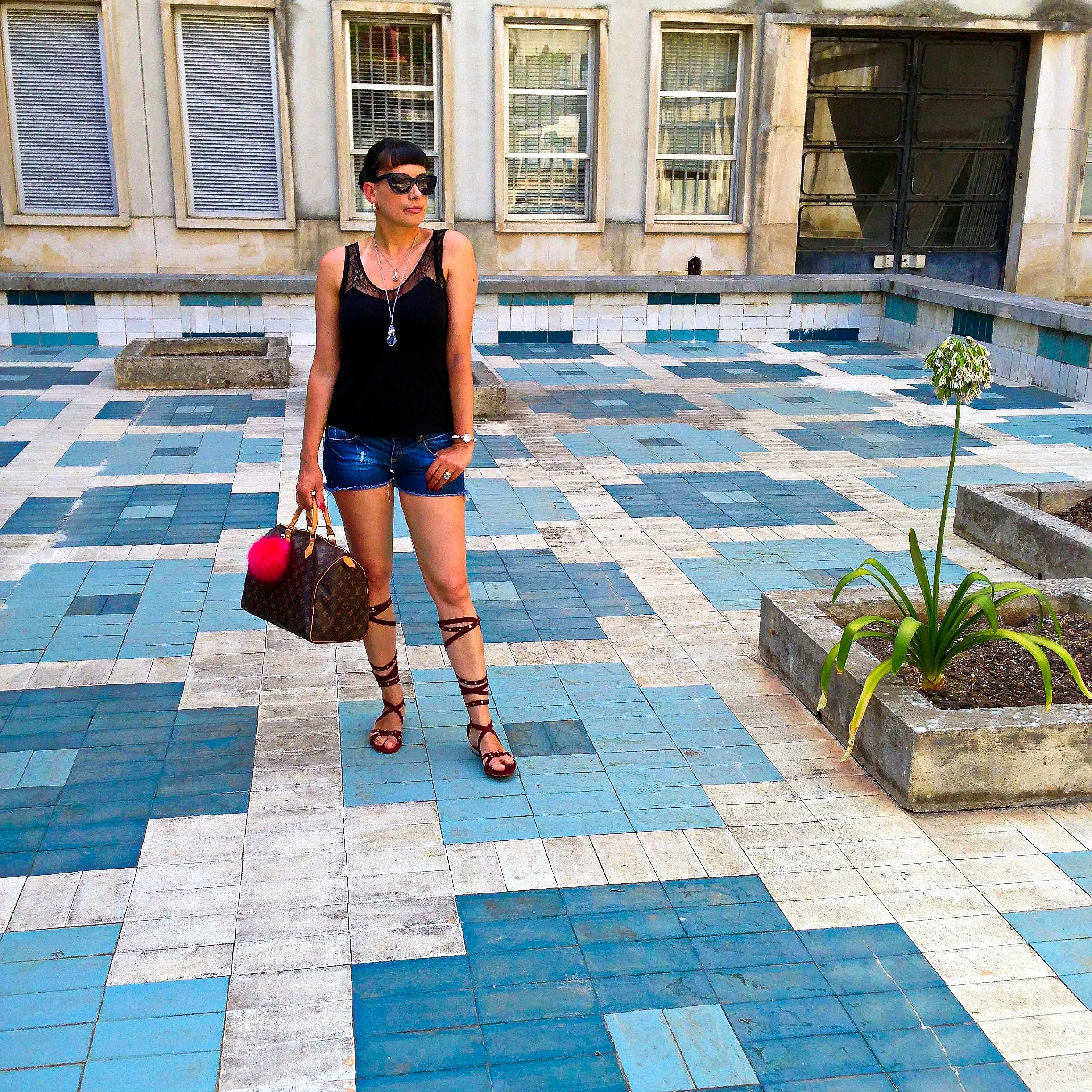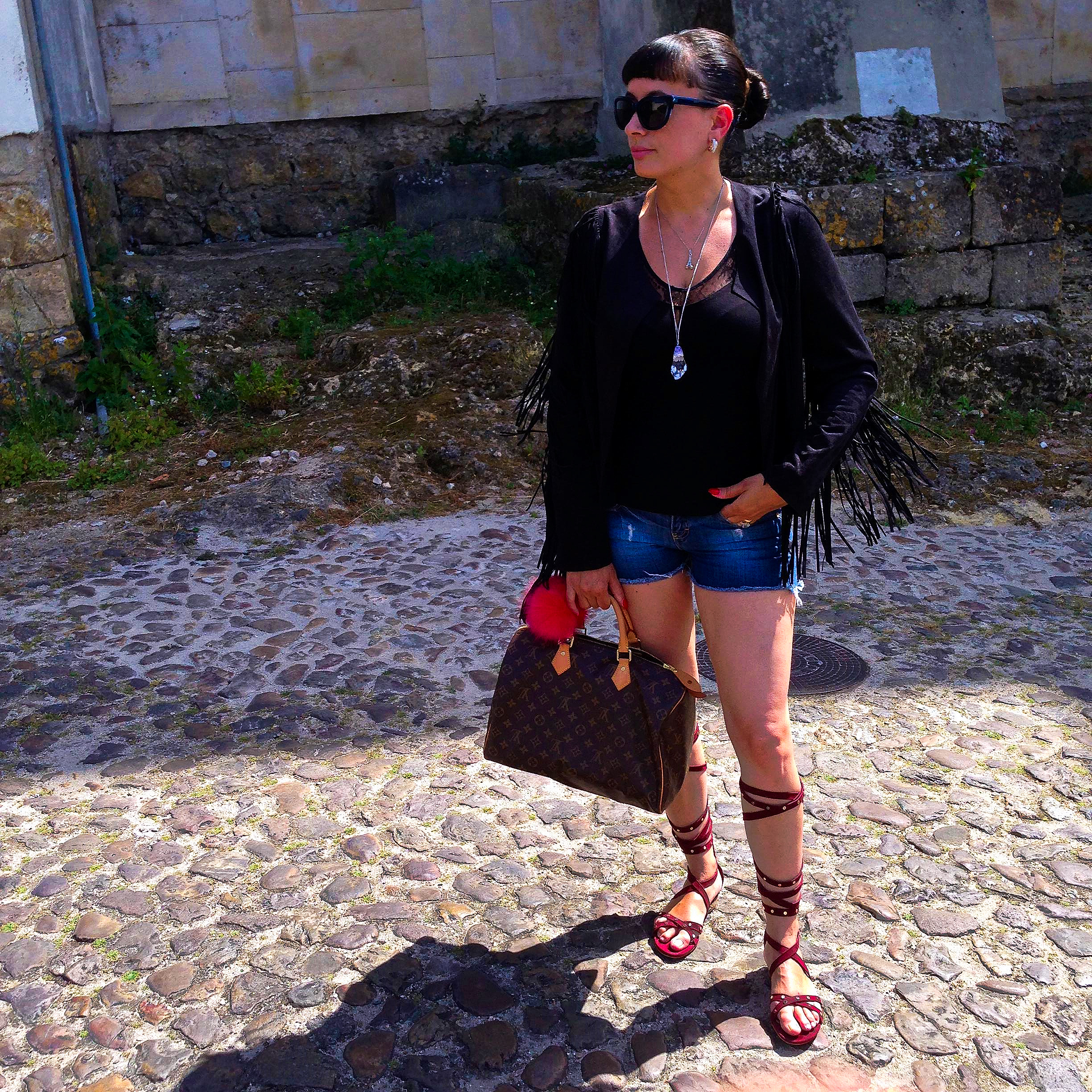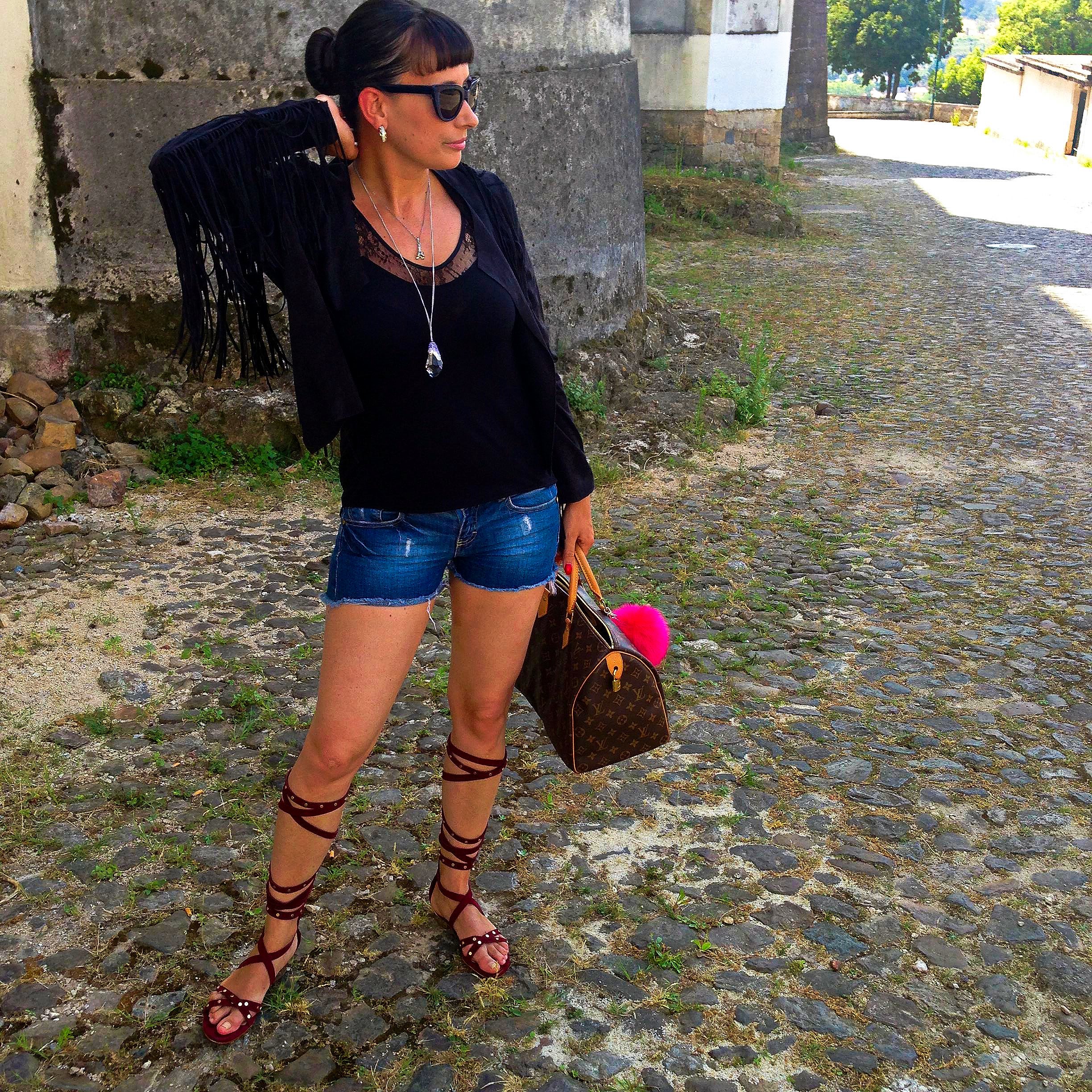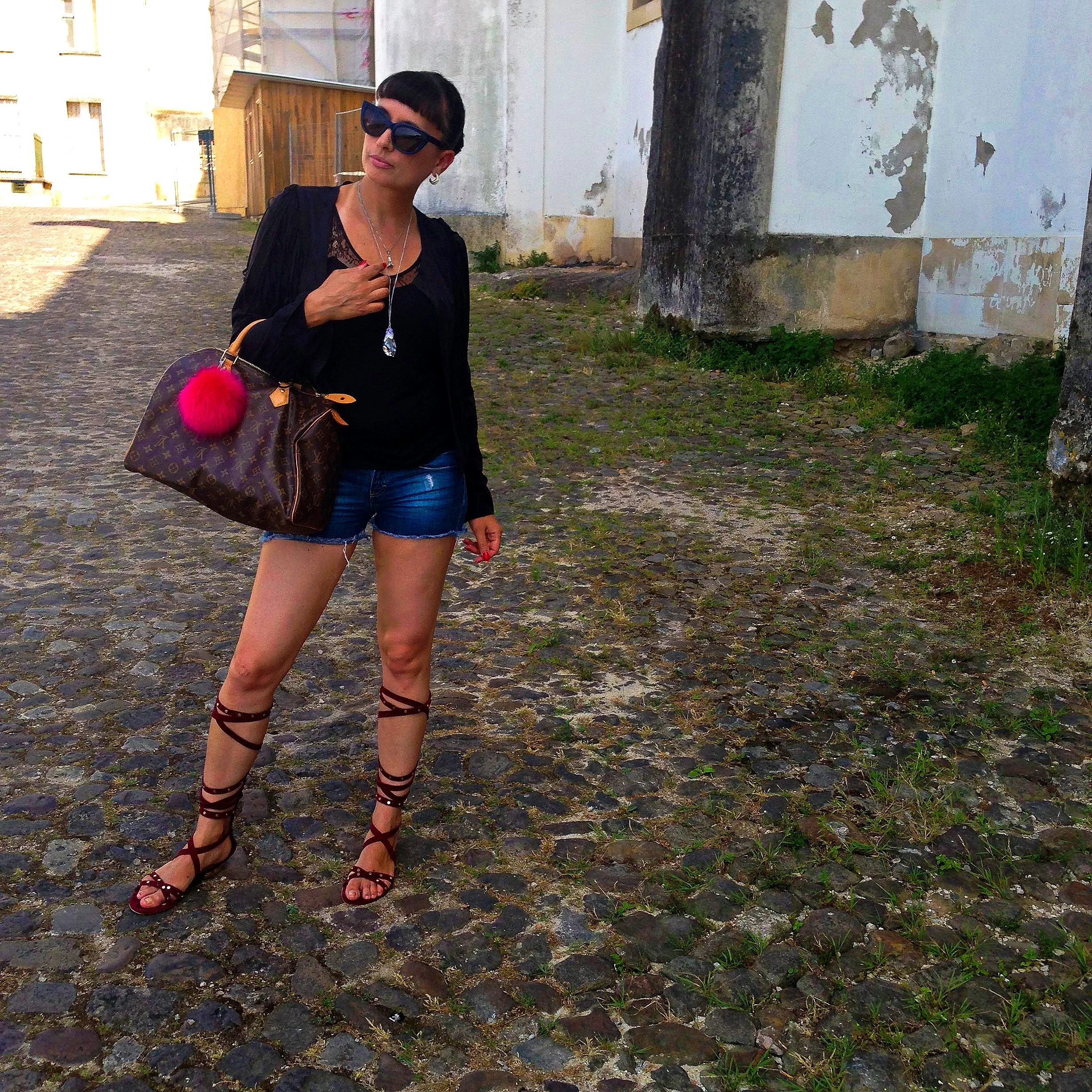 Once again I bring you a combo based on more expensive items and also cheaper ones. This pair of denim shorts I purchased season's ago in Bershka and they were extremely affordable. Also the black lace top from Karen Millen was purchased on sale and I managed to bring it home for just a few pounds! The fur key-ring is by River Island (another very affordable store) and it's just adorable. On the other hand, the neutral Speedy Louis Vuitton bag was a recent investment has were the gladiator sandals by Uterque. I always like to invest a little bit more money on accessories, has they can totally transform the look.