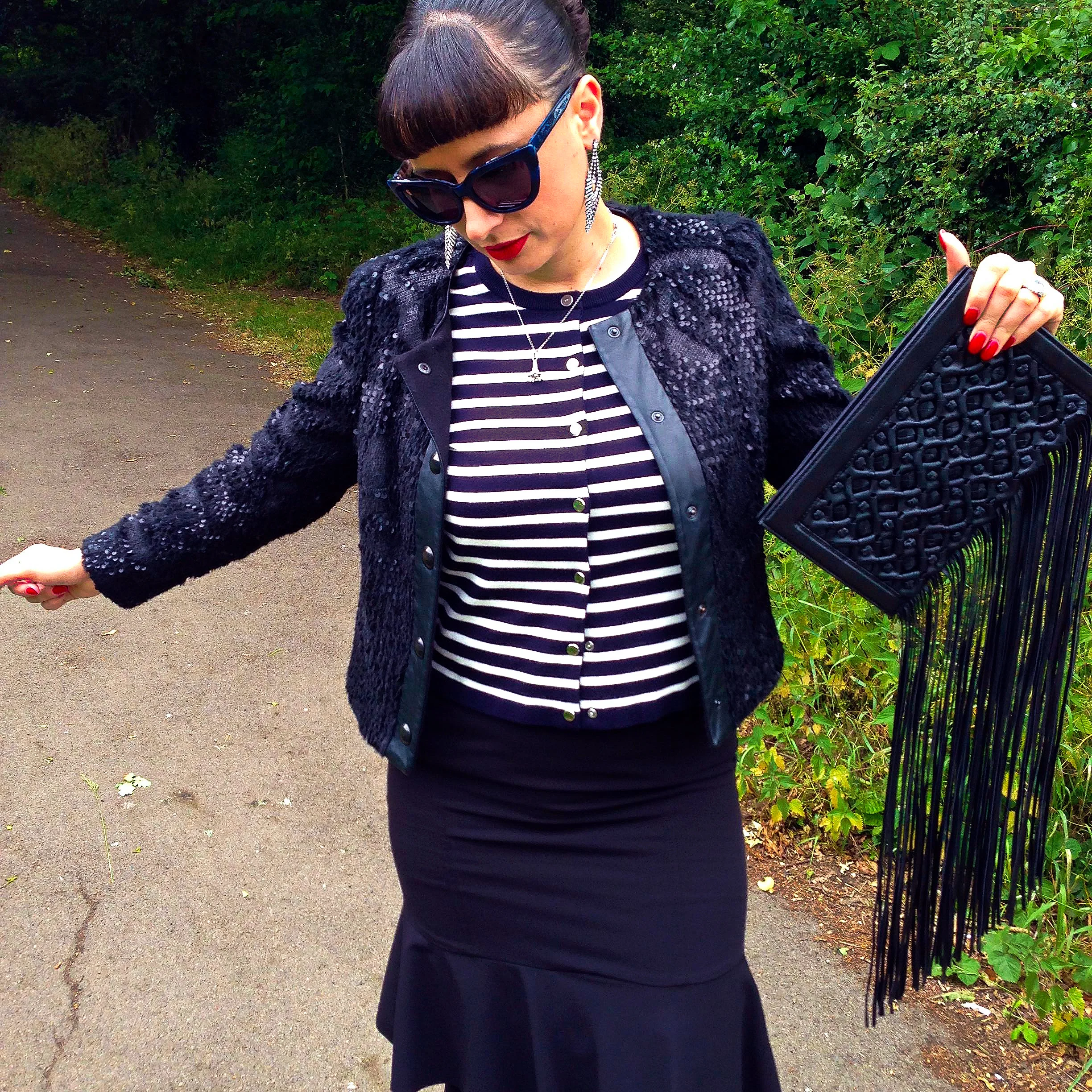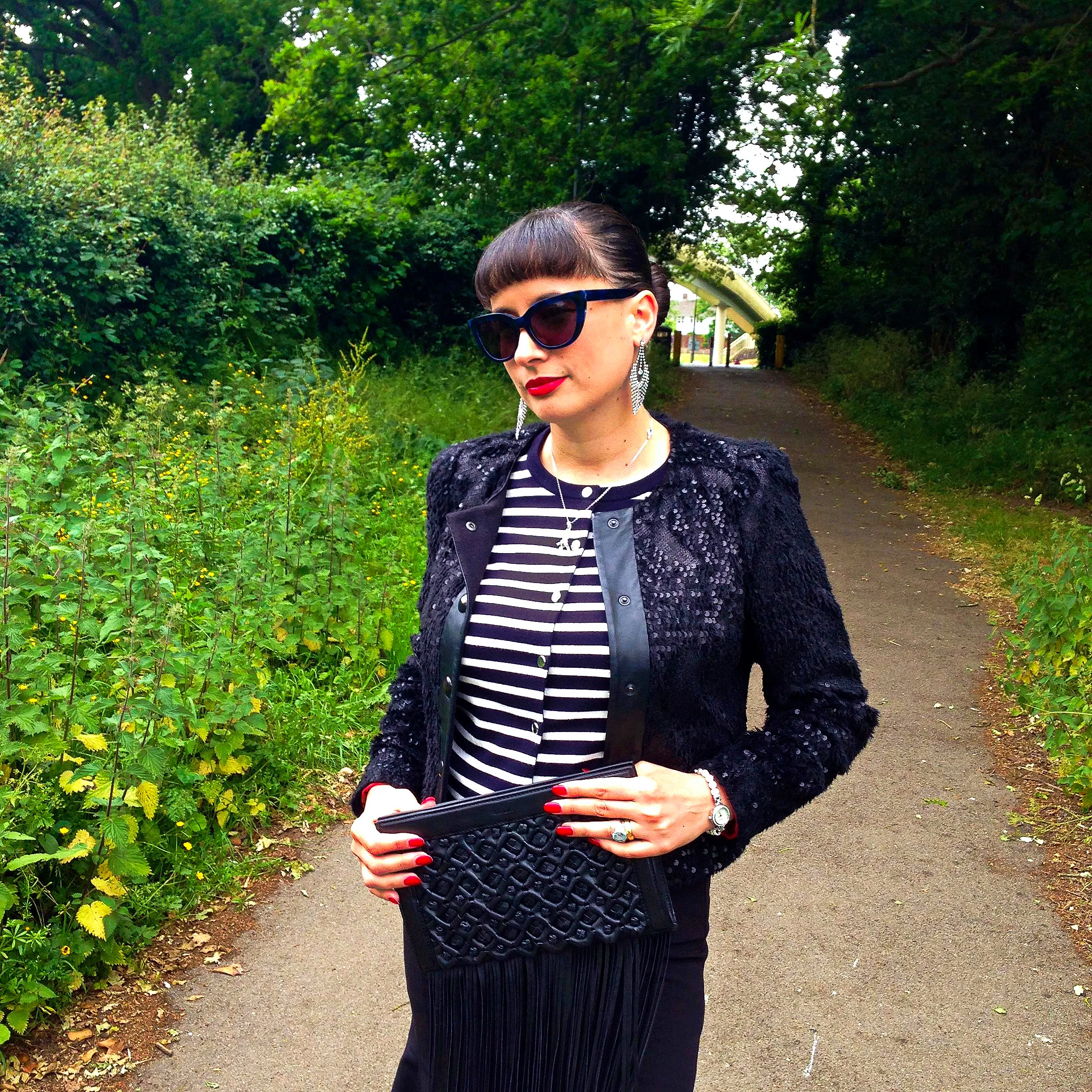 For this look I decided on wearing a pair of shiny, black, "Mary Jane's" shoes which I think work perfectly with the girly part of the outfit: jacket, skirt, earrings and necklace. The boyish part include: fringe clutch, "mariniere" cardigan and sunnies.