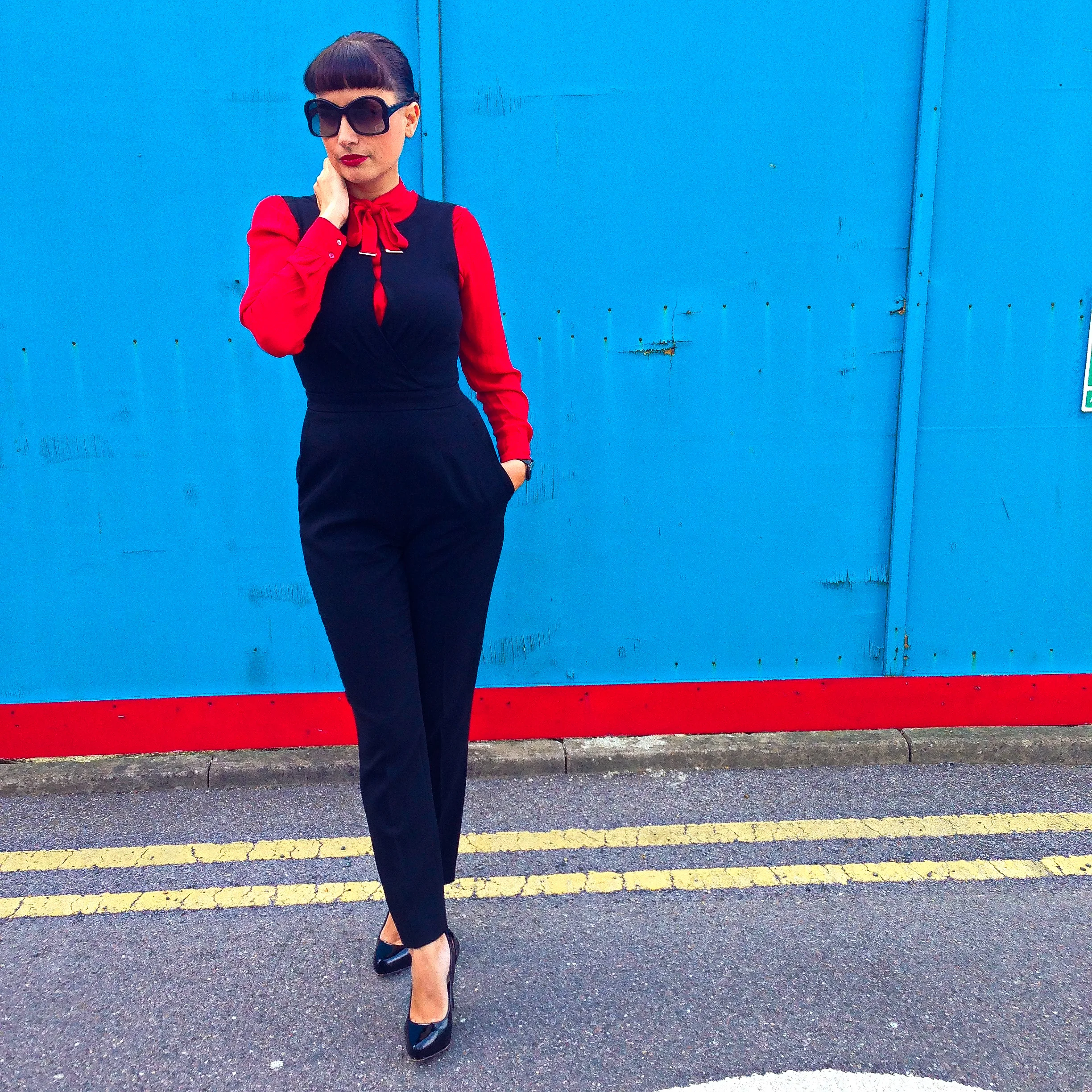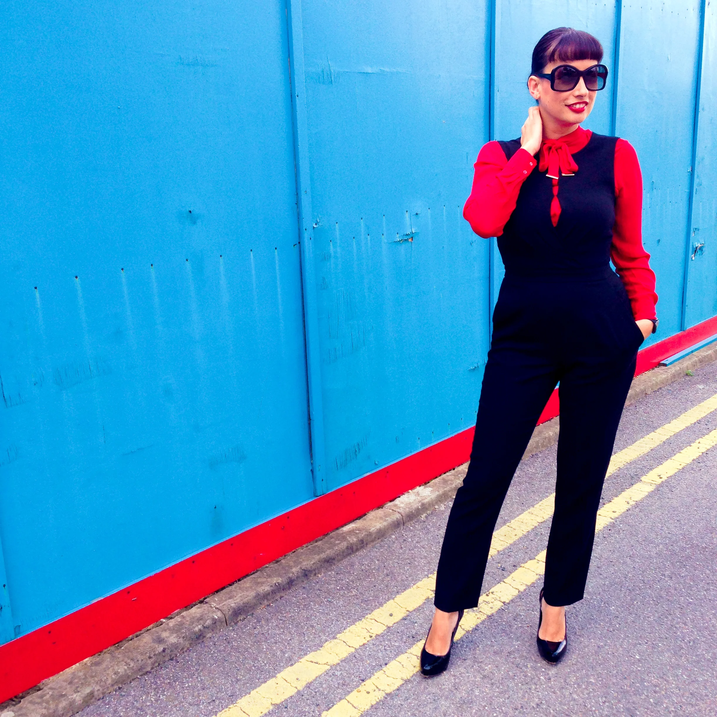 This type of garment is very versatile. It can be worn dressed down or dressed up depending on what you choose to wear with it. For this post I chose to dress it up, adding a red pussy bow blouse and high heels but you can easily dressed it down with a t-shirt underneath and a pair of nice trainers.
