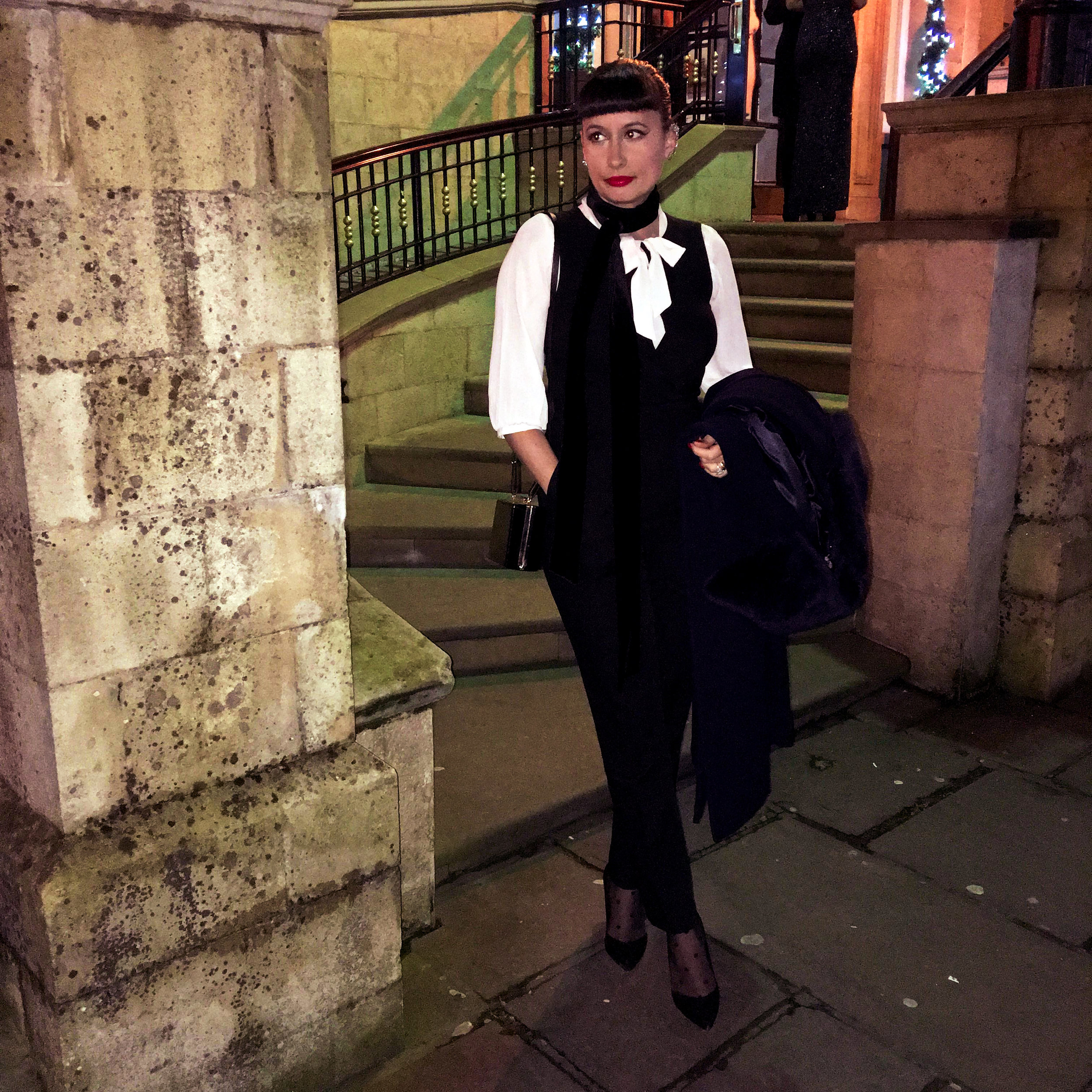 I added my black jumpsuit, as it's easy as well and wore a silk, pale pink, bow blouse underneath.