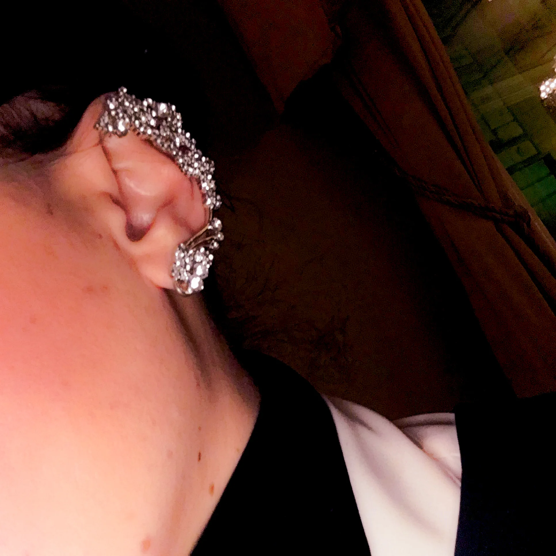 No que toca aos acessorios, escolhi pecas para um look minimal: a minha clutch, cubo, em verniz preto, uma echarpe super longa e fina de veludo preto e a minha "ear cuff" nova. Tambem estou a usar um par de sapatos em suede preto e um par de meias "polka dot".