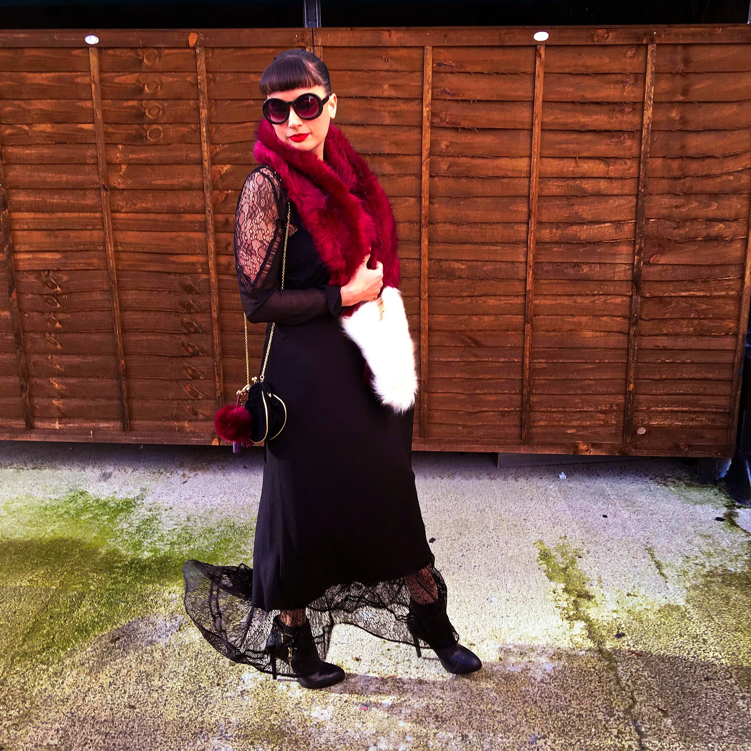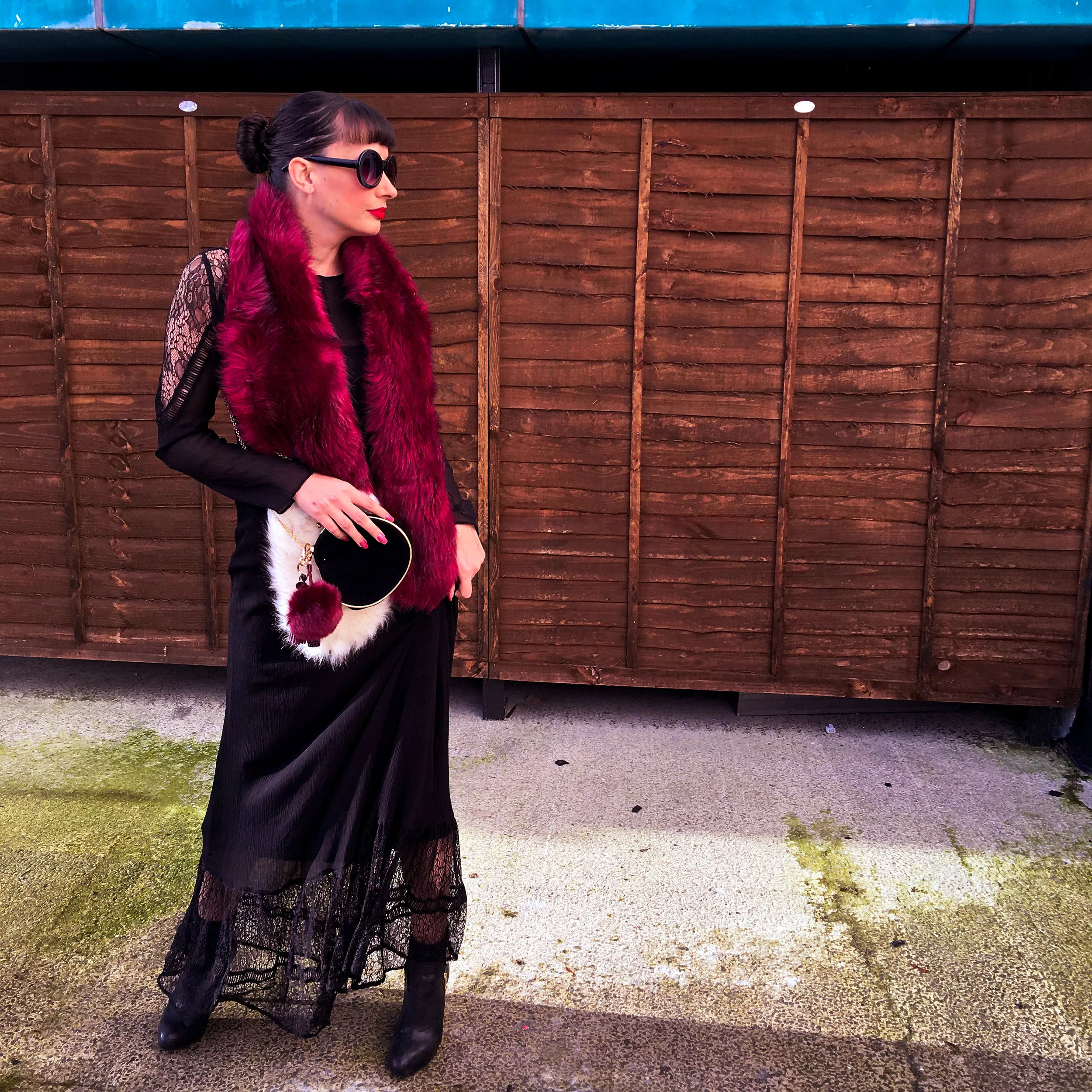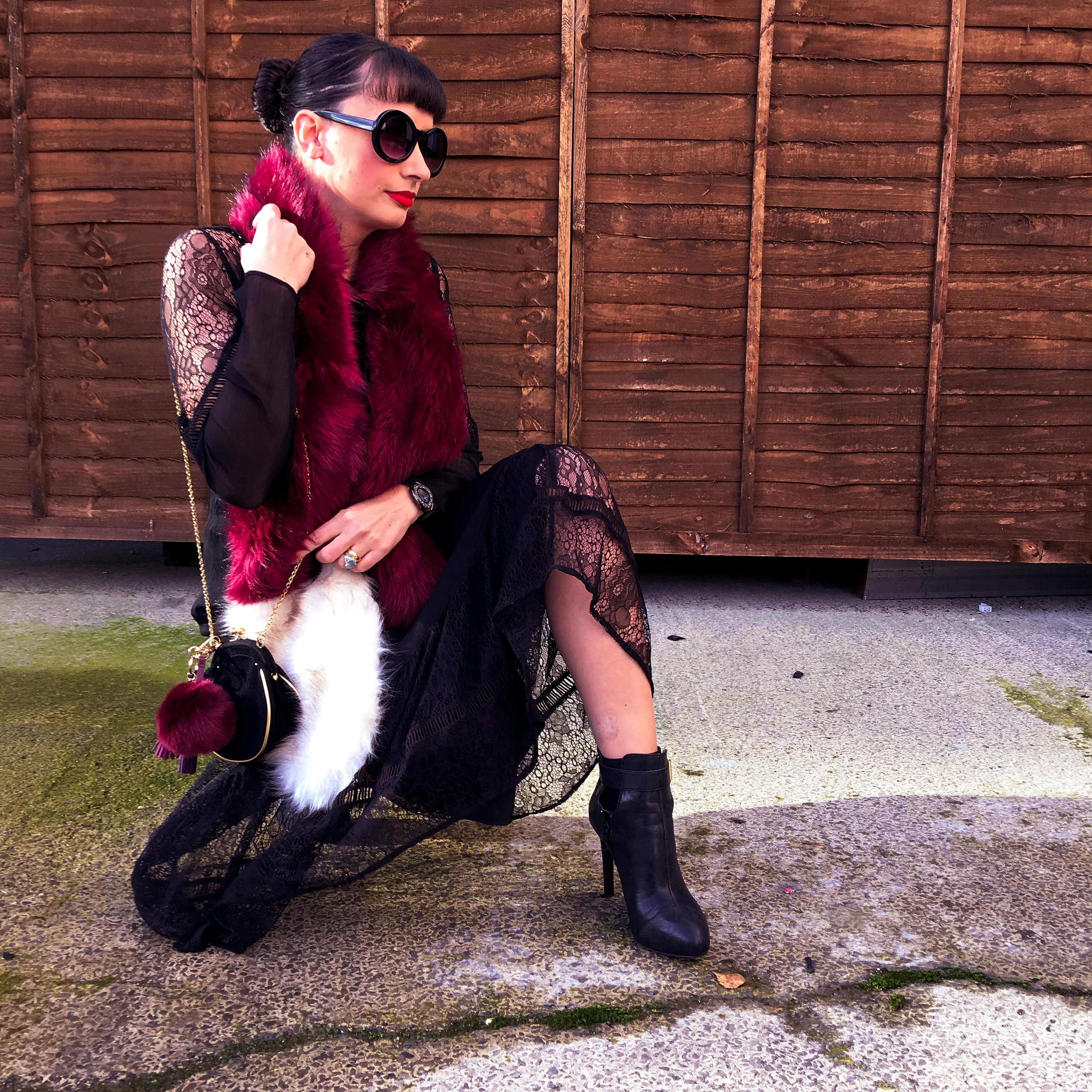 For this look I chose a long hemline black lace dress by Zara and I matched it with a faux fur stole in burgundy and white by "Topshop". For the cold I added my black ankle boots and as for accessories I'm wearing a "twenty's" inspired clutch by Mango with a burgundy pom-pom and purple and pink tassels. As the look was already very busy I only added my round sunnies in a similar colour to the "faux fur" stole.