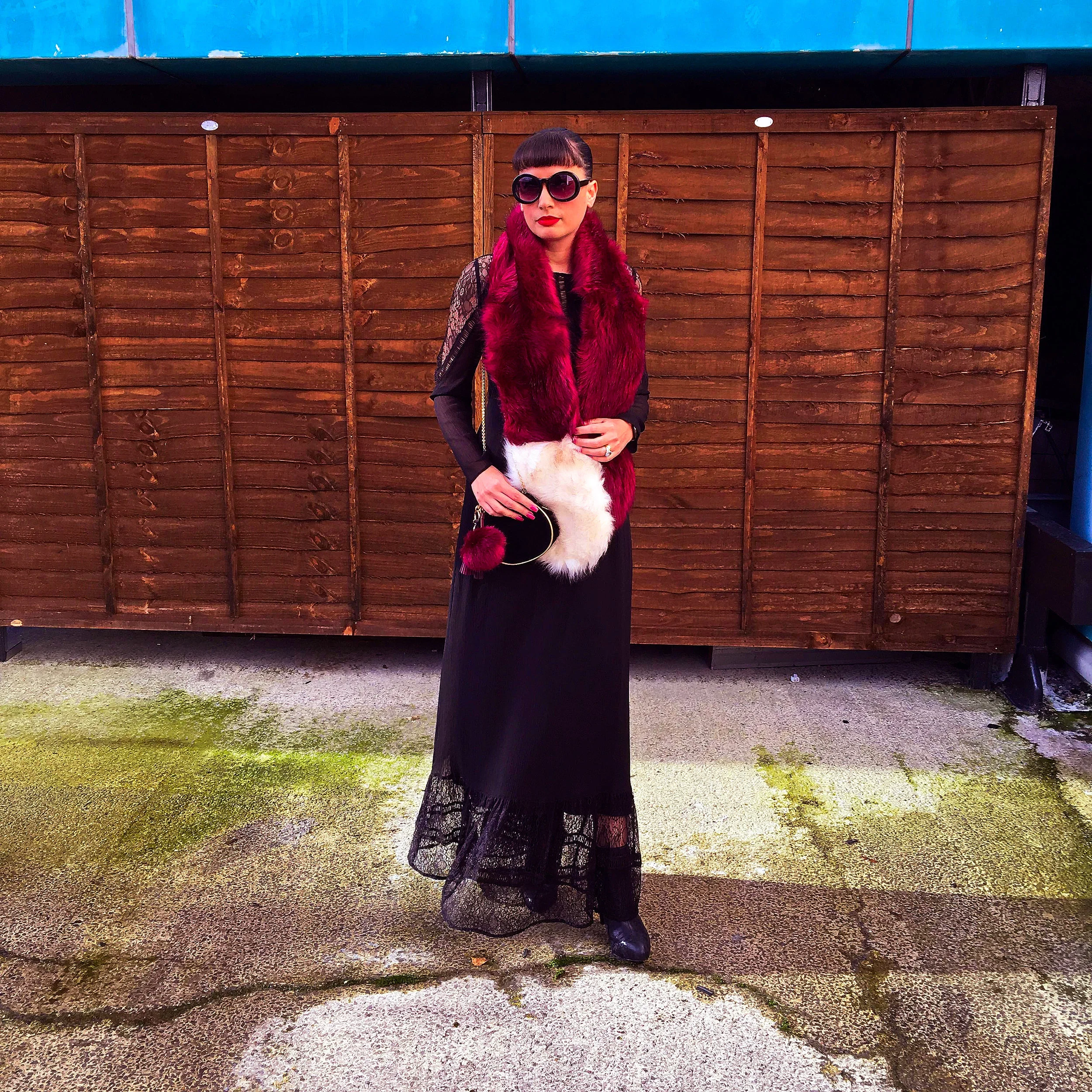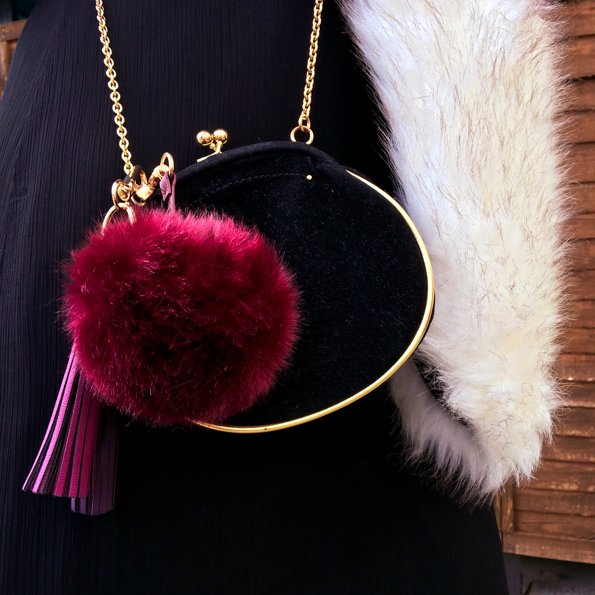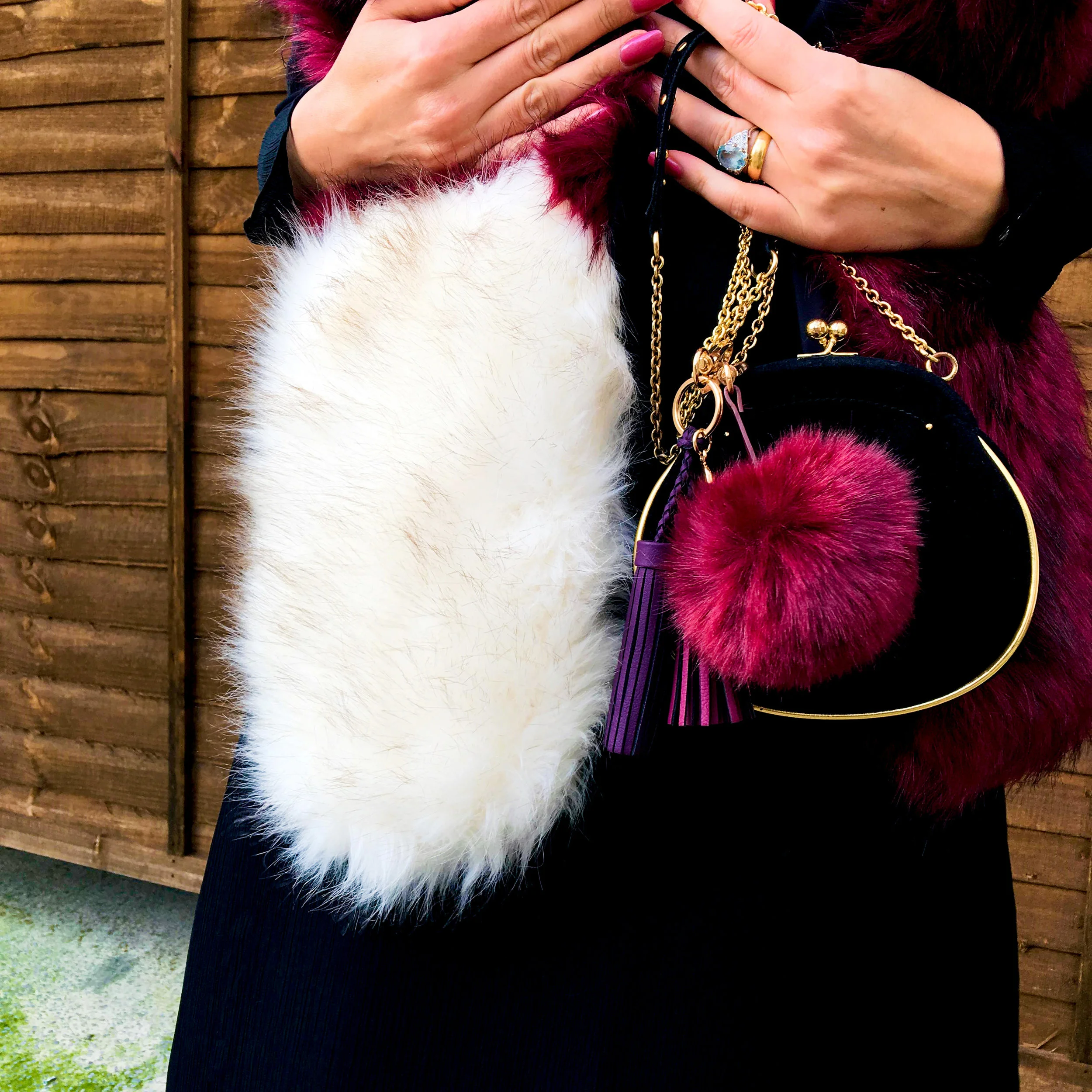 For this look I chose a long hemline black lace dress by Zara and I matched it with a faux fur stole in burgundy and white by "Topshop". For the cold I added my black ankle boots and as for accessories I'm wearing a "twenty's" inspired clutch by Mango with a burgundy pom-pom and purple and pink tassels. As the look was already very busy I only added my round sunnies in a similar colour to the "faux fur" stole.