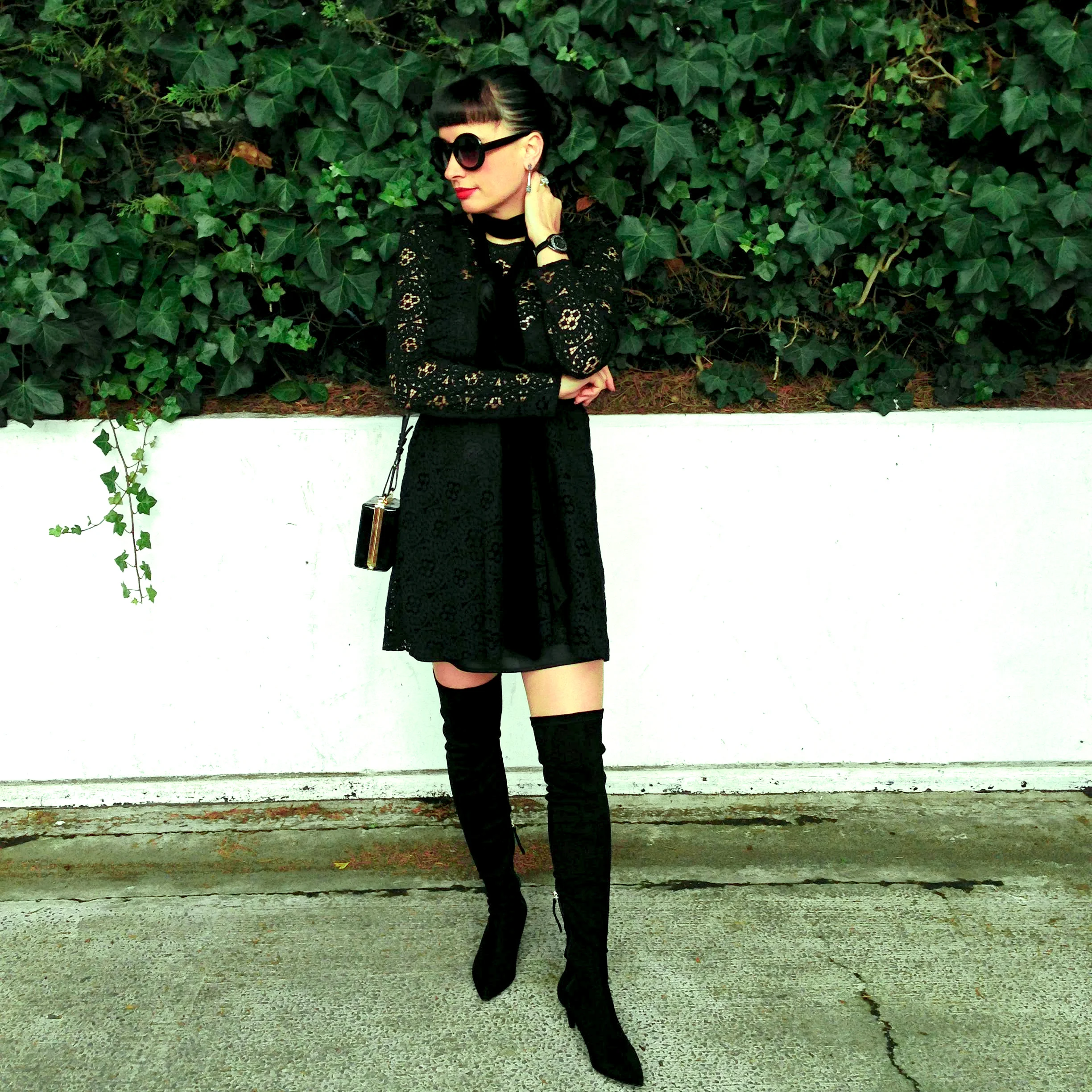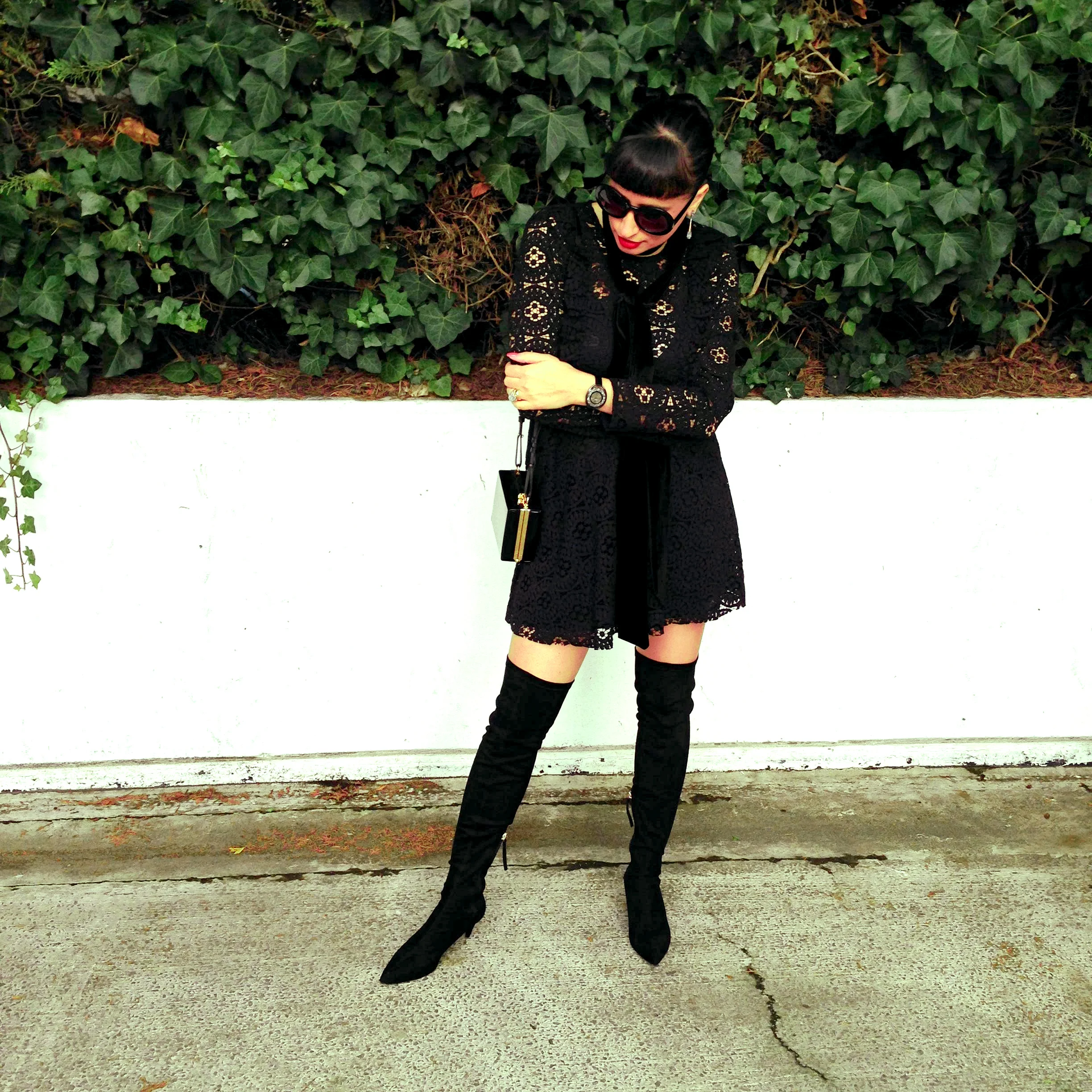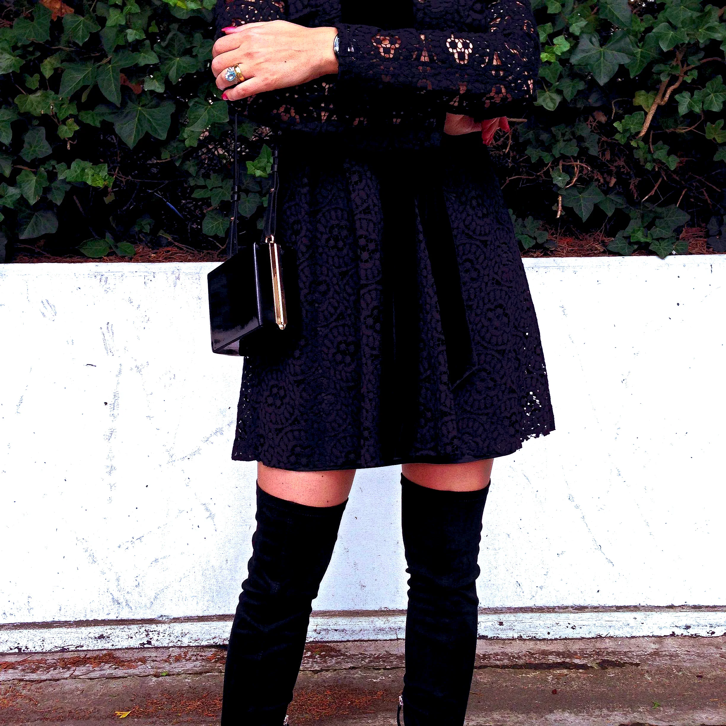 This is a full trend look! The "must" Over The Knee Boots match with the Lace Dress, that brings the Victorian trend up and the Skinny Scarf and Kitten heels that were big trends for this Autumn / Winter. Also the materials are big for this couple of season's: suede, lace and velvet. It's one of my favourite situations: match several trends on the same look... and it works!