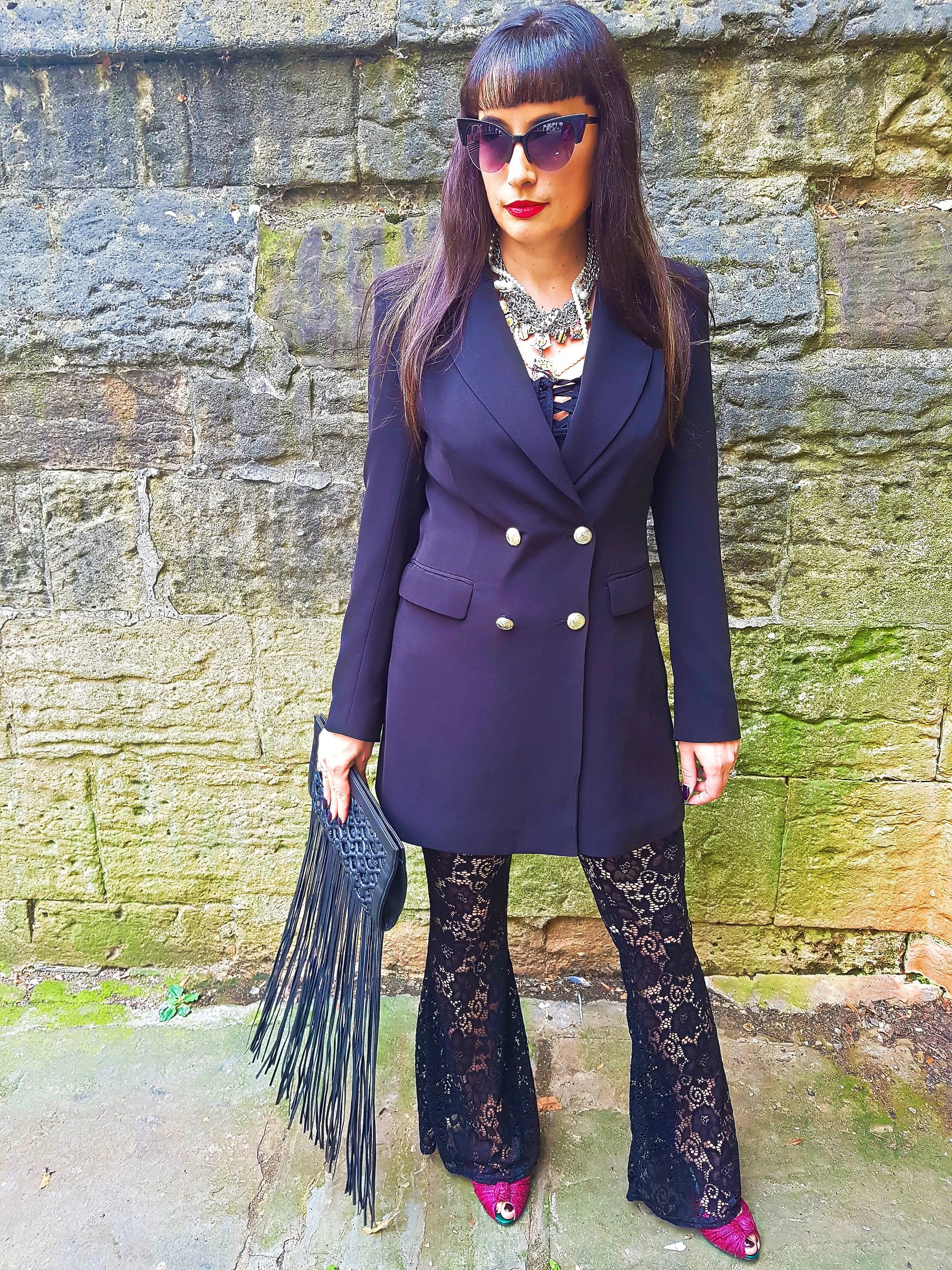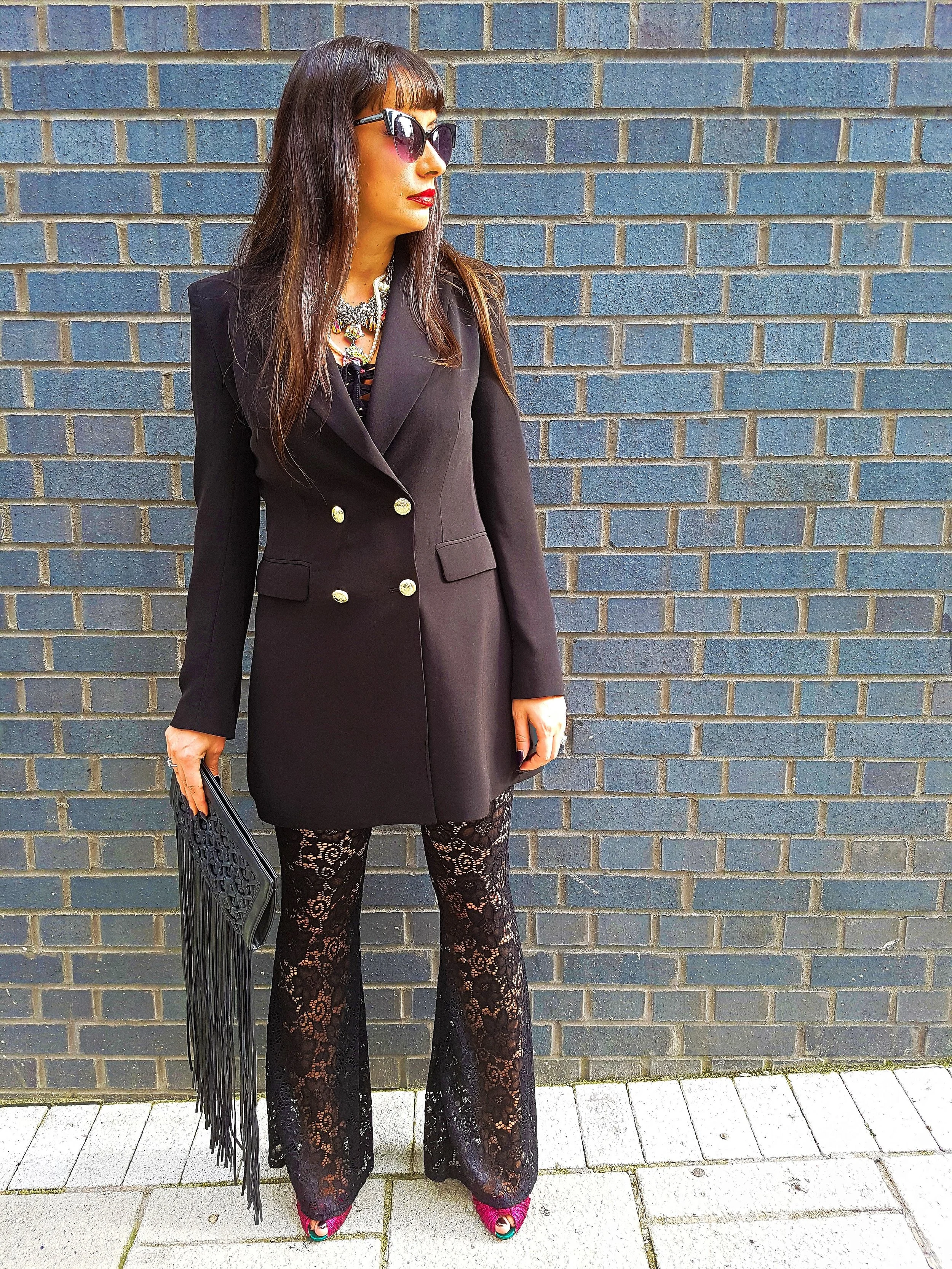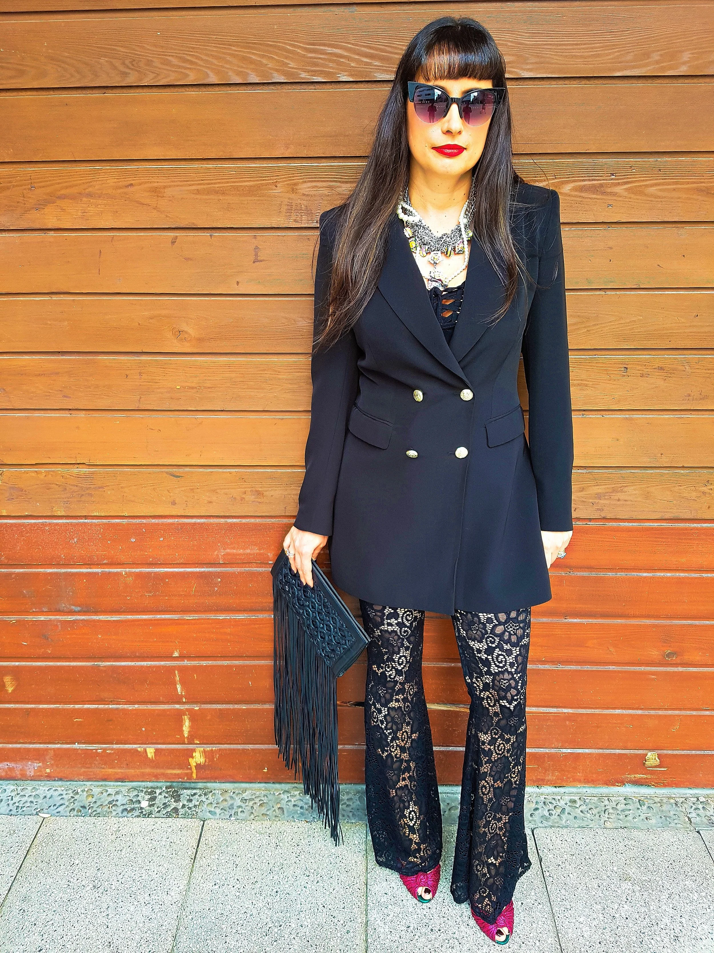 It's a good idea to always balance out standout and edgy pieces like these lace trousers with others with a more classic vibe like this long jacket. It will look chic and edgy at the same time and you can always have fun with the accessories. I've thrown in the pink sandals, statement necklace and clutch for a fun and less uptight look.
