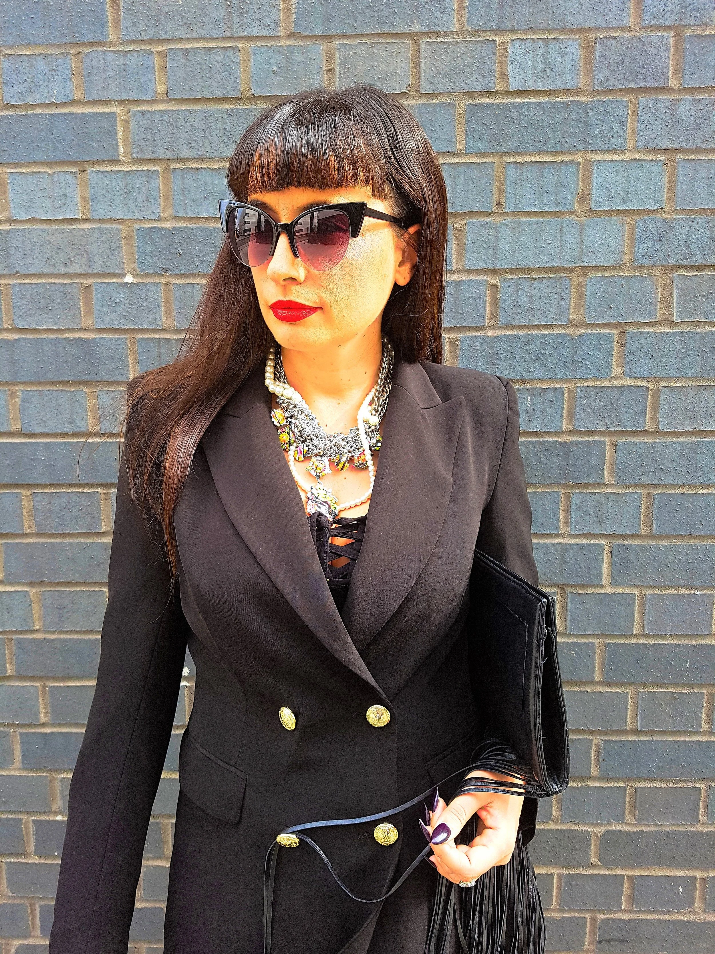I styled them with a long jacket by Zara , (similar here and here), a black bodysuit and vibrant accessories. I'm also wearing a pair of Christian Louboutin shoes (buy similar here and here) or (more affordable here), a fringe leather clutch (similar here and here), Jeepers Peepers sunglasses ( buy them here) or (similar here) and a custom made necklace by Louise & James (buy it here).