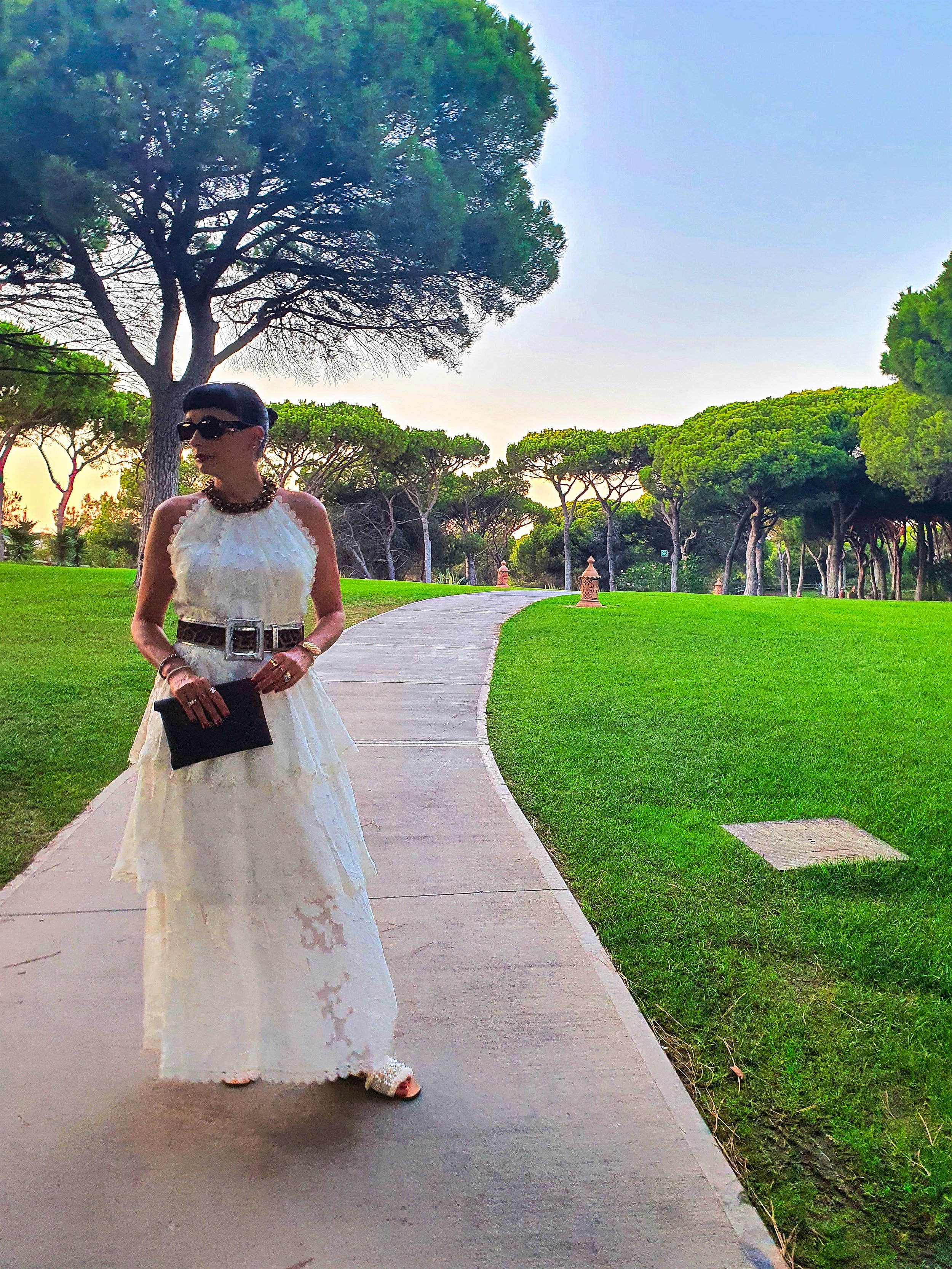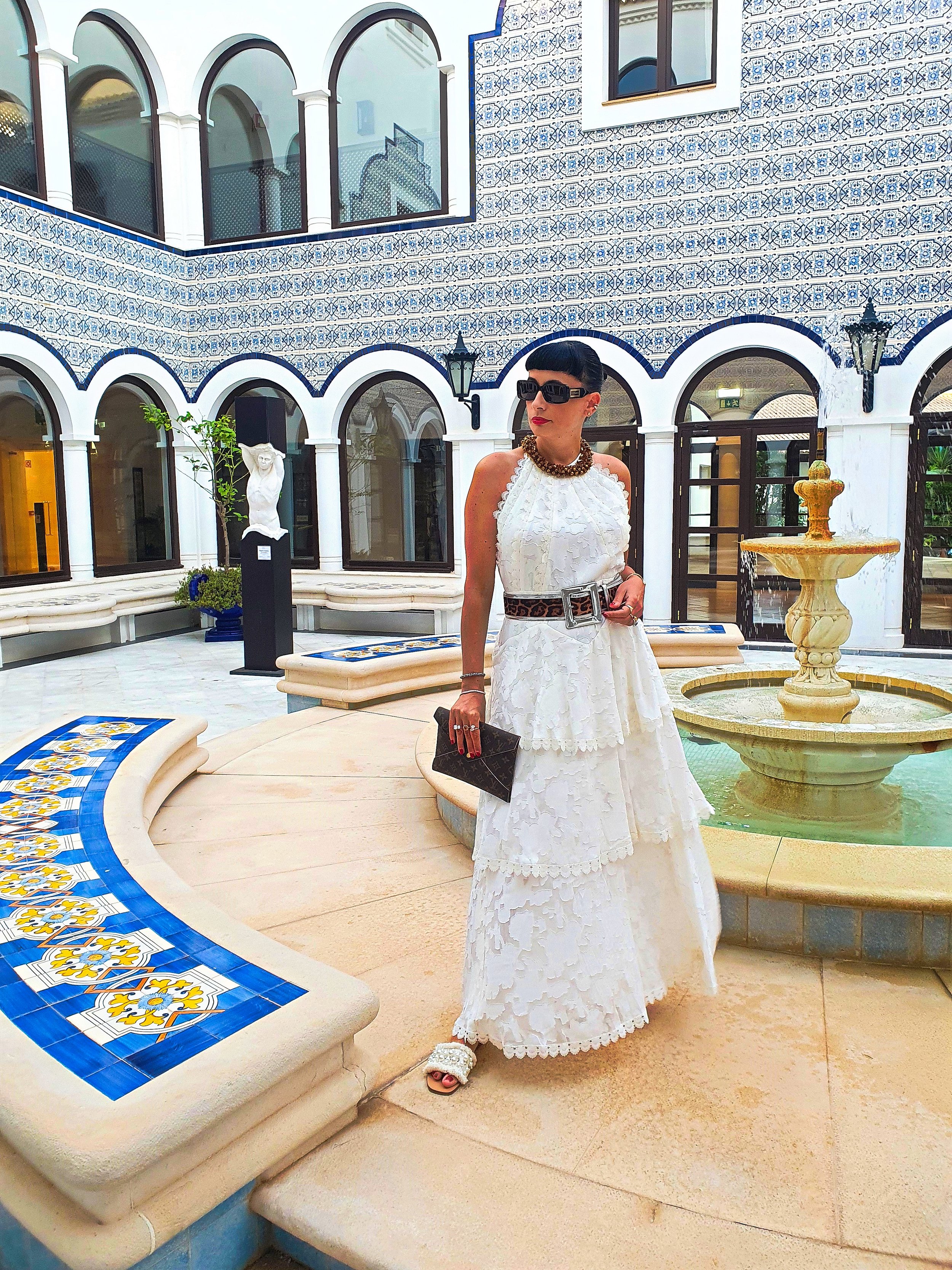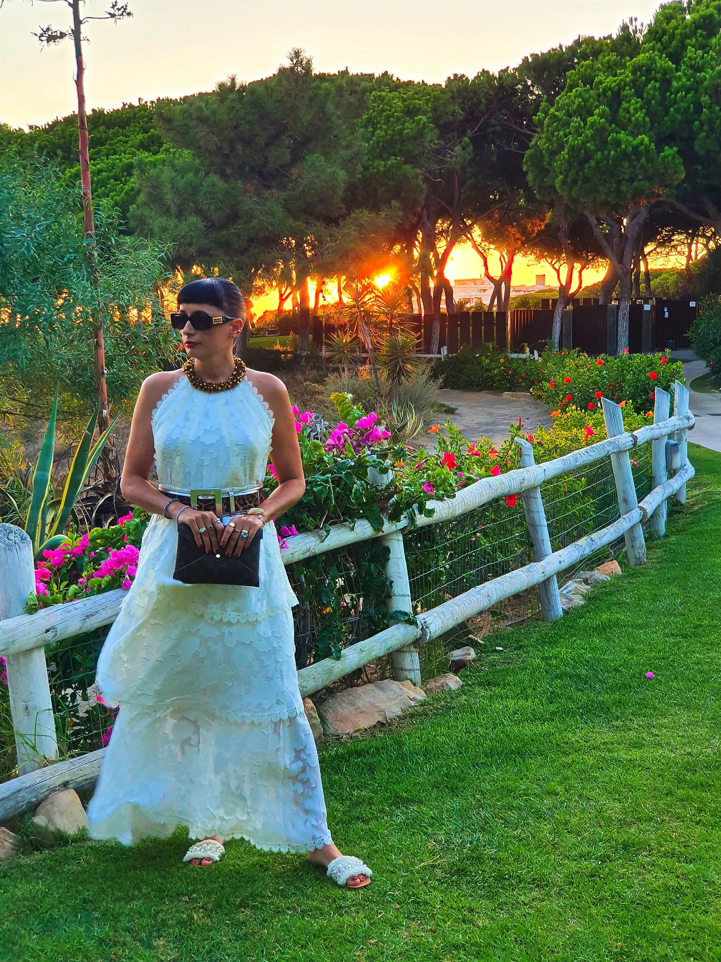 I wore this stunning, off white, maxi dress by THREE FLOOR (sold out but similar here) and I paired it with statement accessories like my new, vintage, DOLCE & GABBANA belt (vintage similar here), my OSCAR DE LA RENTA necklace (sold out but similar here), my ZARA tweed sliders (sold out but similar here), my LOUIS VUITTON KIRIGAMI clutch (here) and my VERSACE sunglasses (here).