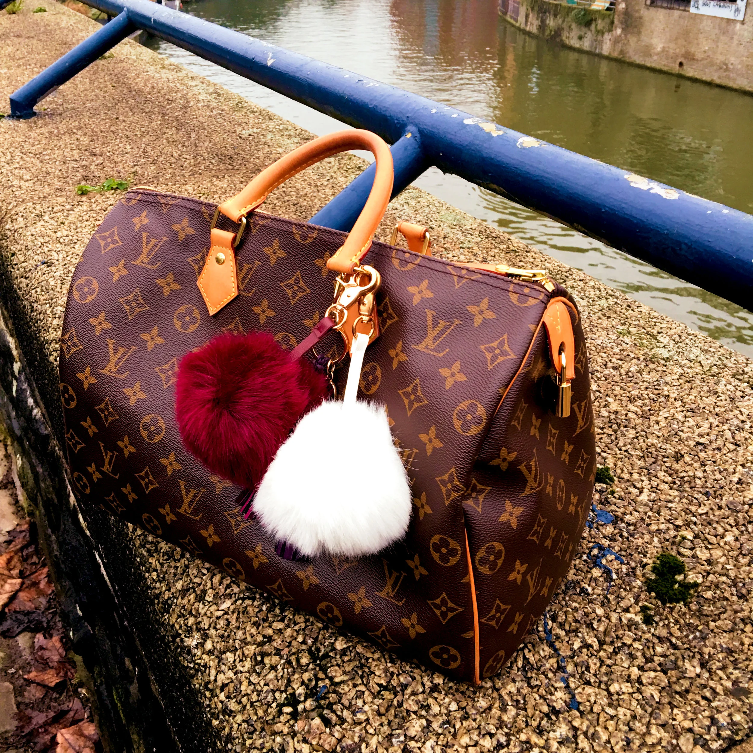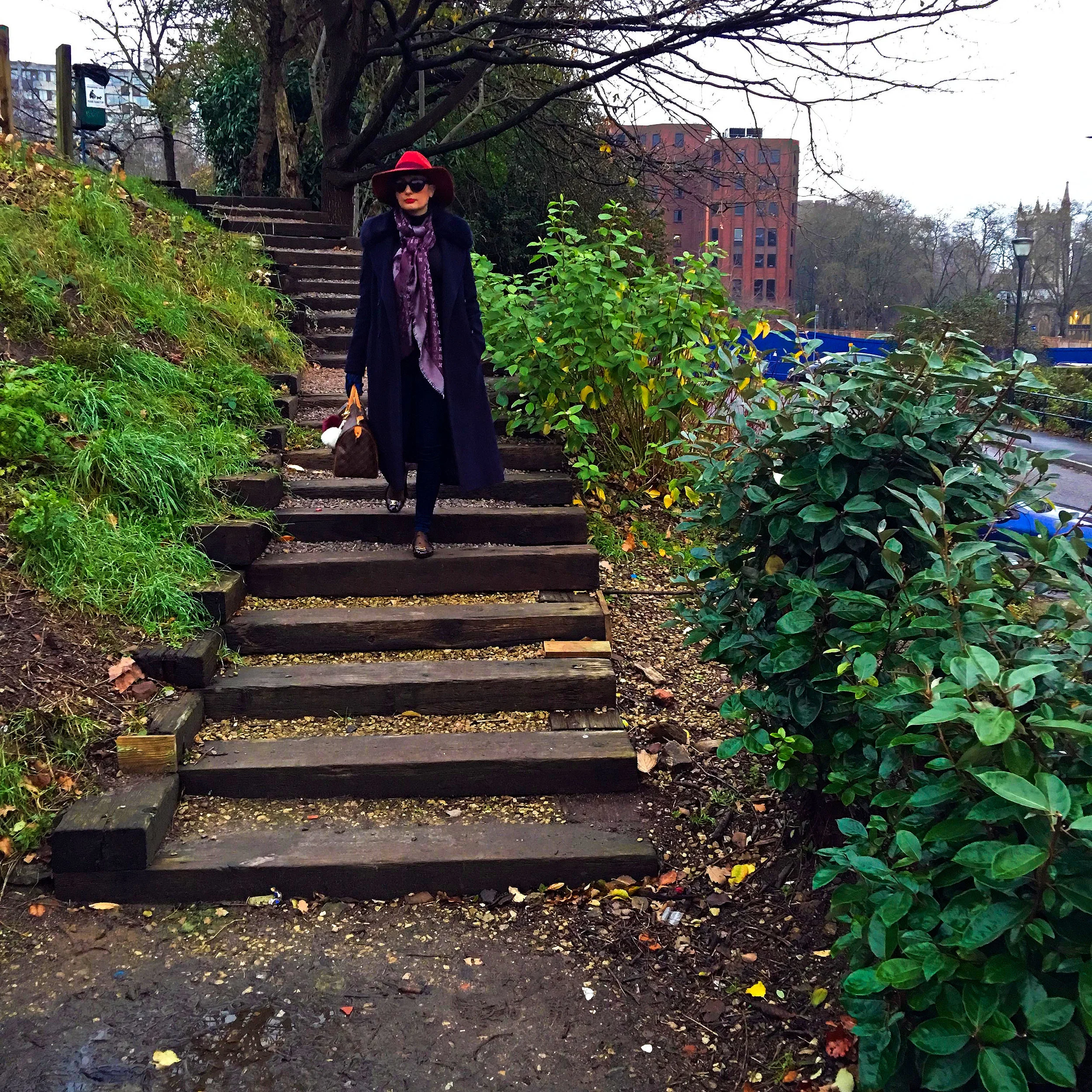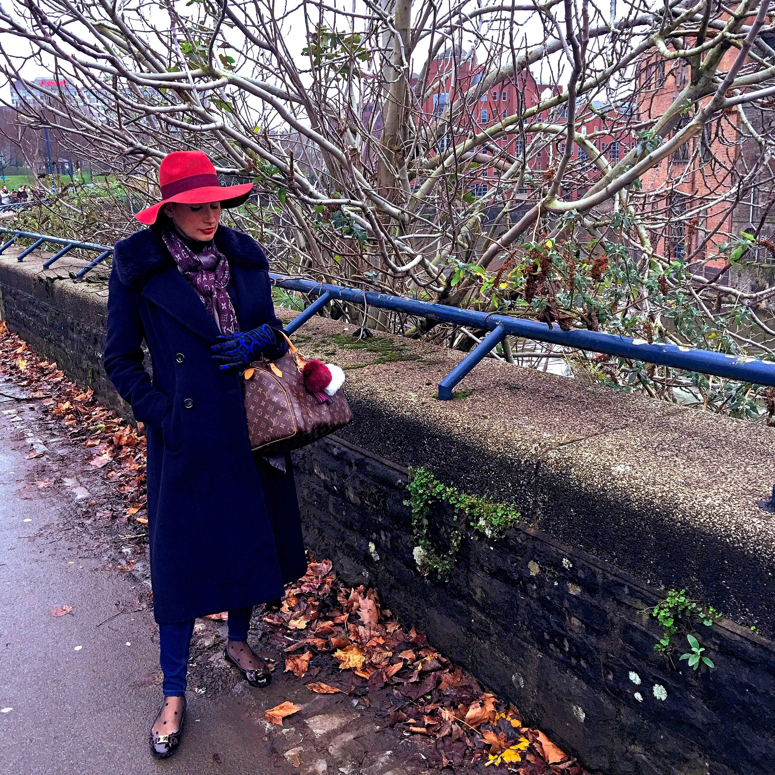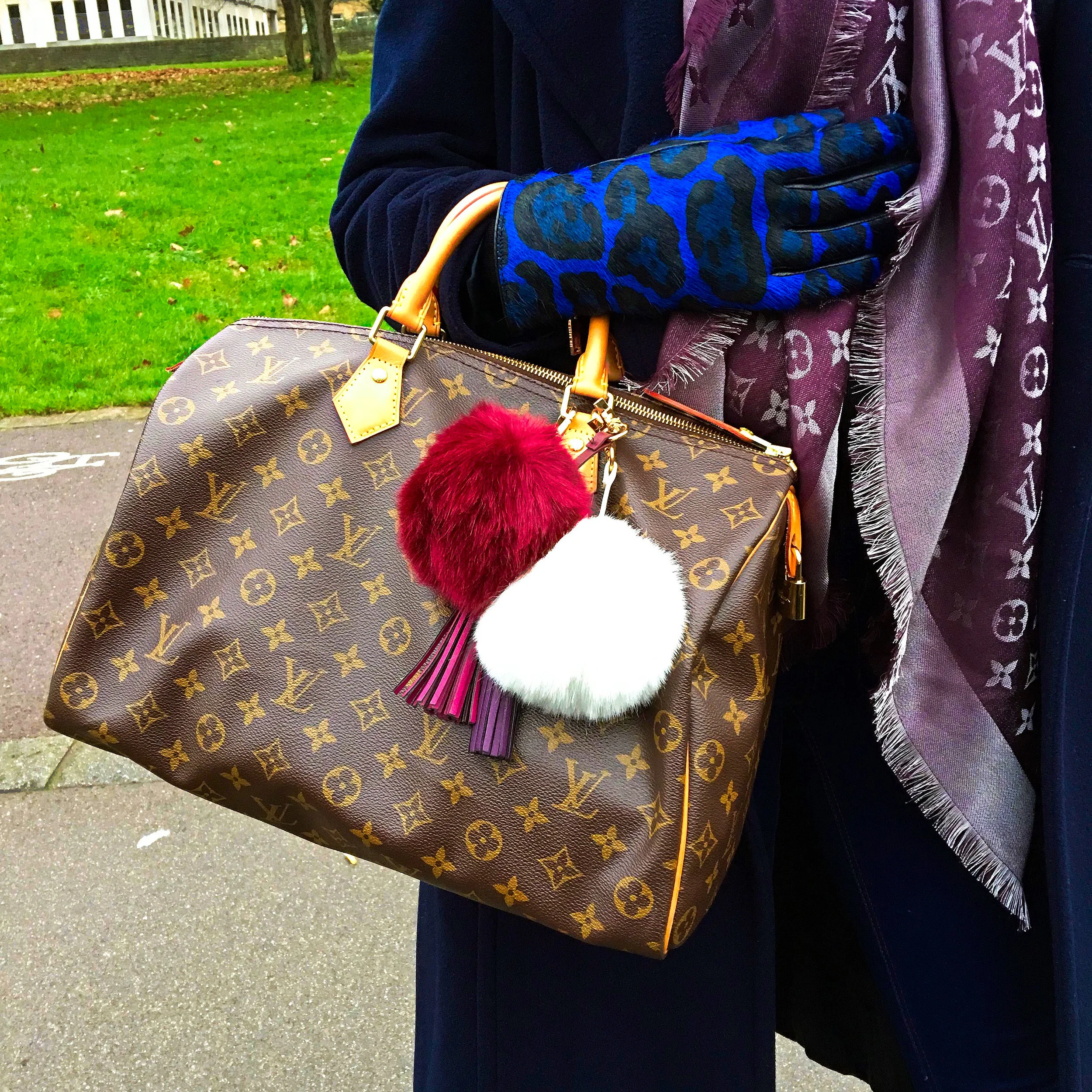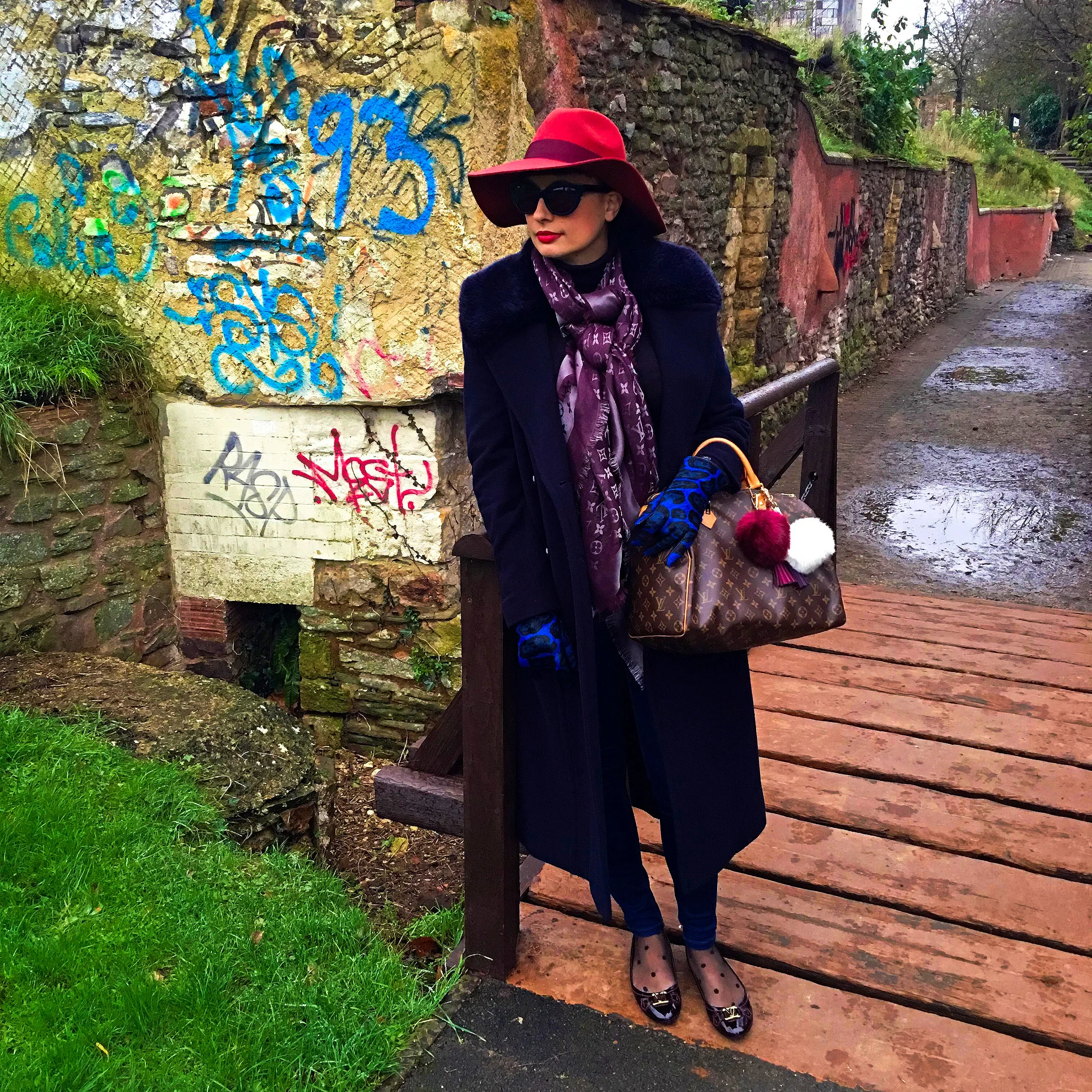 The day itself was very cold, so I wanted to feel warm and comfy (and also stylish!). I am wearing a pair of skinny blue jeans with a dark turtle neck jumper. I threw my long blue overcoat on top and then went for the most impost part, when you're dressing for a cold day: the accessories! Because what you're wearing underneath is not really important just focus on what you have that can be seen. The overcoat is very important, of course, and then the accessories! I'm wearing a floppy dark orange hat with a burgundy band, my Louis Vuitton Speedy bag (that I accessorised with pom poms and tassels), a pair of blue gloves in pony hair, my purple pashmina also by Louis Vuitton and a pair of burgundy ballerinas with polka dot stockings.