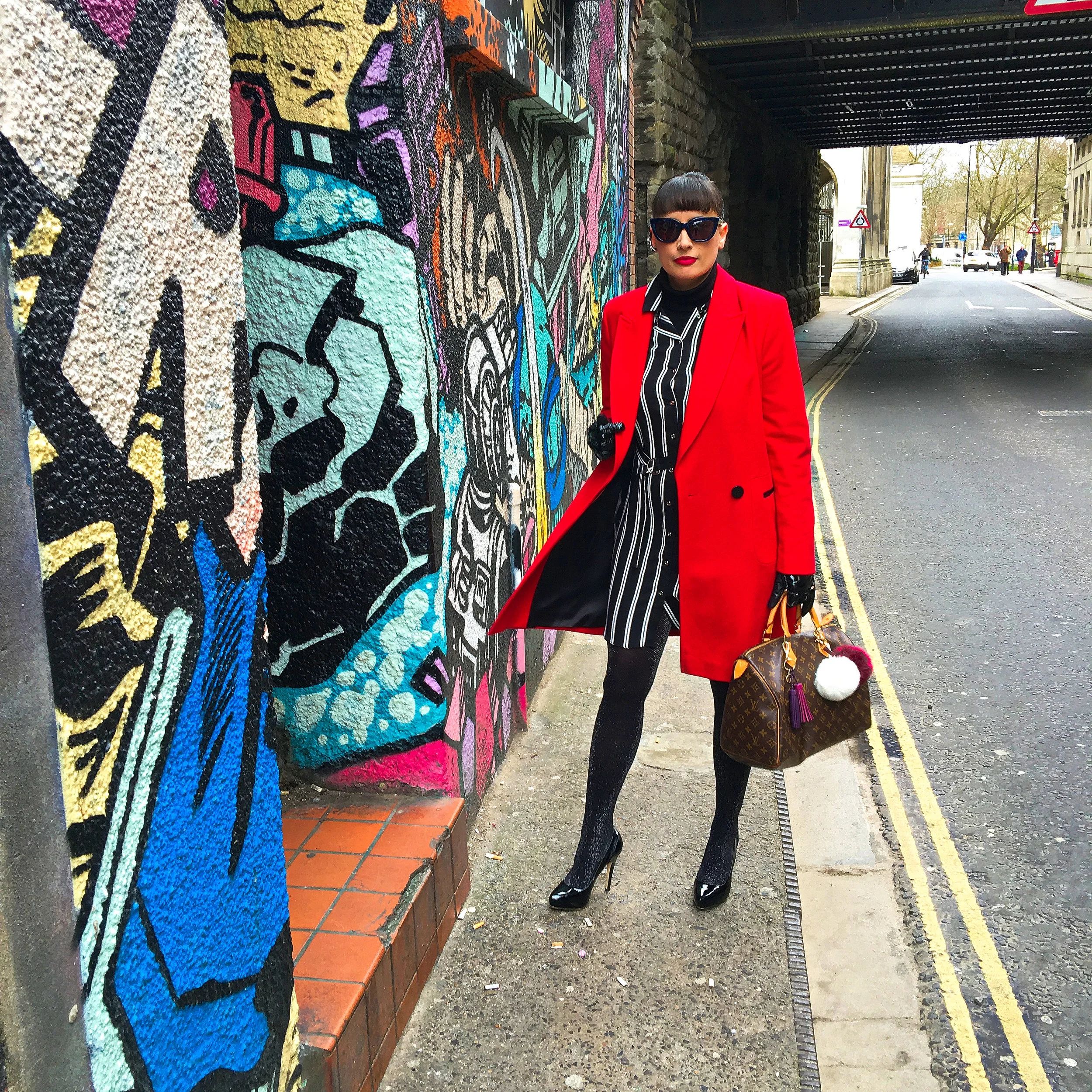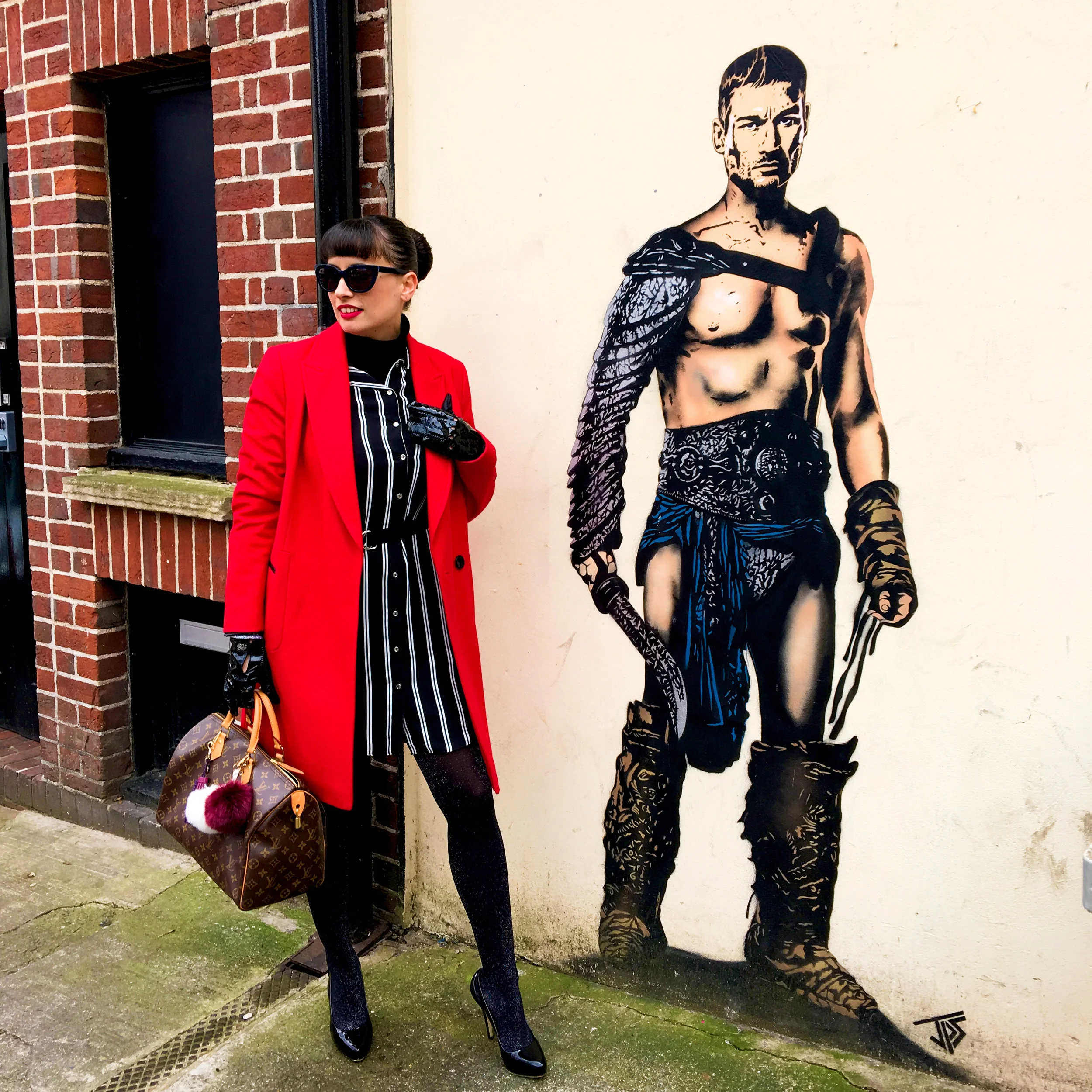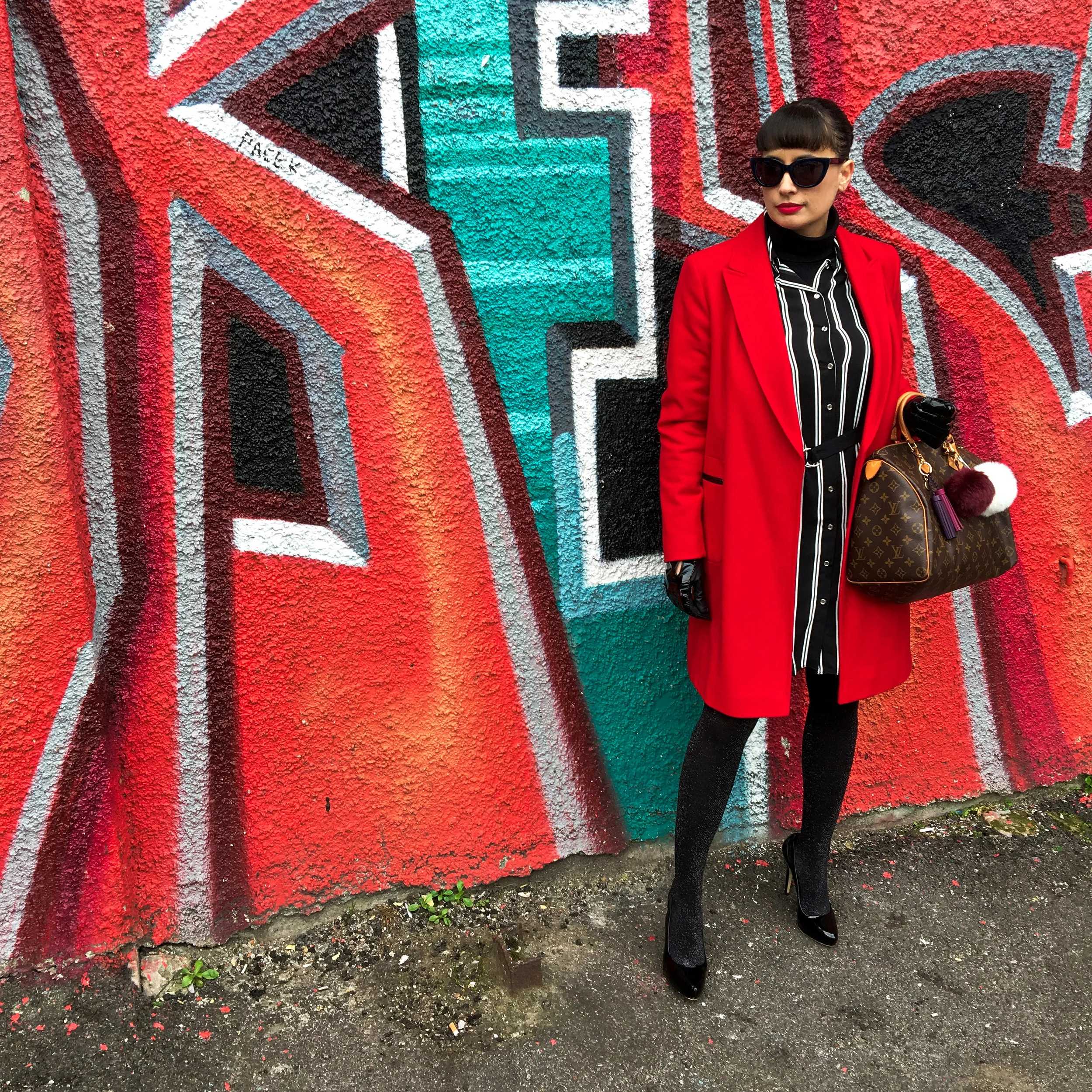 For this walk around the city I decided on wearing something light with a coat just in case. I'm wearing a fun, striped, black and white shirt dress with a belt and I added a red coat on top. I'm also wearing a black turtleneck sweater underneath for the cold and sparkly dark grey thighs.