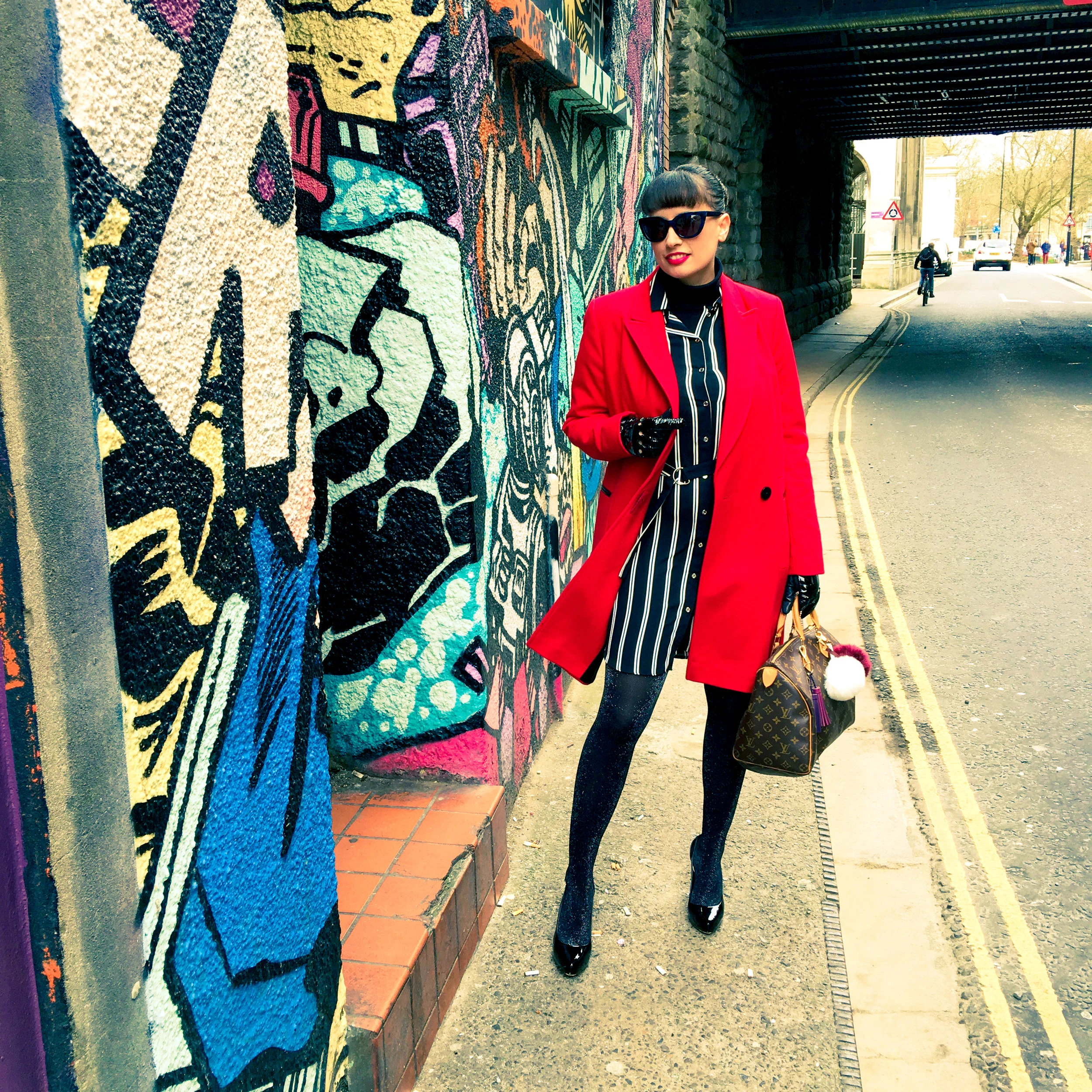 Para este passeio pela cidade, decidi usar algo leve com um casaco por cima so no caso de estar frio. Estou a usar um vestido-camisa, divertido, de riscas pretas e brancas com cinto e juntei um casaco vermelho por cima. Tambem estou a usar uma camisola de gola alta por baixo do vestido e umas meias brilhantes em cinza escuro.