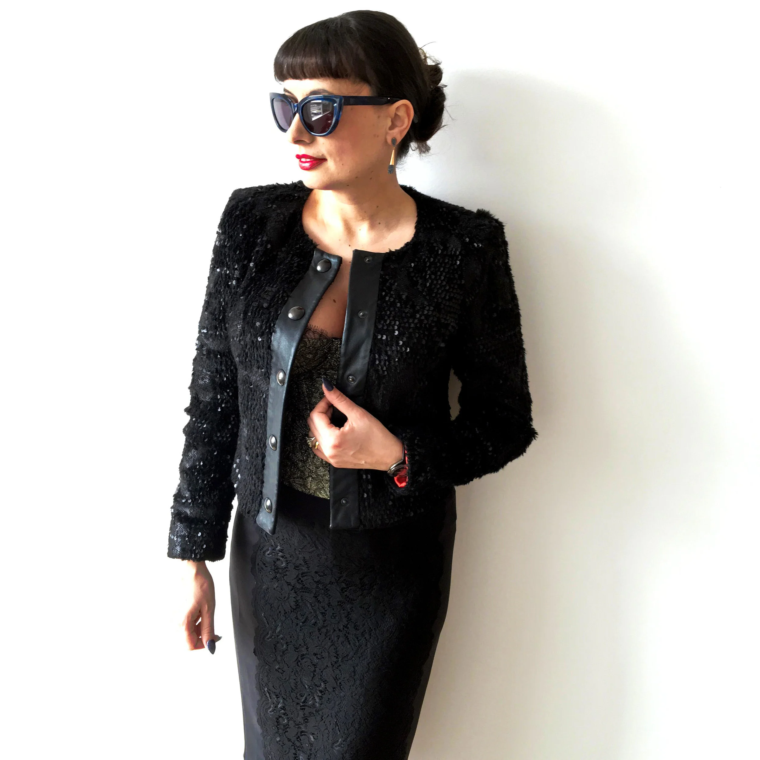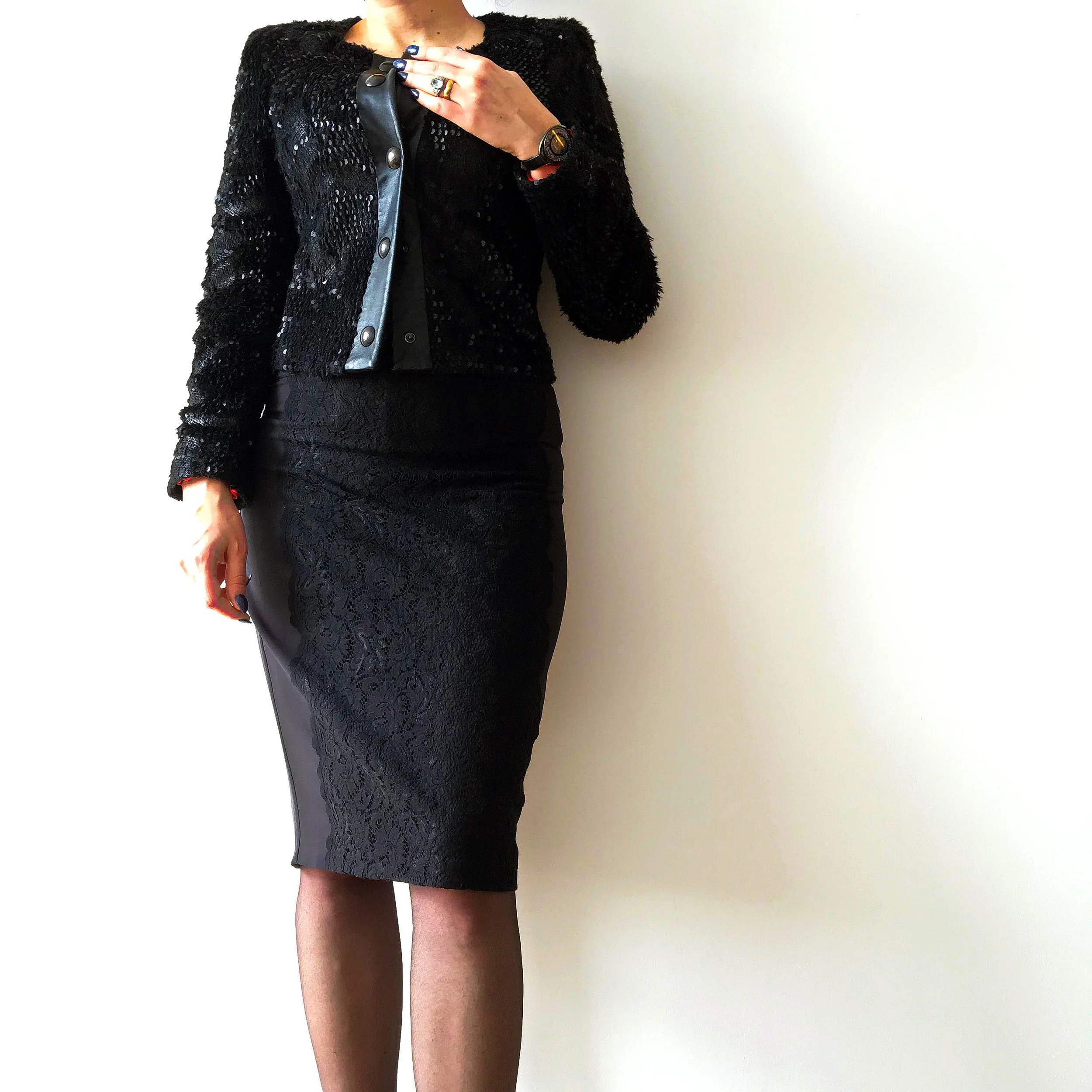 This beautiful corset works perfectly with the sequined jacket and pencil skirt, however I could wear it under a see-through silk blouse with a few open buttons and a pair of wide legged trousers.... The way you wear your intimate pieces is very important! Of course they need to be seen for the trend to work, however you don't need to go overboard: just let a little bit to the eye and the rest to the imagination... It is also important that the pieces you want to showcase are in perfect state and well taken care of.