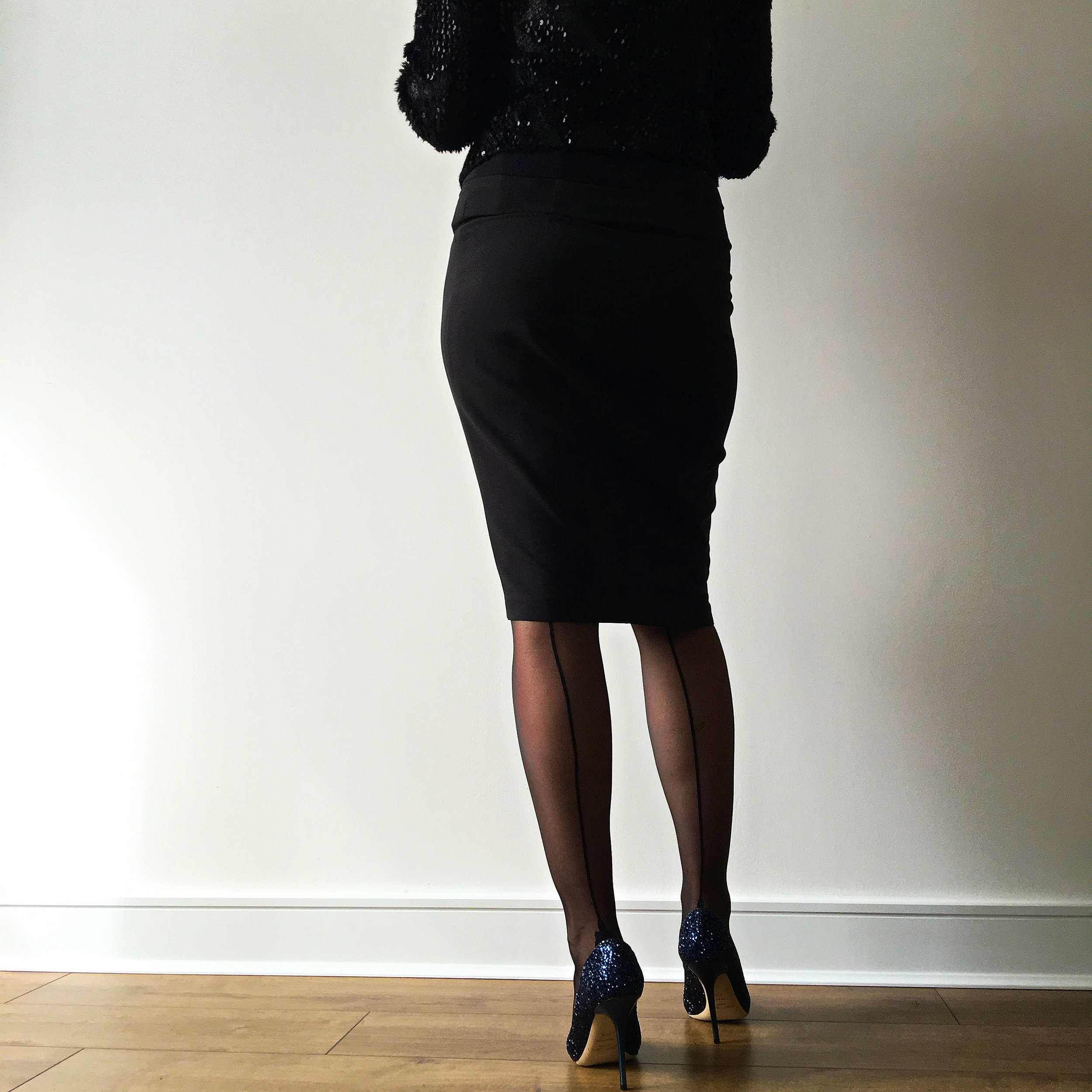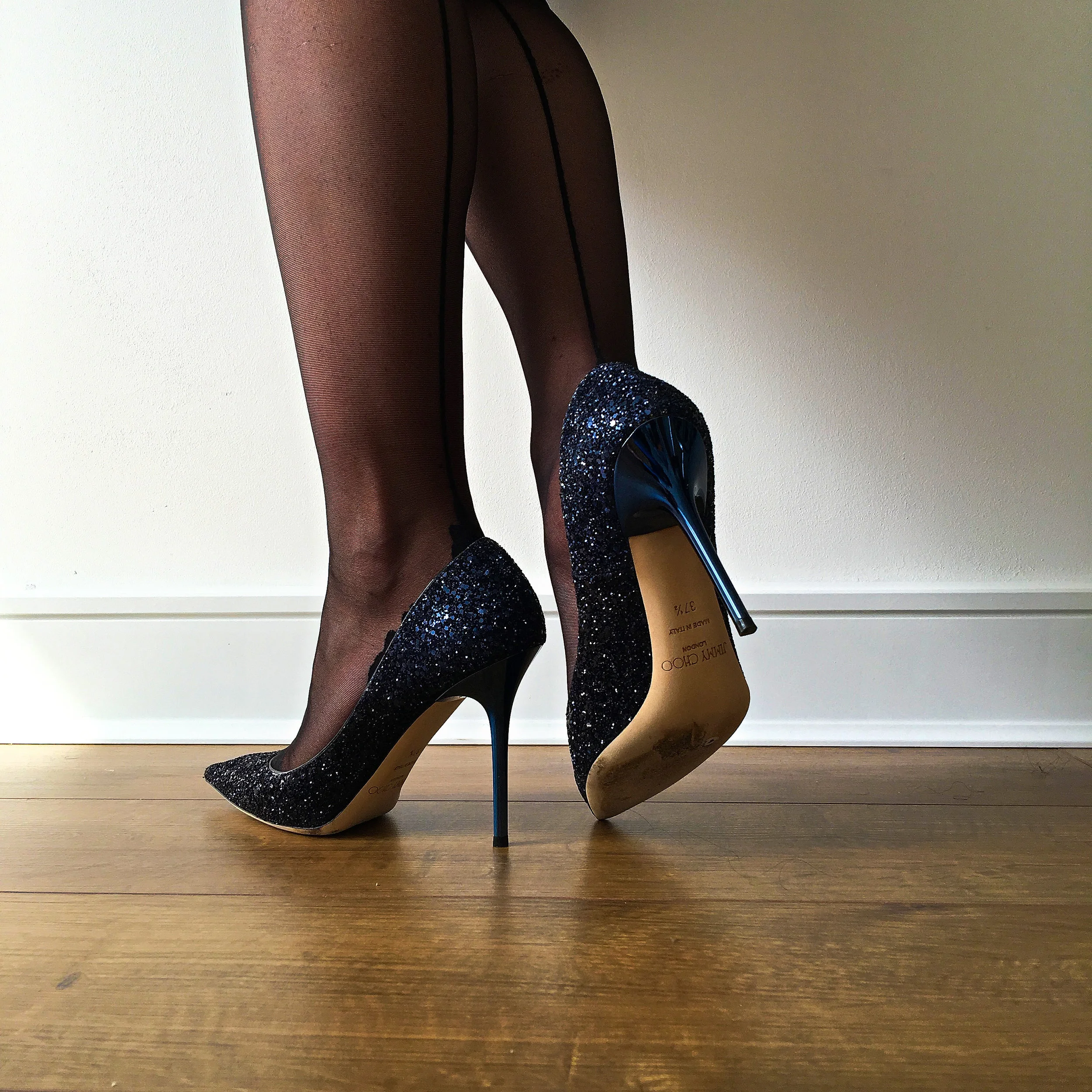 Of course this look is for a special event and that's why I choose this beautiful lace corset: a romantic, sexy and baroque piece! I also chose the sequinned jacket and the lace pencil skirt to match the same feeling of luxury and special occasion. The black lace pencil skirt matches perfectly with the seamed, nearly black stockings and both give this look a feeling of the " twenties" woman. The glitter, blue Jimmy Choo's match with all the shine and sparkle of this look bringing, also, a little bit of colour.