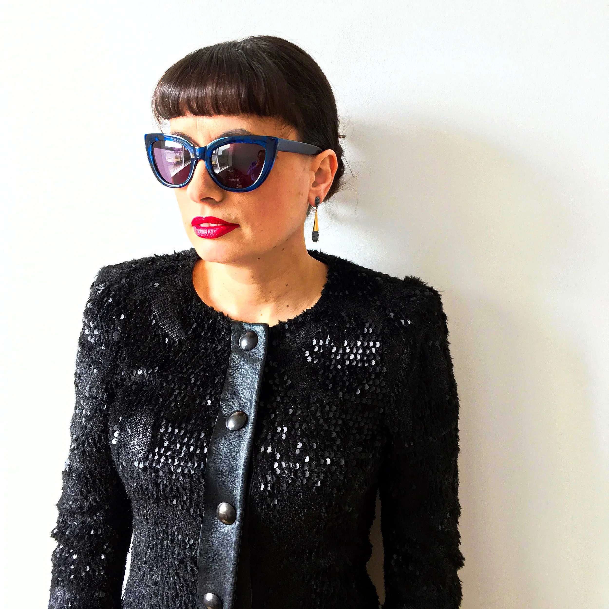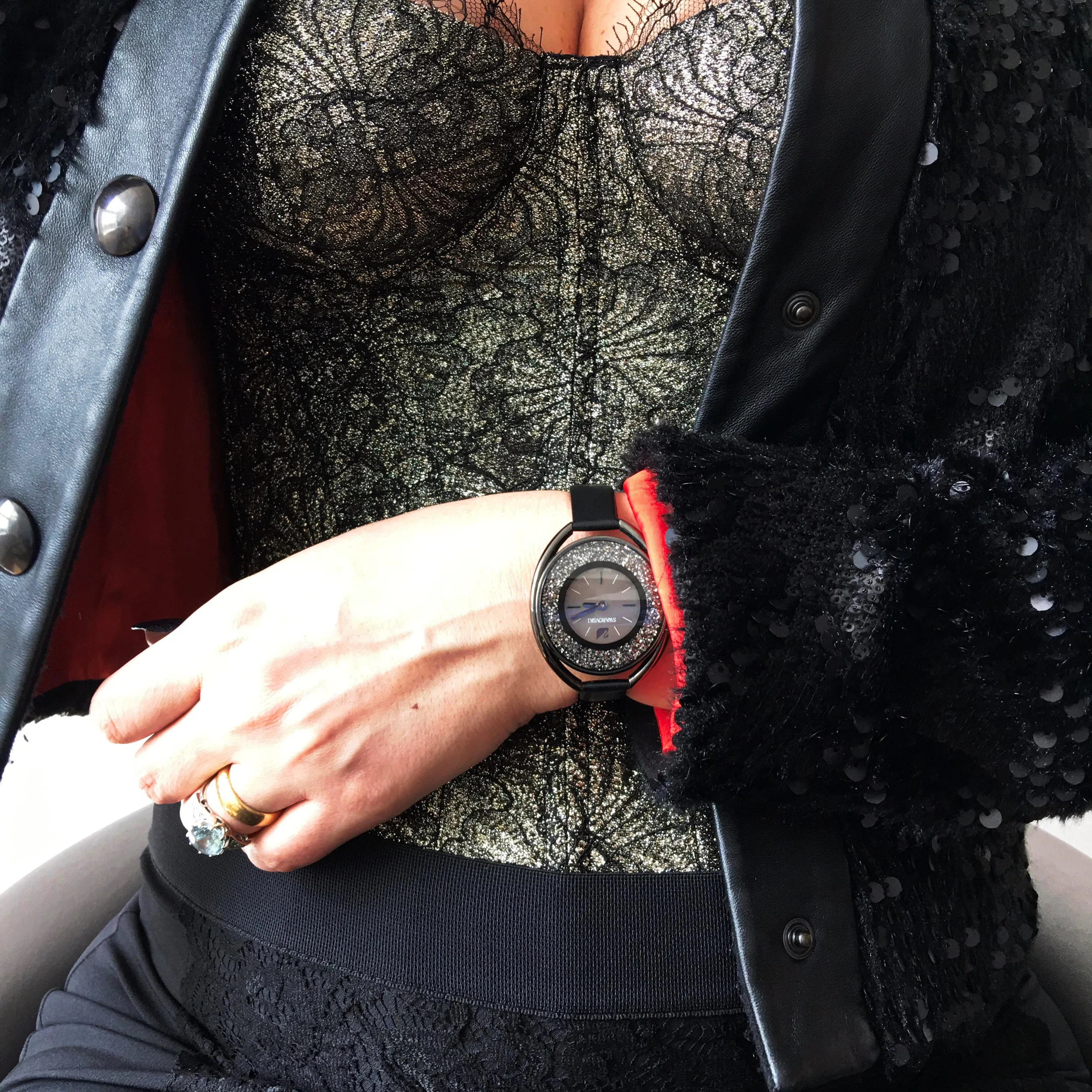 For this post, I decided on wearing my beautiful "L'Agent Provocateur" lace corset under a black sequined jacket and I added a black, lace, pencil skirt. I'm also wearing a pair of seamed, nearly black, stockings and my blue glitter Jimmy Choo's. For the accessories I chose my Swarovski black watch, my Uterque blue sunglasses and a pair of tear-drop earrings also by Swarovski.