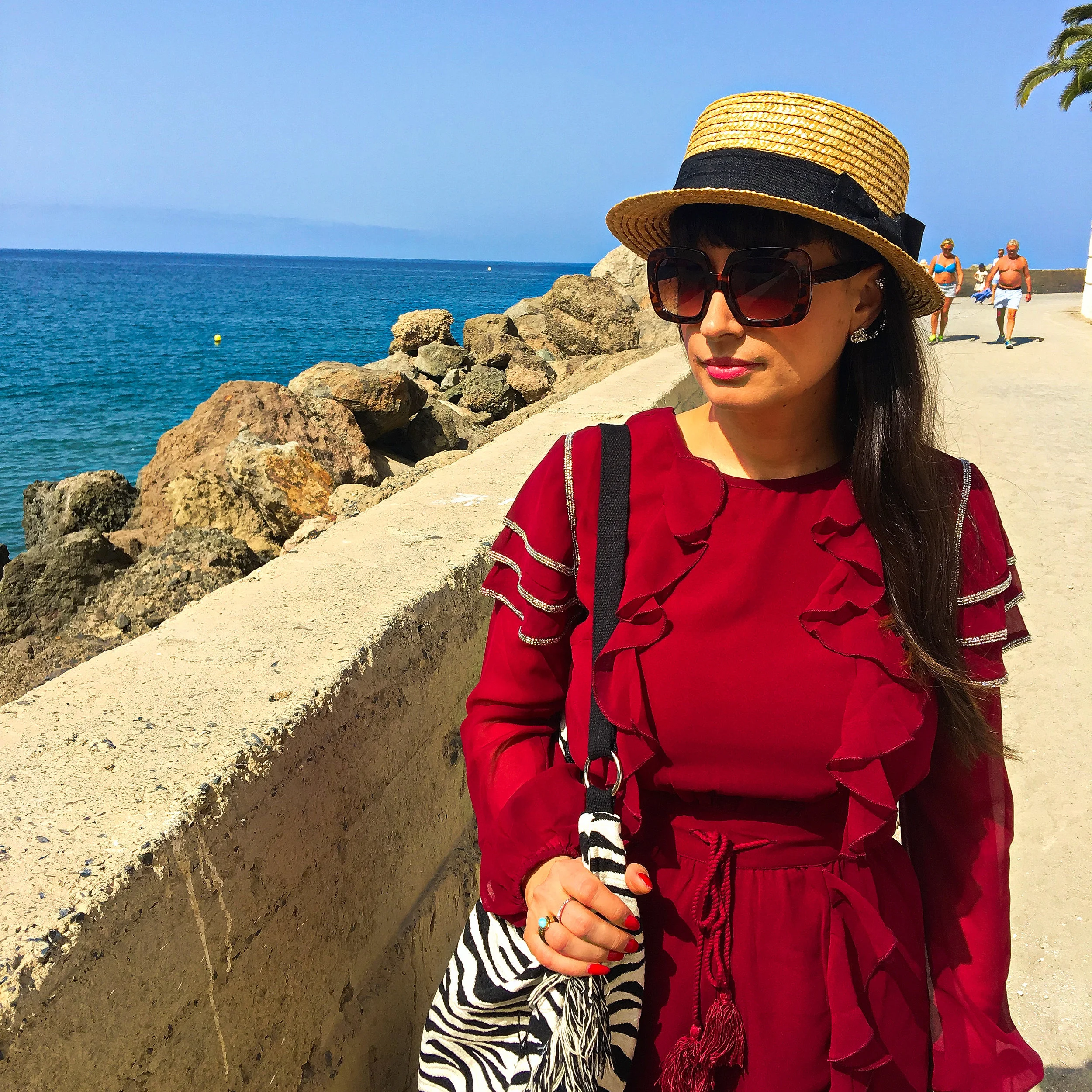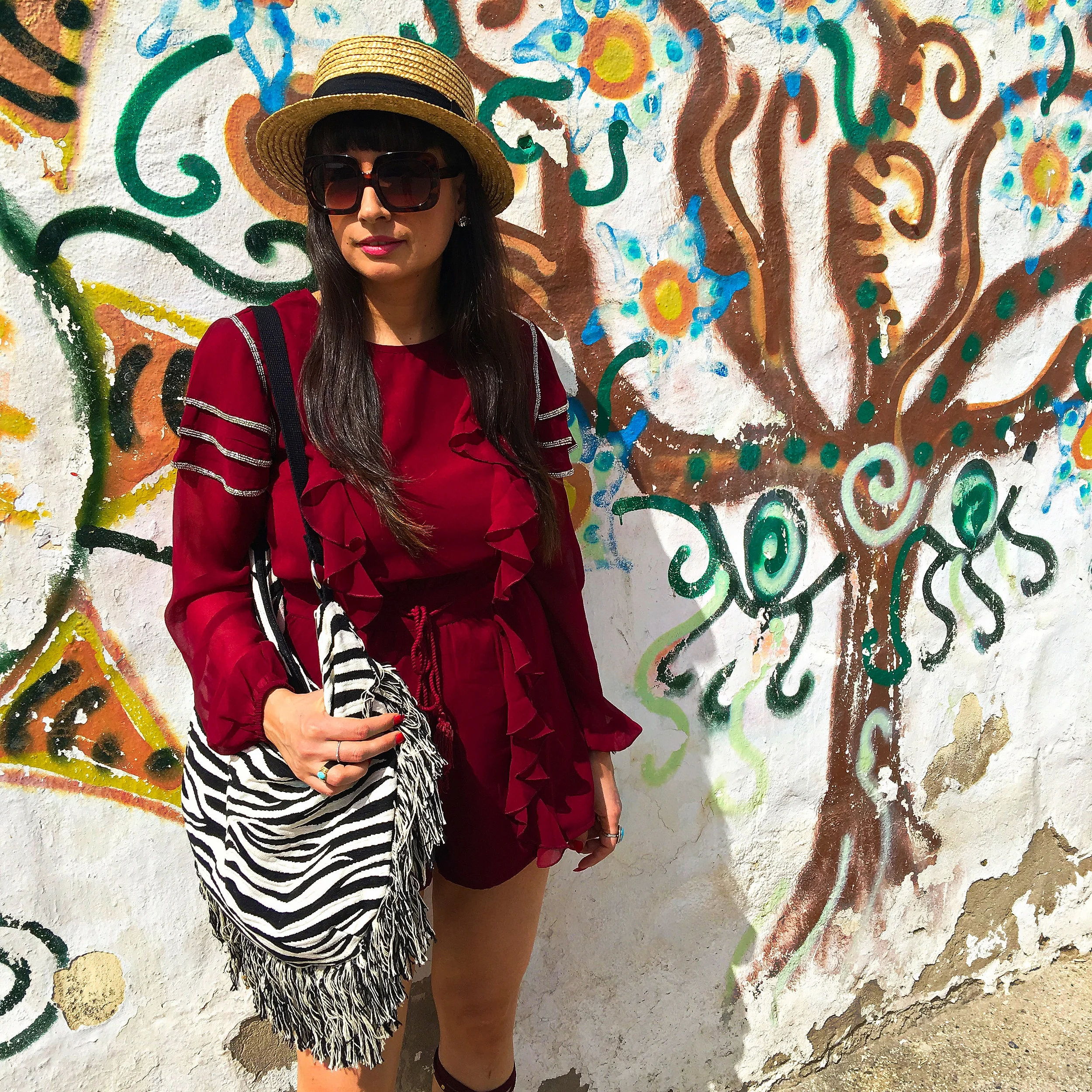 For the first day we decided on going around and sightseeing the beautiful area of the beaches and mountain. I wore a burgundy romper with silver appliques on the shoulders and matched it with my suede burgundy gladiators. I'm also wearing a fringed black and white bag and a hat to protect me from the heat. I accessorised with my brown sunnies, several rings and an ear cuff.