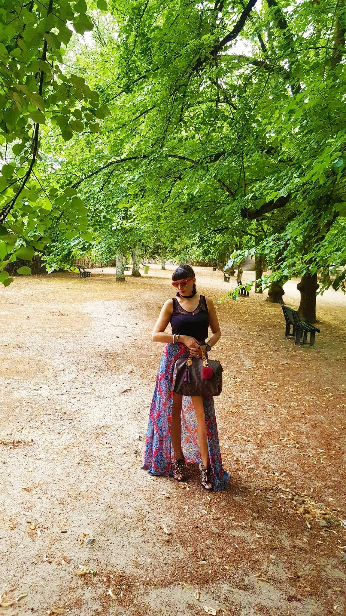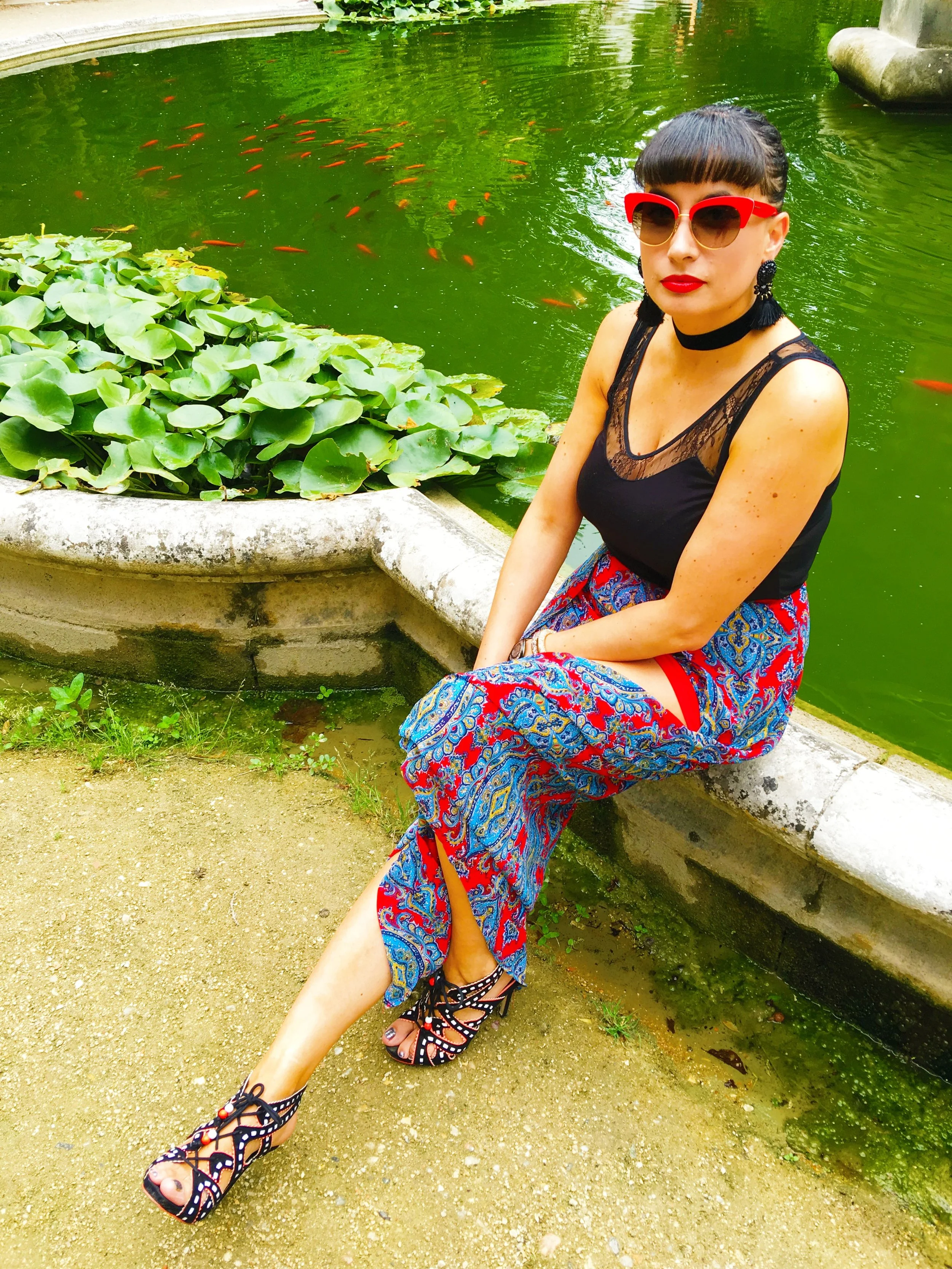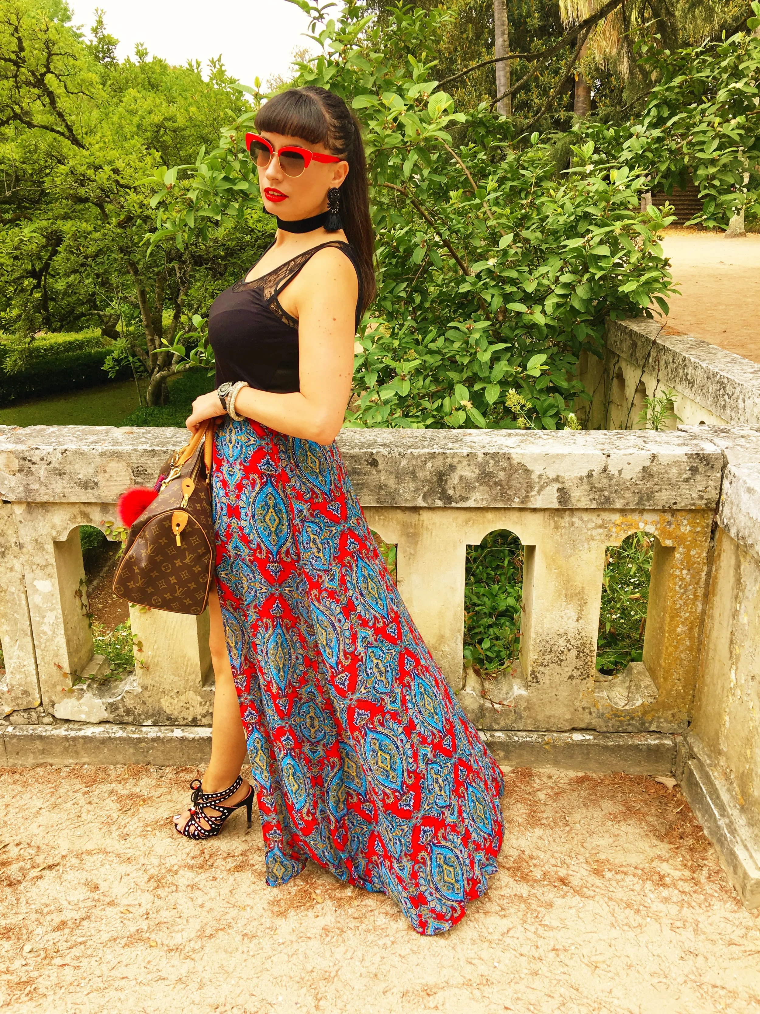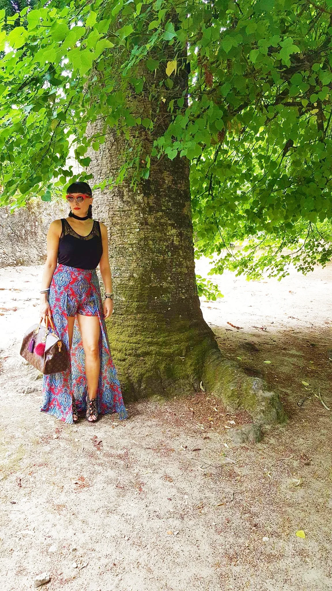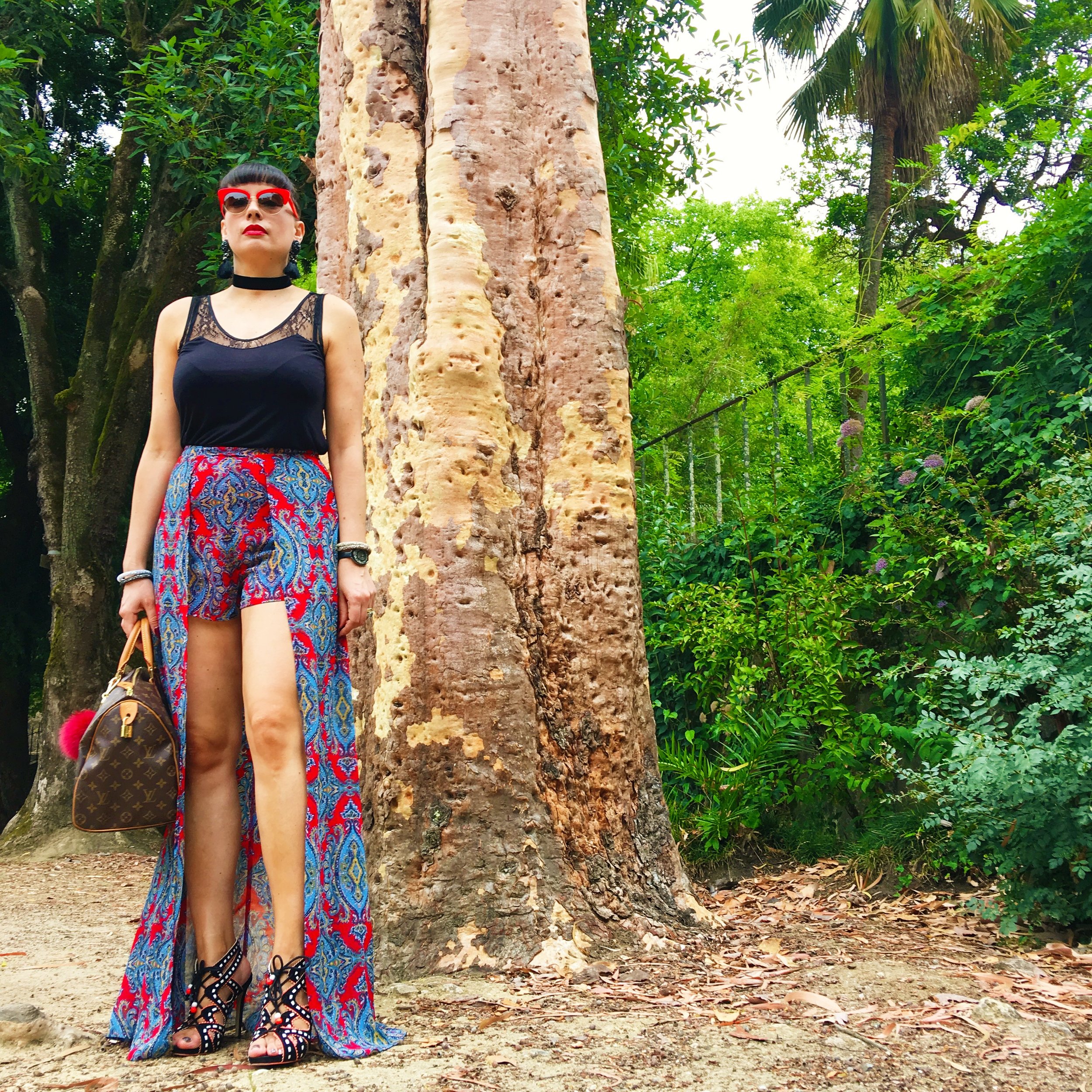 For this outfit post I started with these amazing pair of shorts! They are stunning!! The patron is lovely and summery and the skirt completes the shorts for a sophisticated look. As I wanted them to be the stand out piece I matched them with a simple black top with lace on the top part and I kept the rest of the accessories in neutral black. I added a pair of strapy sandals in black, white and a touch of salmon; a black velvet choker; black, fringed earrings; 4 bracelets in neutral tones and my Louis Vuitton Speedy bag in classic brown. For a touch of fun I added my red sunnies that match the patron of the shorts perfectly.