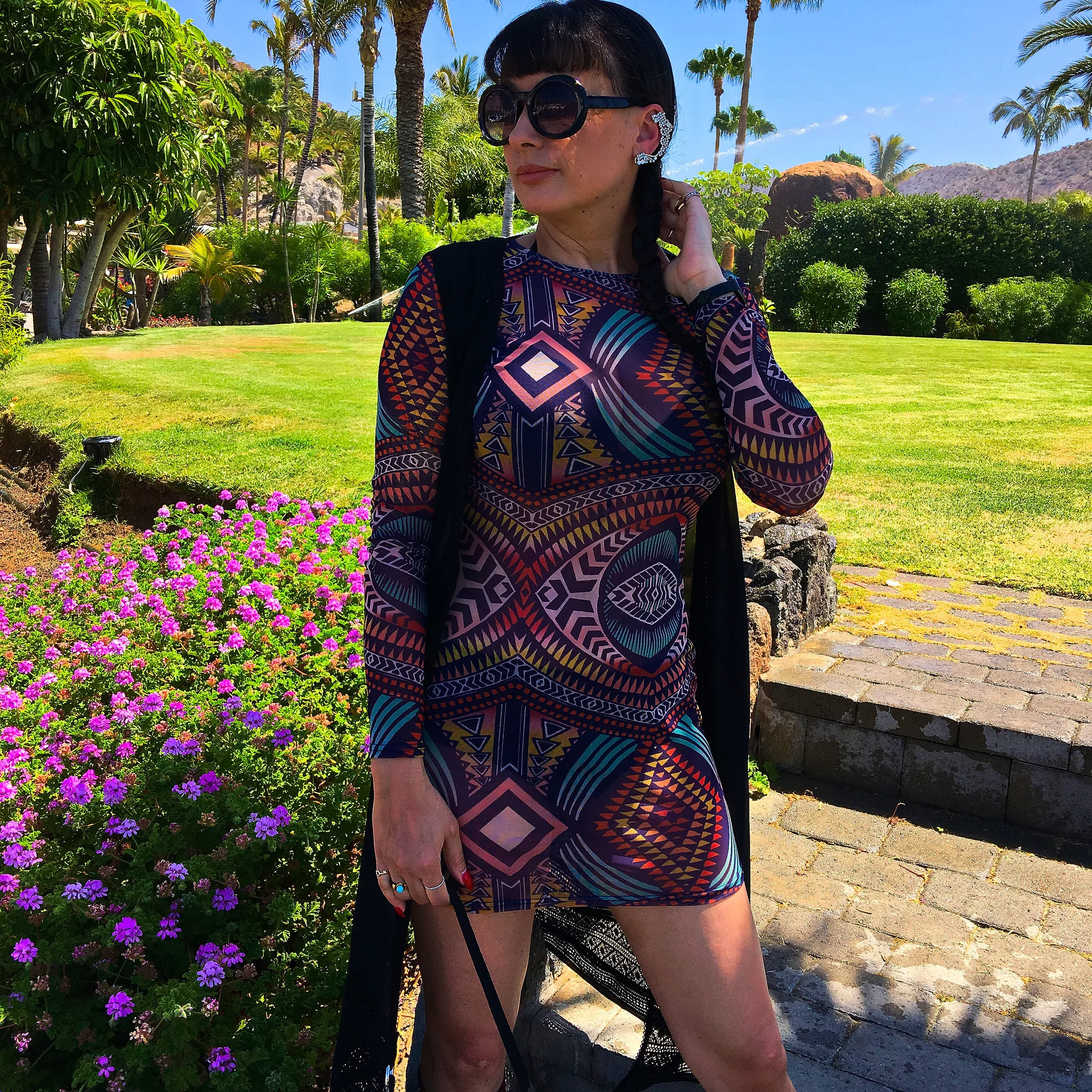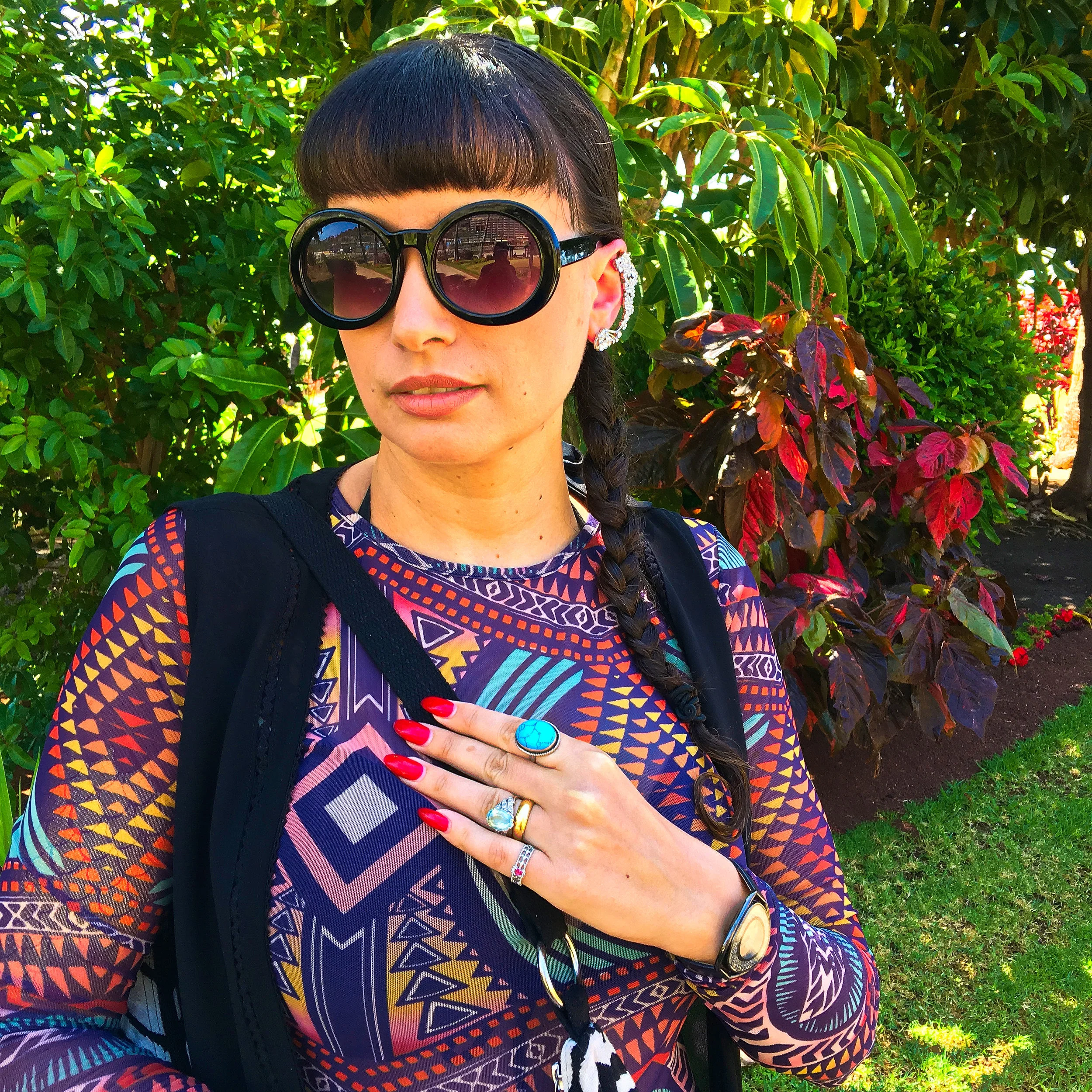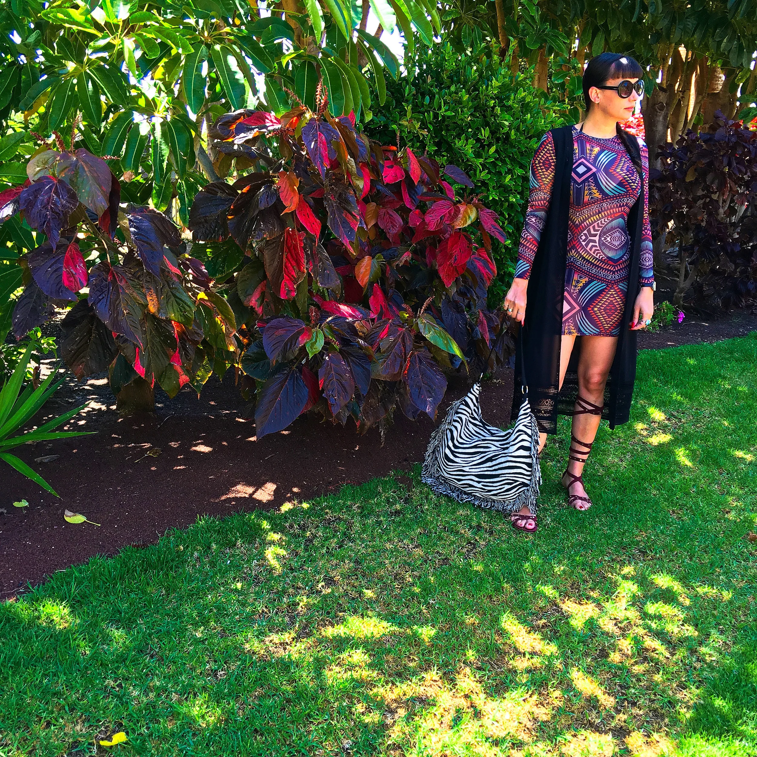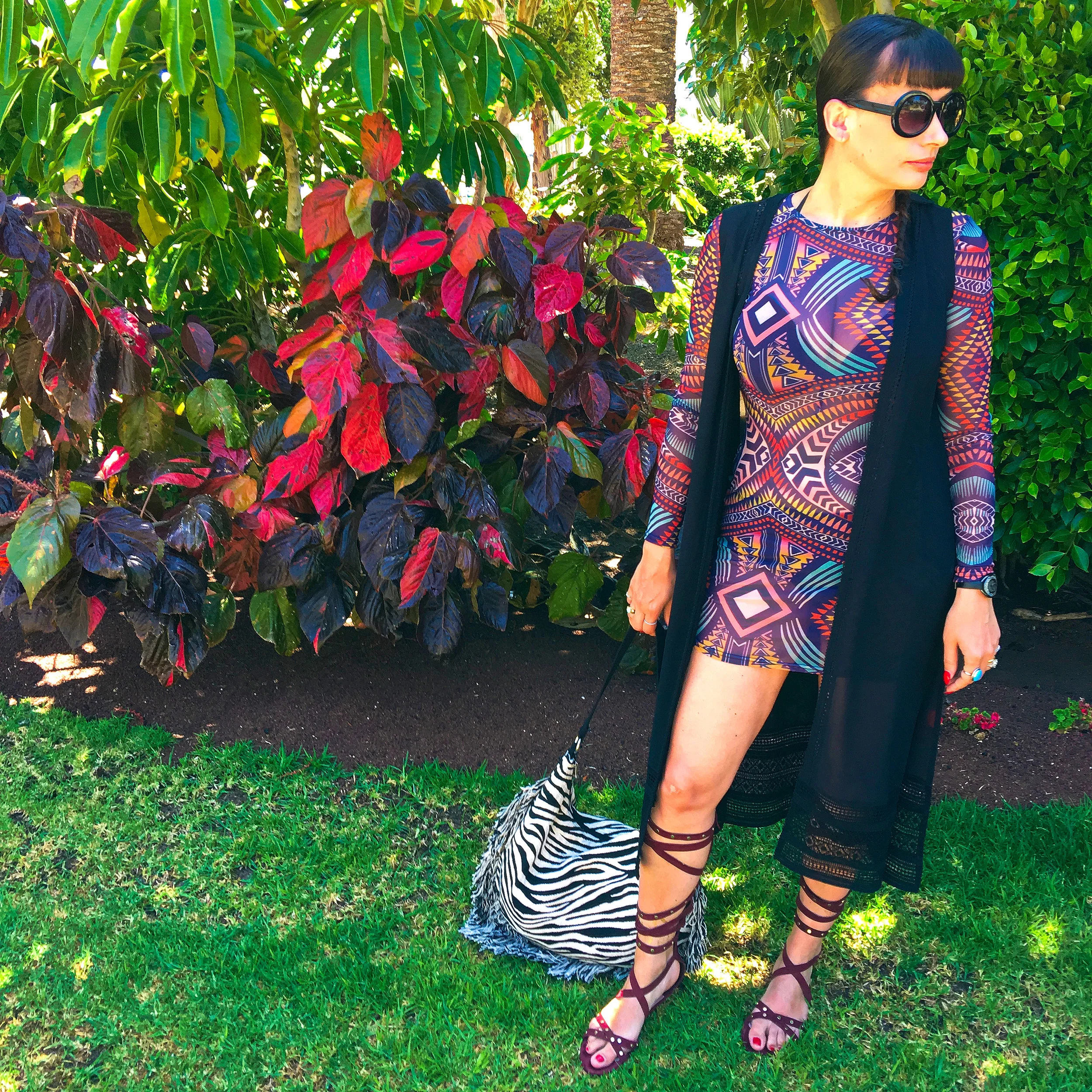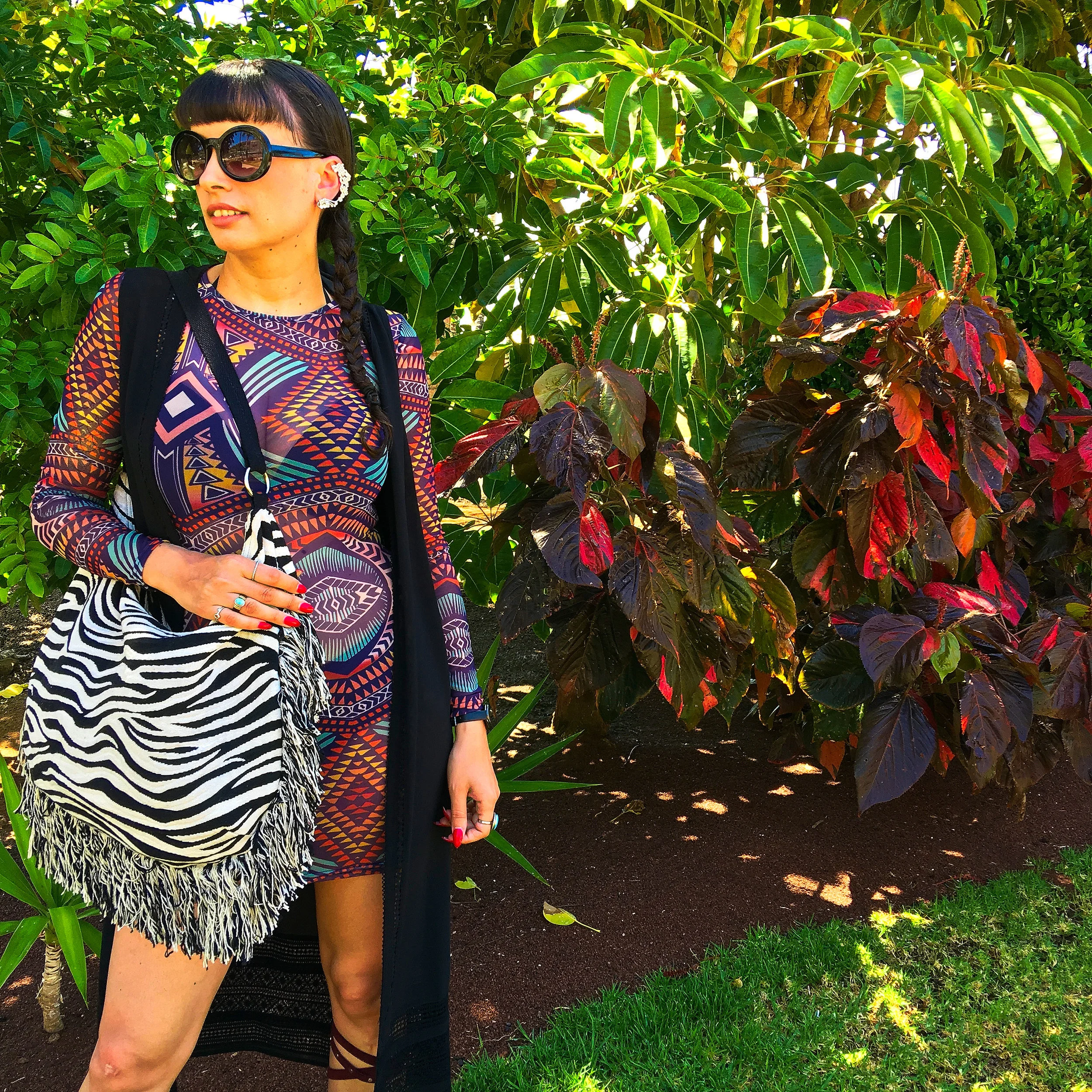On this look I'm wearing a beautiful aztec print mesh dress, that I coordinated with a long, black, vest and my suede burgundy gladiators. I'm also wearing a zebra print, black and white, fringed bag, my round sunnies, a crystal ear cuff and a selection of rings.