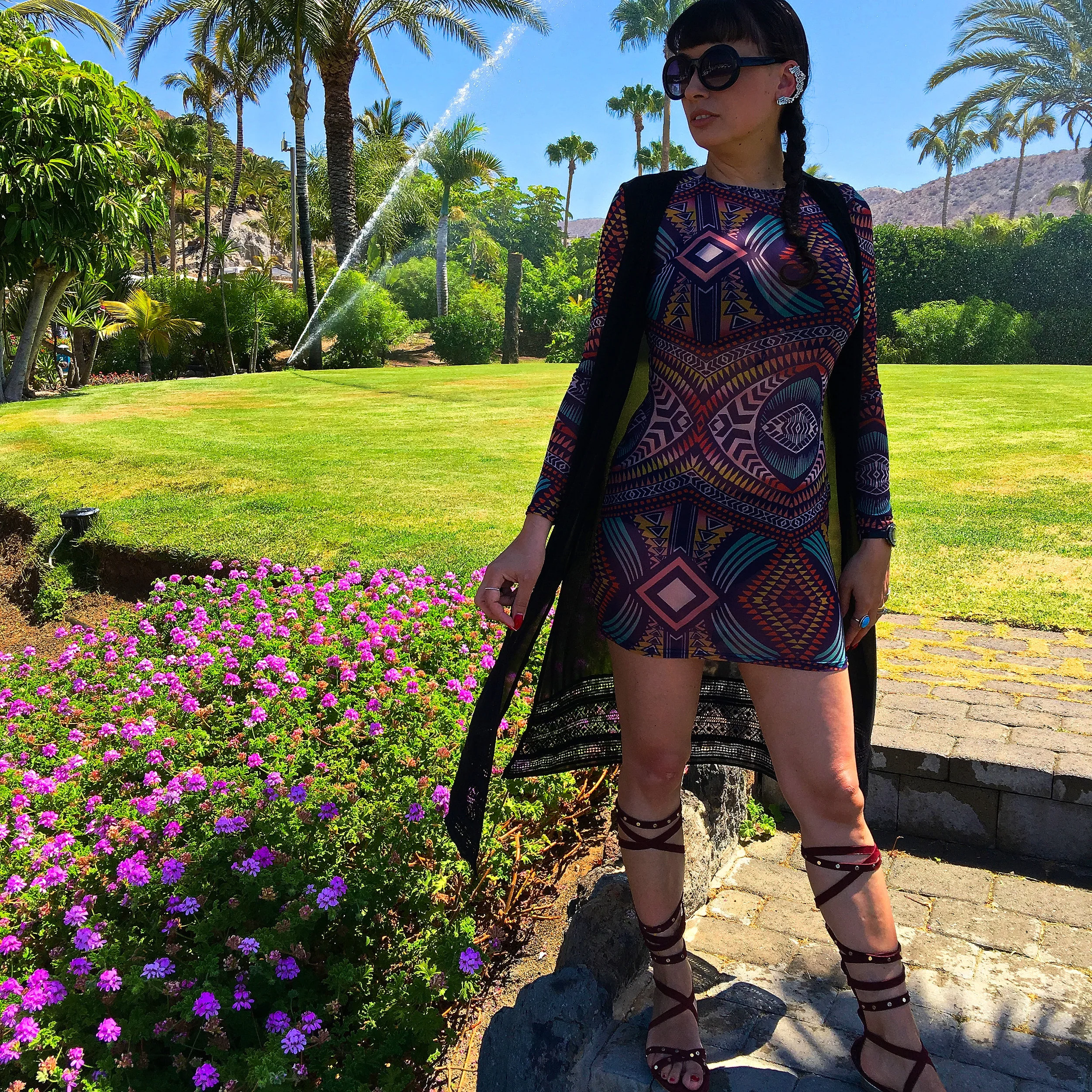 Este look e perfeito se queremos sentir-nos confortaveis e com estilo. Os tecidos ligeiros do vestido e colete trazem o look "praia" ao outfit, enquanto os estampados azteca e zebra canalizam o modo "ferias". O tecido ligeiro, medianamente transparente, do vestido permite que o bikini se veja e canaliza, tambem, o classico "cover up de praia".