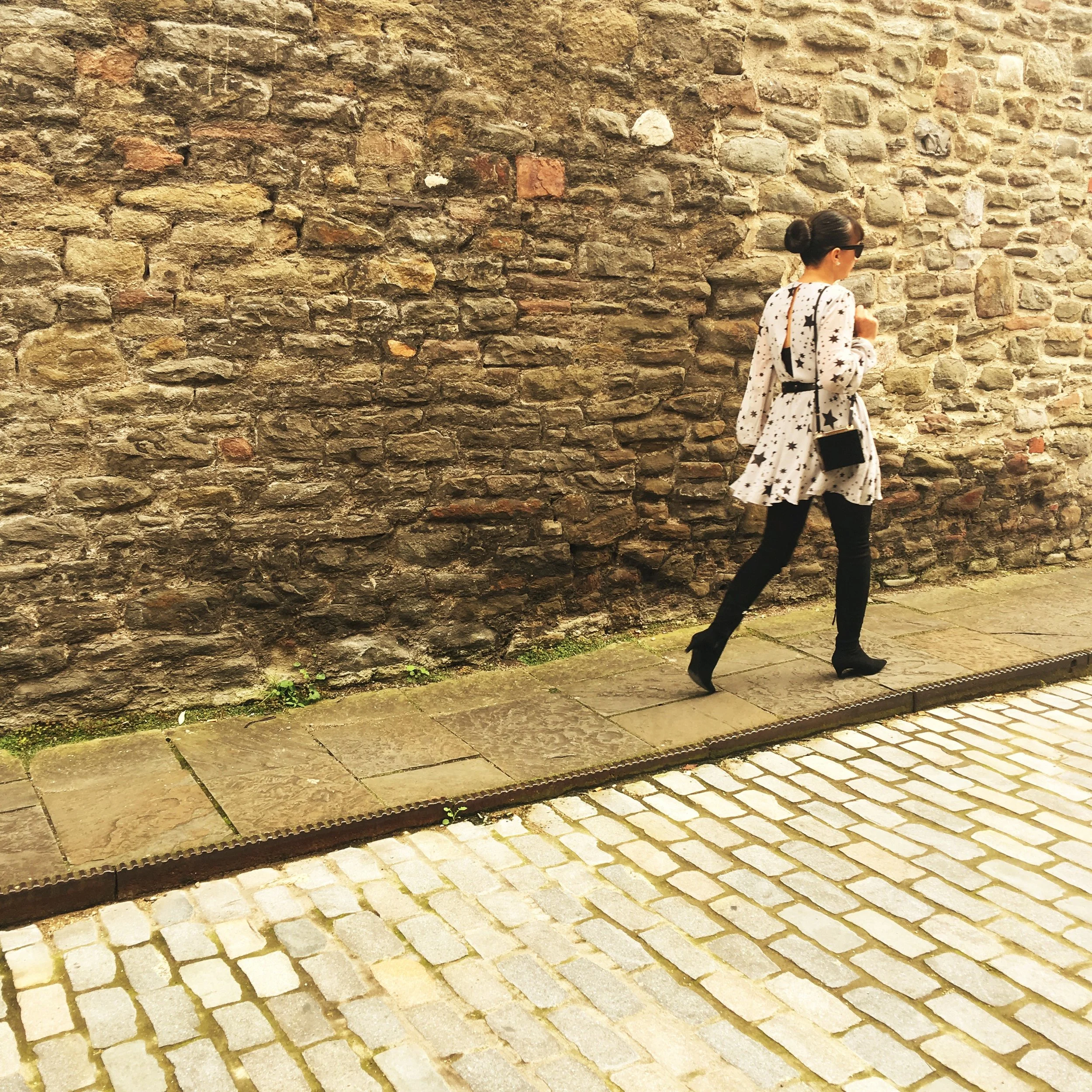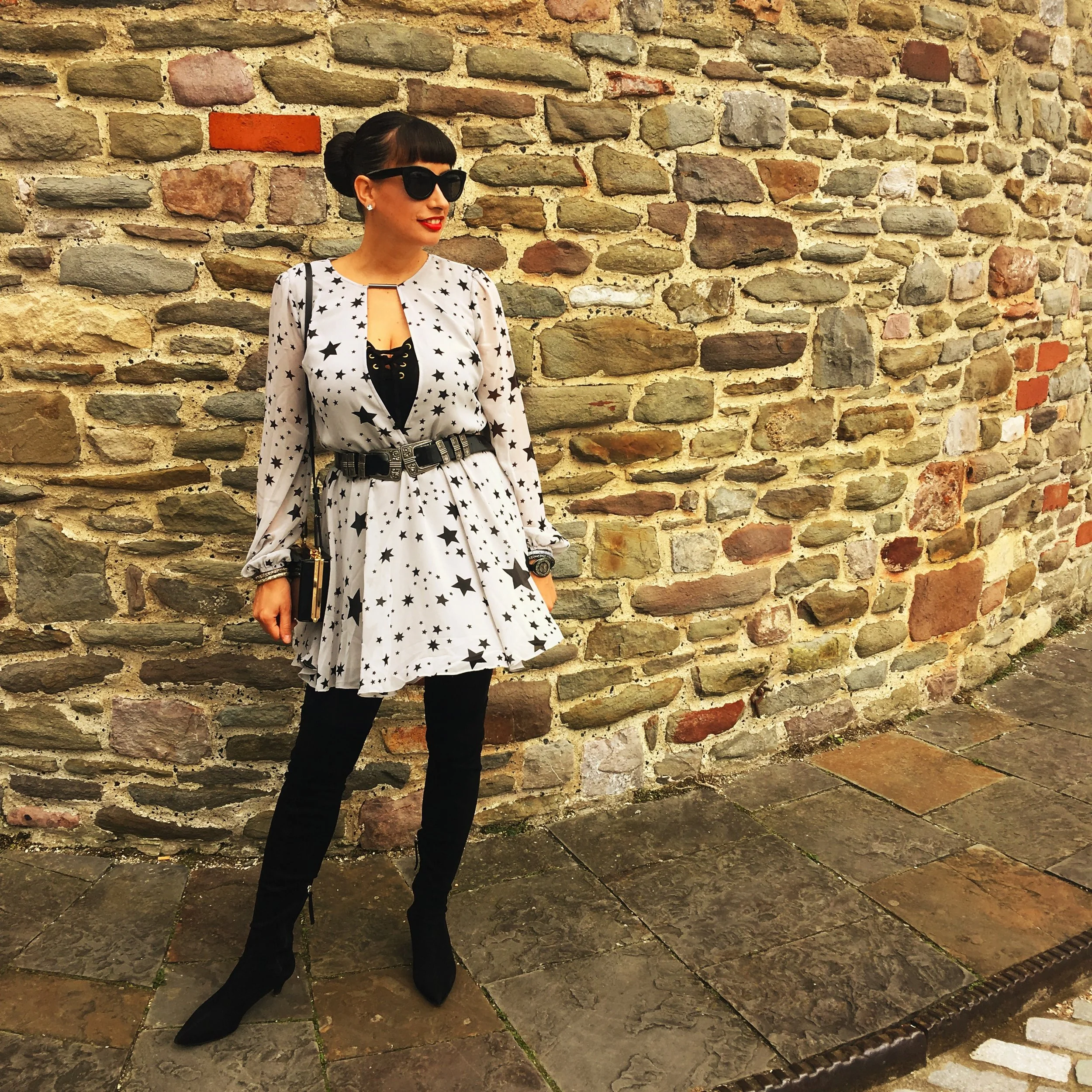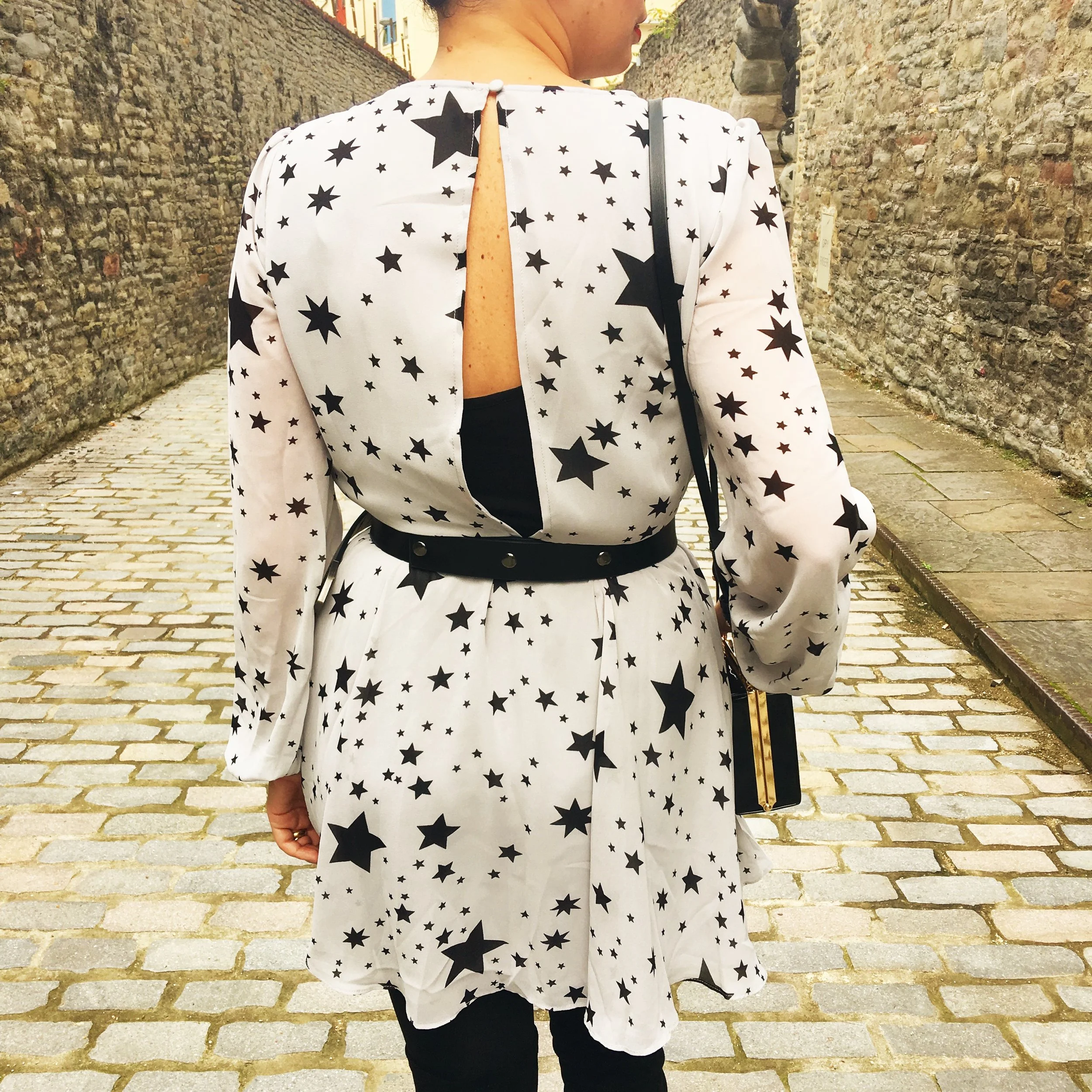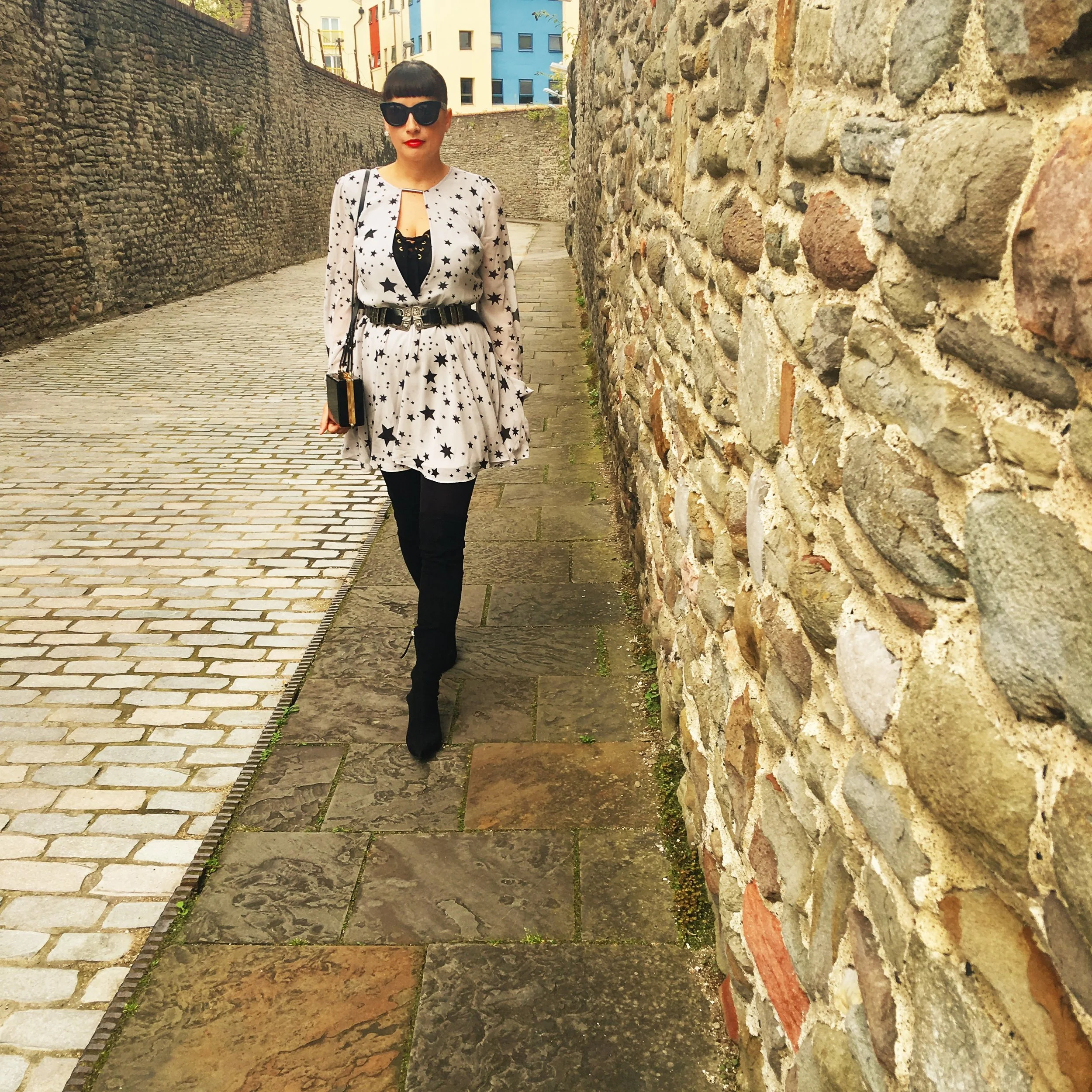 This look consists of a beautiful dress matched with over the knee boots, a good belt and a bodysuit! I'm wearing this amazing, flirty, dress with long sleeves with a black bodysuit underneath and over the knee boots as the weather was chilly. I really enjoyed wearing the bodysuit underneath as it gives a certain toughness to this romantic dress. The belt and bag also cut through the romantic look giving it a bit of an edgier look. I chose my black oversized sunnies from Monki, crystal earrings and a couple of bracelets as accessories to complete the look. I'm also wearing black leggings for extra warmth.