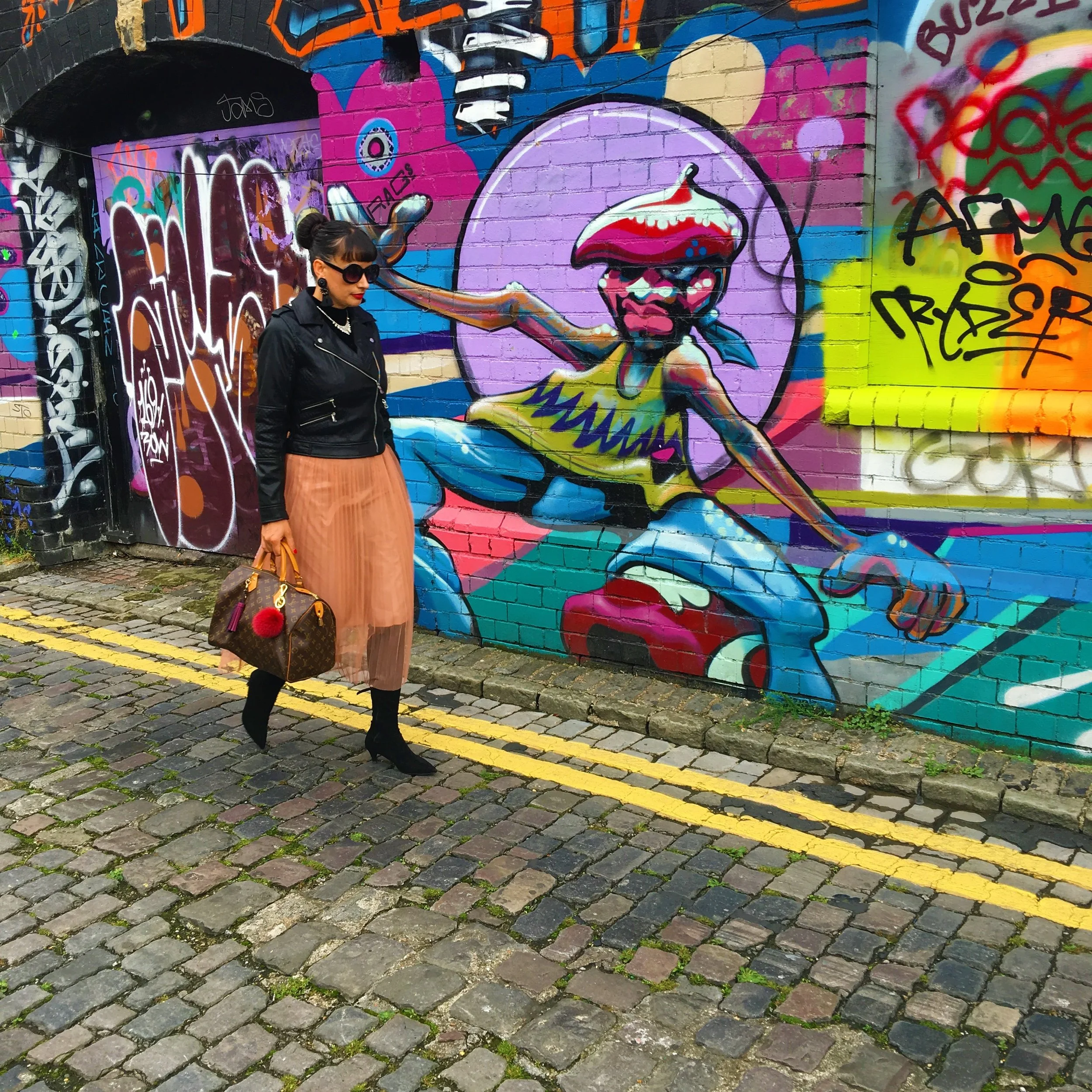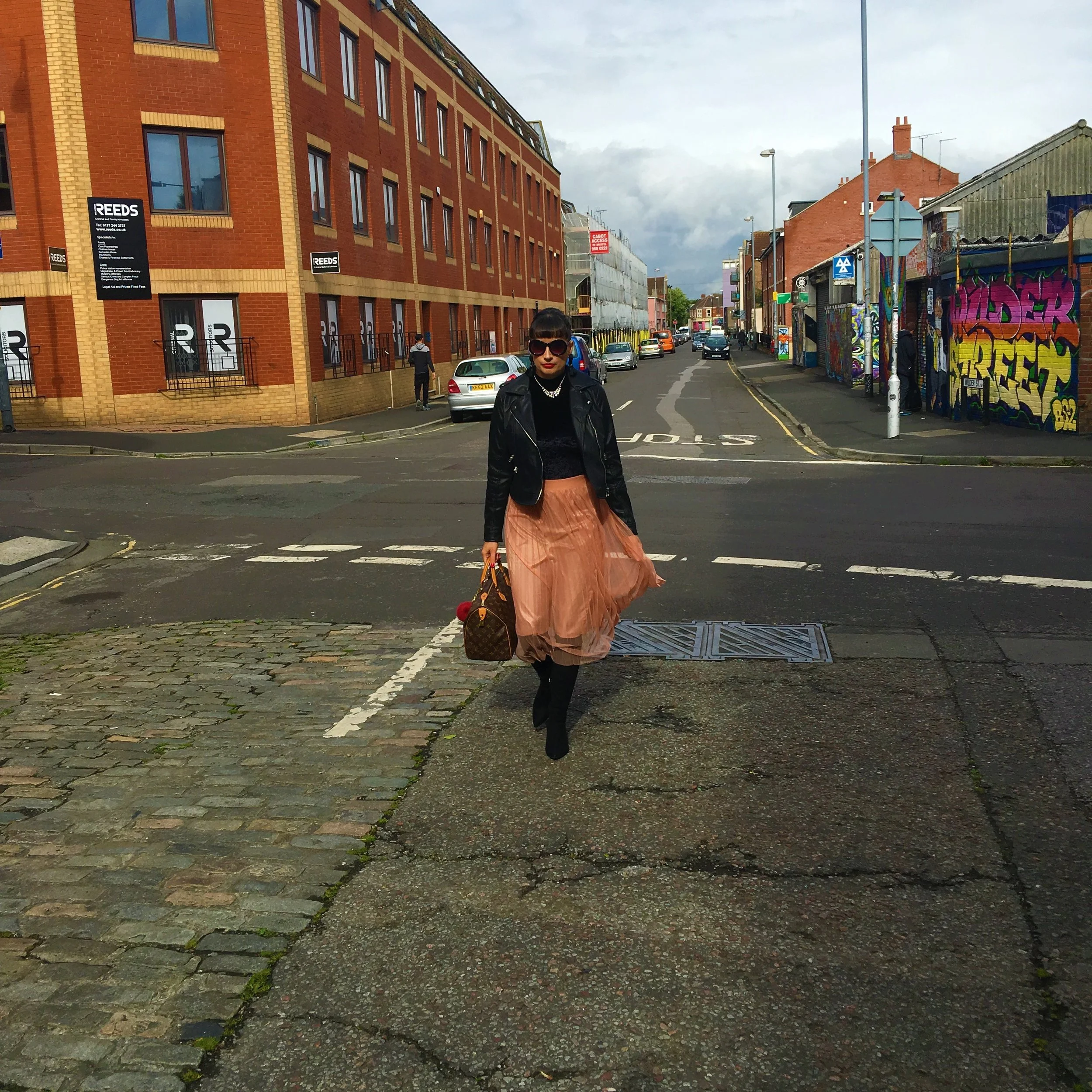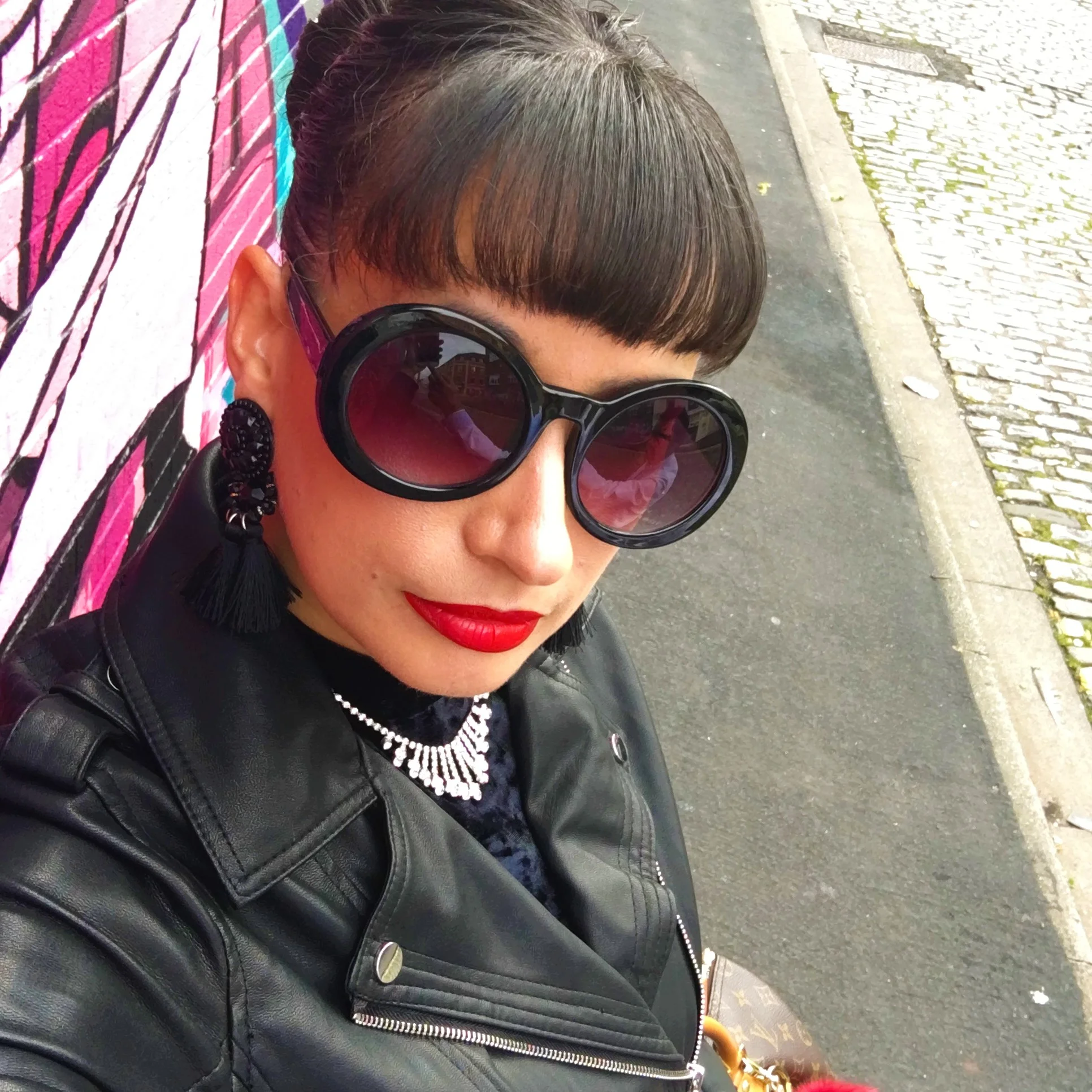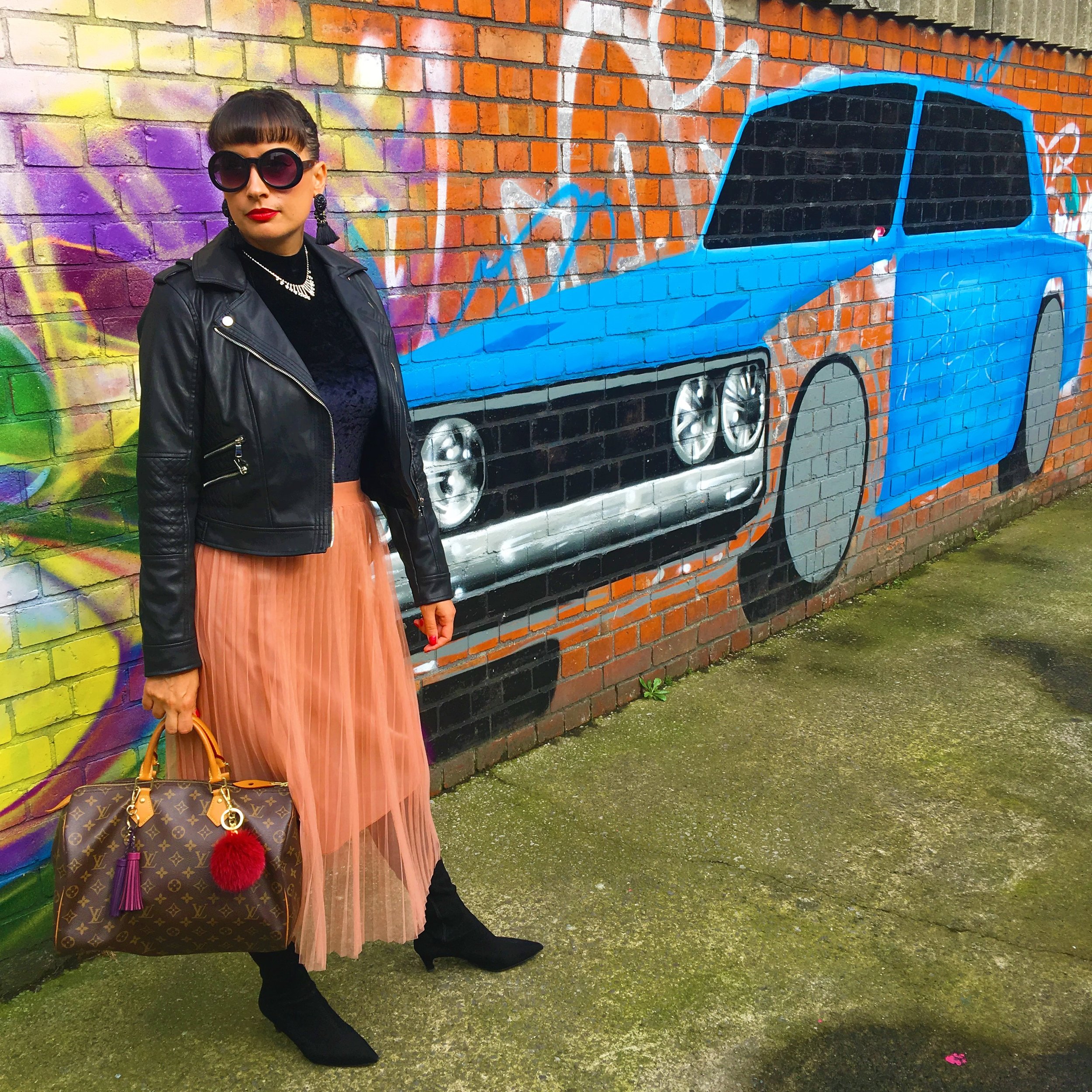 So, for this one, I decided on trying one of the most talked about trends this season: the pleated skirt! I chose a "ladylike", tulle, pleated, salmon coloured midi skirt and I matched it with another big trend: velvet. I am wearing a velvet, bodycon, turtle neck top with a leather motorbike jacket. I added a pair of suede over the knee boots and my Louis Vuitton bag. I'm also wearing a sparkly "princess" necklace, round sunnies and oversized, fringed, earrings.