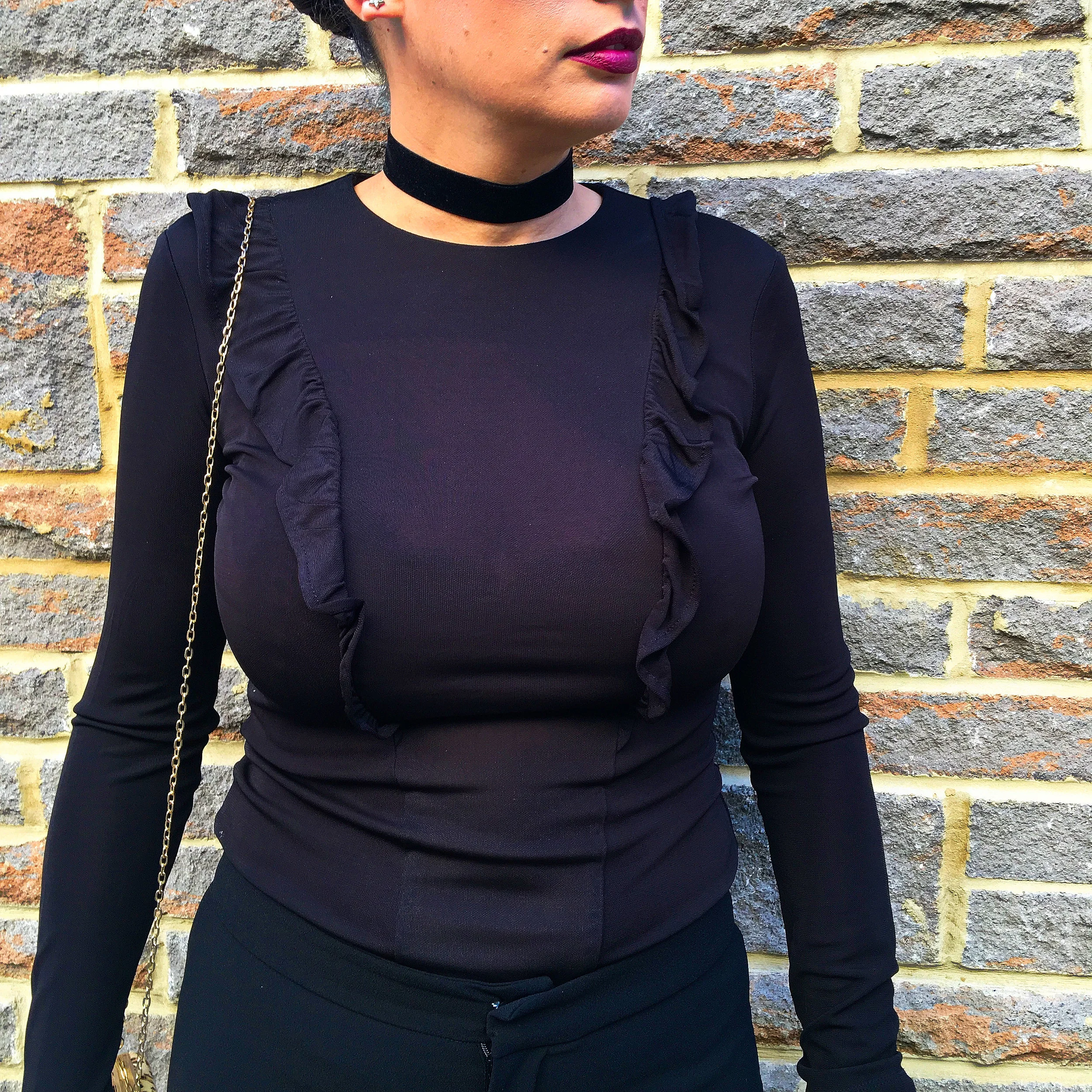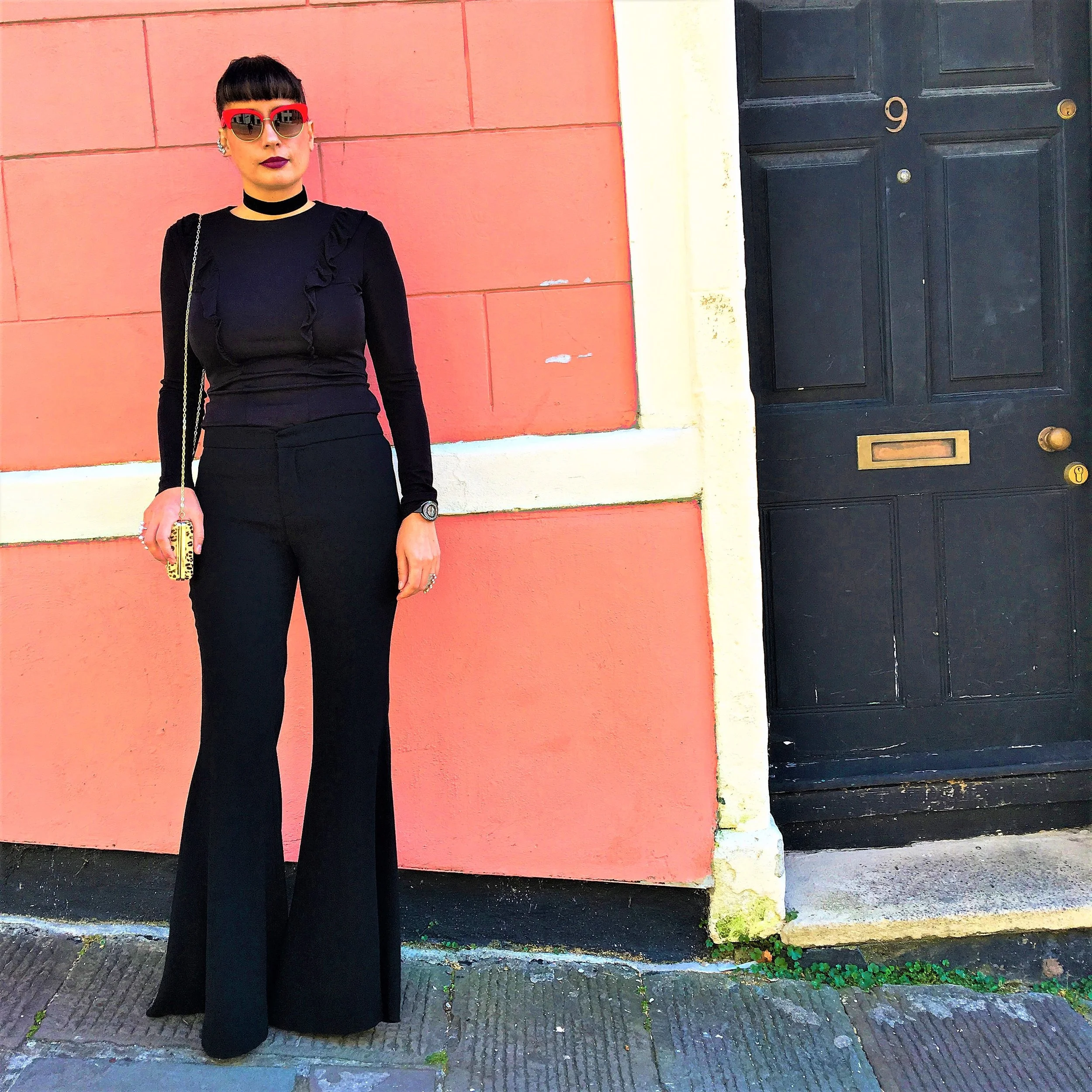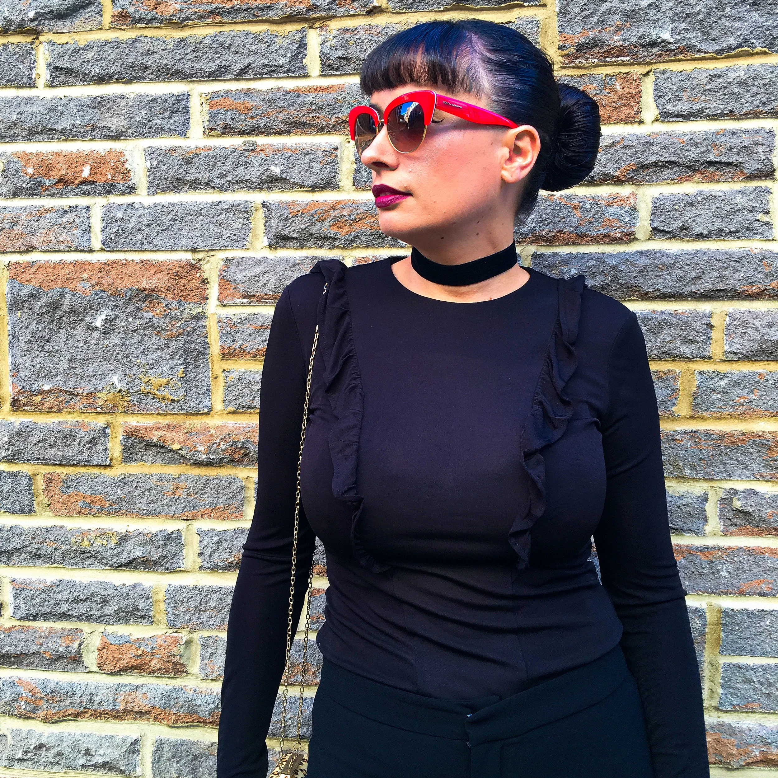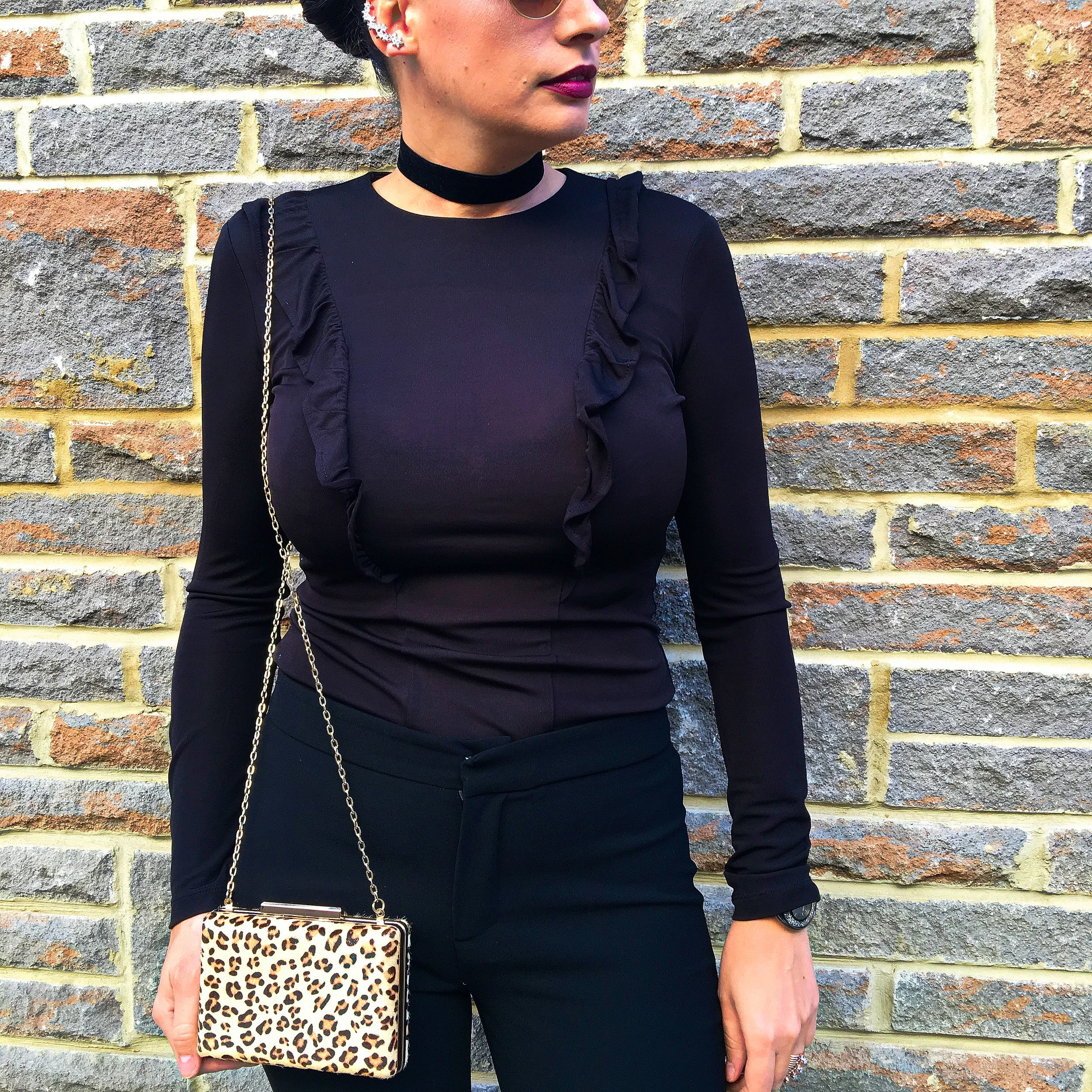 My outfit here is very black! Again, I'm so sorry! I know, I wear lot's of black, but sometimes it's just perfect! I chose this fantastic extra flared pair of trousers and I matched it with a ruffled black top. For accessories I chose an animal print small clutch that I coordinated with my animal print booties. I'm also wearing a black, velvet, choker; red sunnies; some gold and pearl rings; a star ear cuff and a dark shade of lipstick.