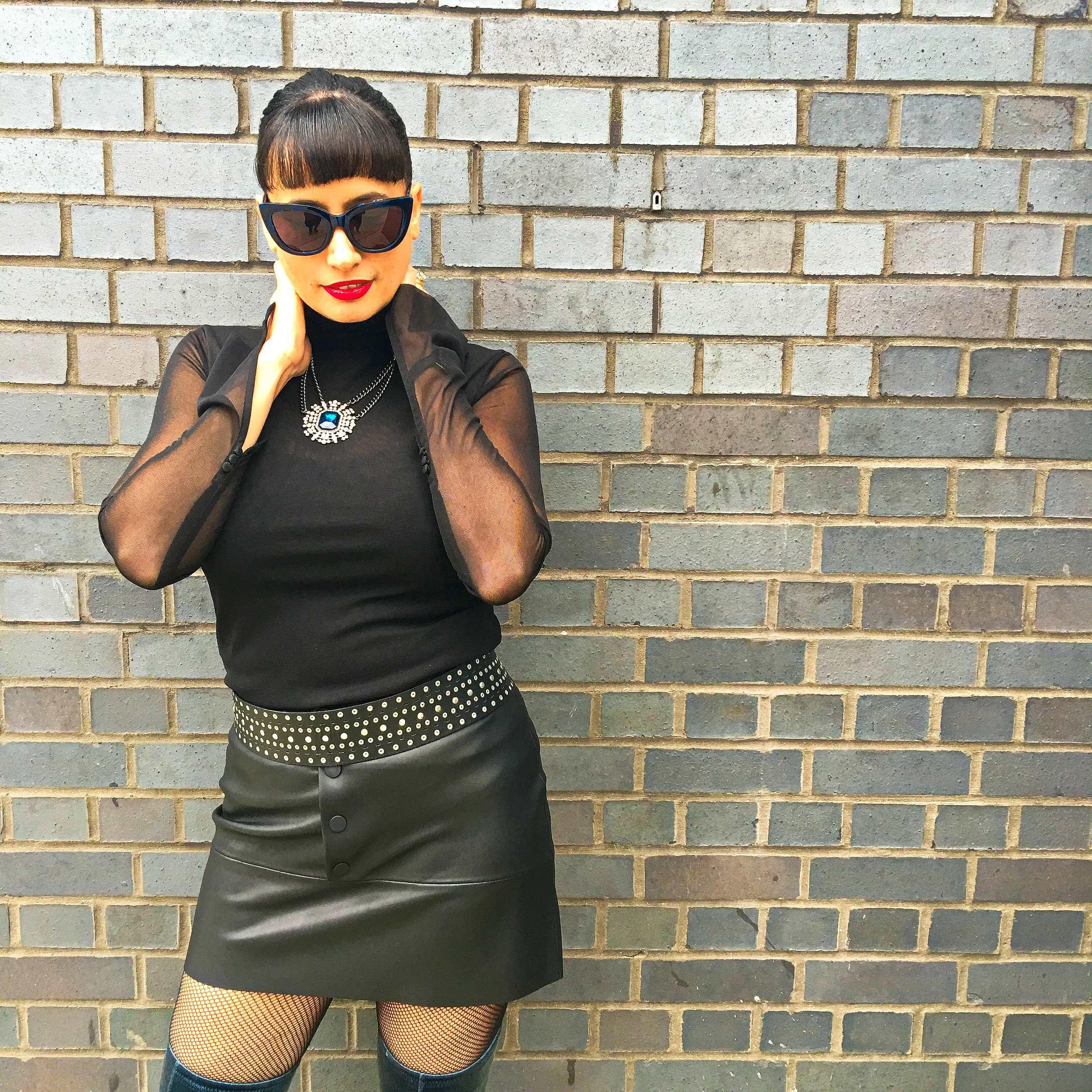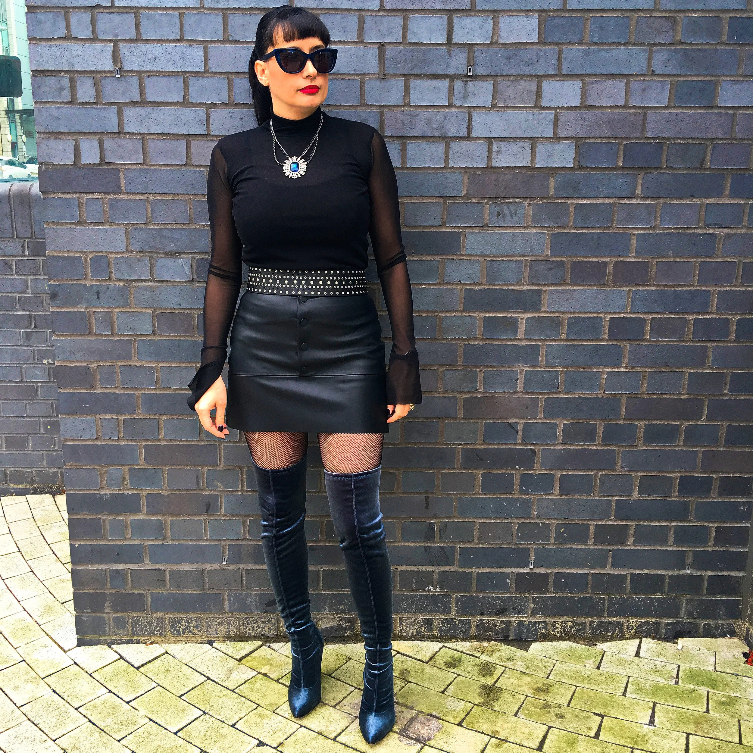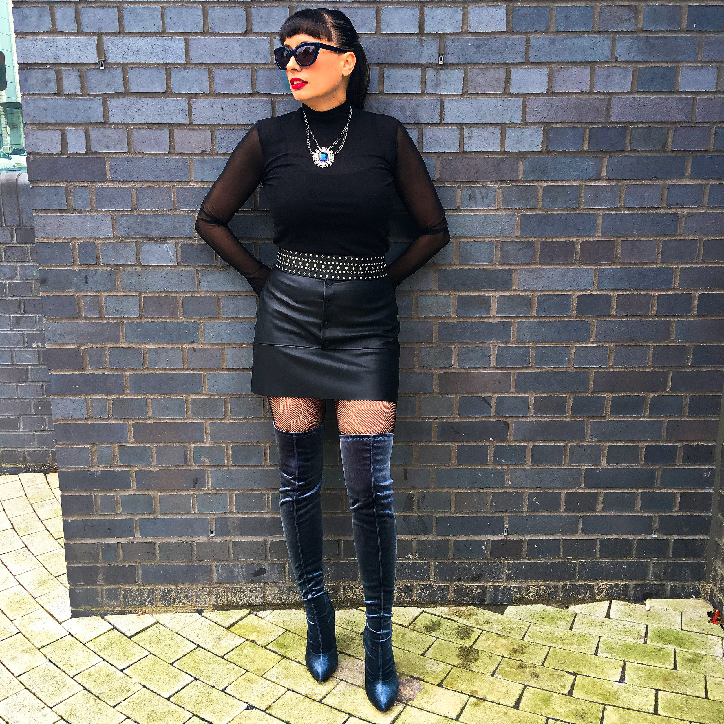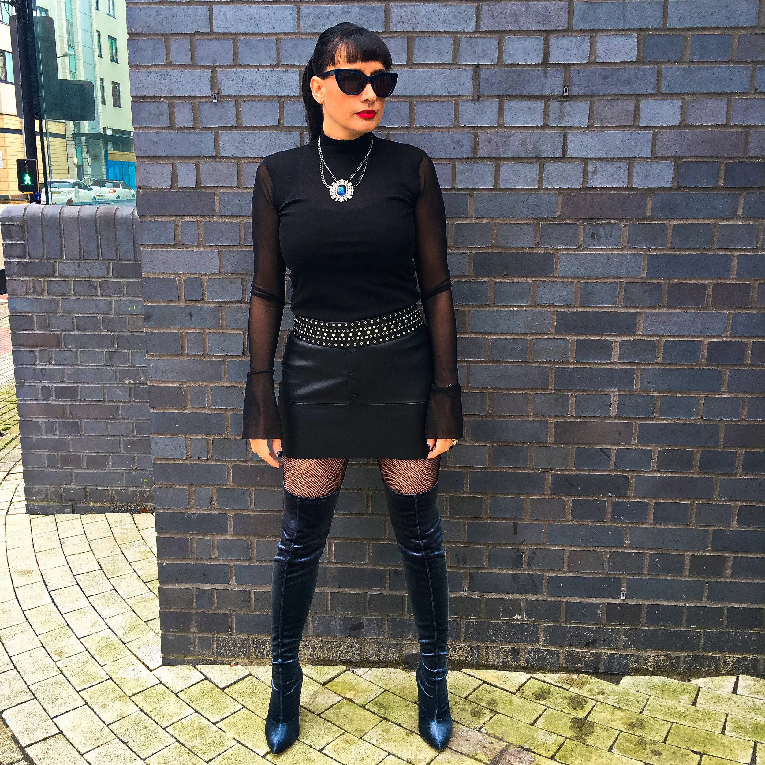 Today I'm wearing this fab pair of over the knee boots and I paired them with a leather mini, a black top and a blue overcoat. The point of wearing over the knee boots is to keep your legs warm while maintaining the sexy look of an outfit. You can pair them with skinny jeans or leggings but, if you want to make a statement, you have to wear a mini! And that's what I did. I matched the boots with a simple leather mini and I added a black, long sleeved, top. The blue overcoat matches the blue of the boots and keeps me warm. I'm also wearing fishnet tights, a leather and metal large belt, a statement necklace and blue sunnies.