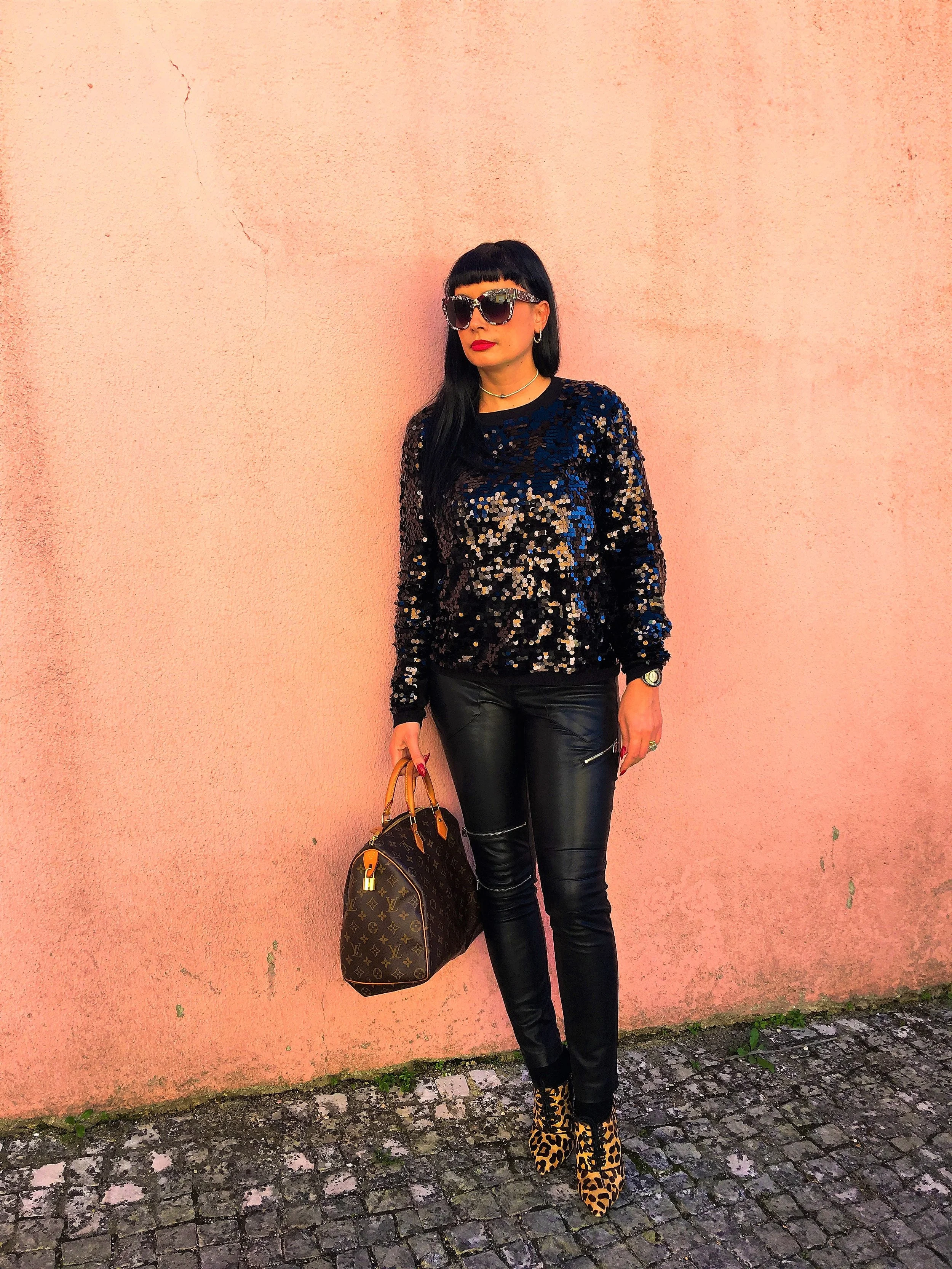 For this look I chose a sequined black jumper and I added neutral colours and different textures. I'm wearing this sequin black jumper (get it here) with black leather trousers with metal zippers (similar here). Over the jumper I'm wearing a brown fur coat (similar here) and as shoes I picked a pair of animal print ankle boots (similar here). For accessories I'm wearing my Louis Vuitton Speedy bag (here), a pair of sunglasses by Dolce & Gabbana (similar here) and choker and earrings in silver.
