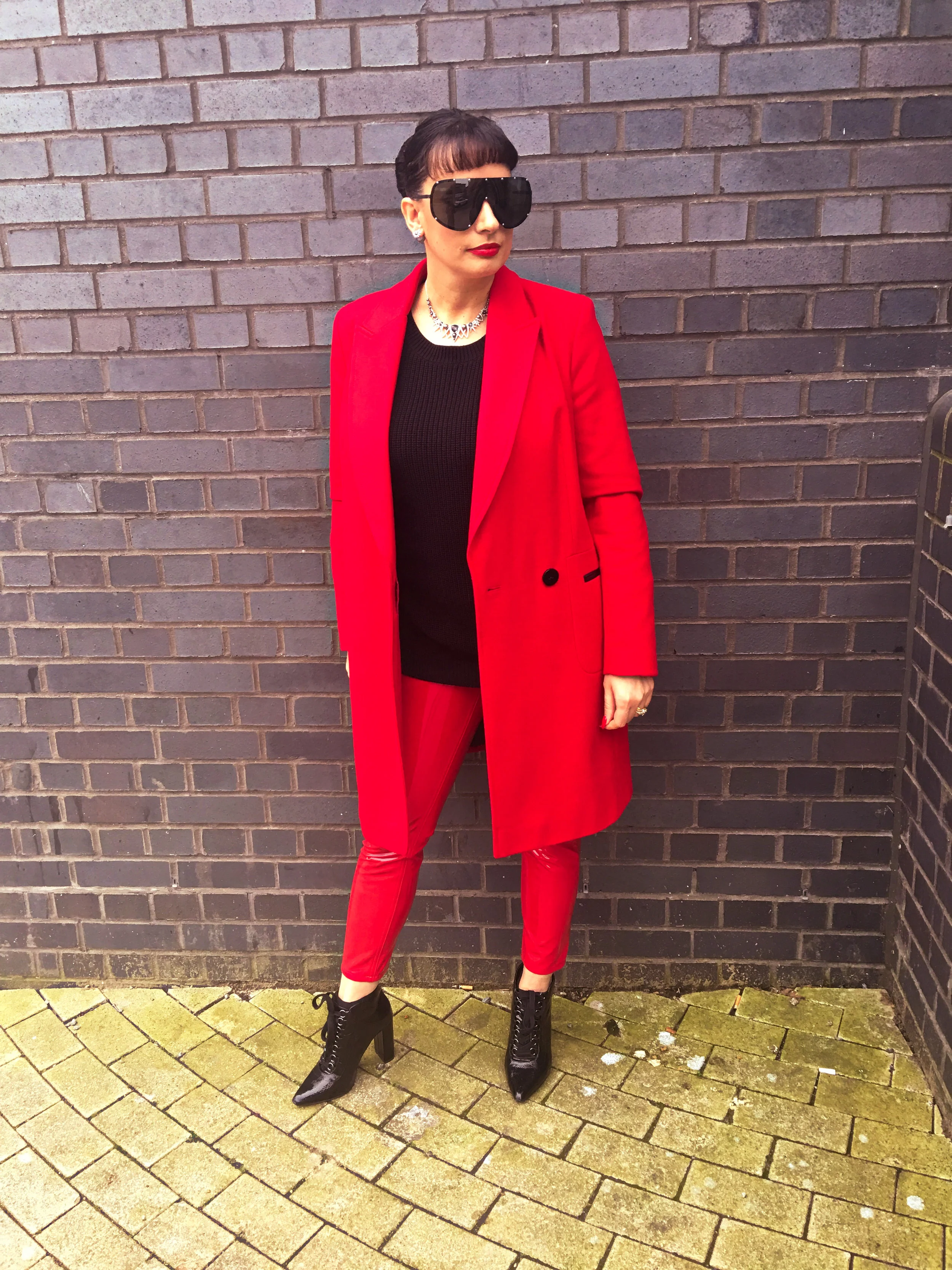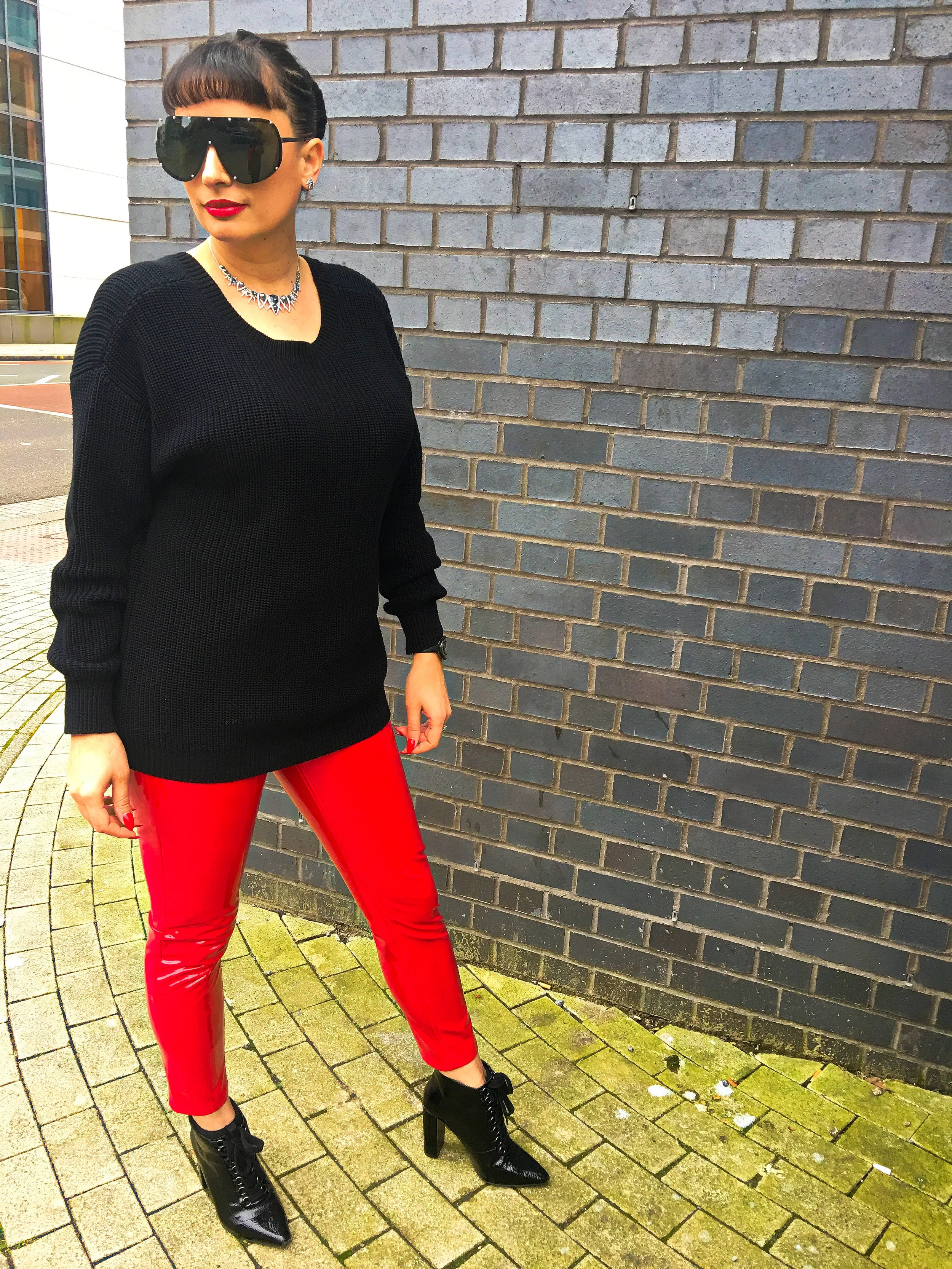 I'm wearing these fabulous trousers in red vinyl with a red coat, a black knit sweater and black varnish ankle boots. I accessorised with oversized black, studded, sunnies a necklace and earrings.