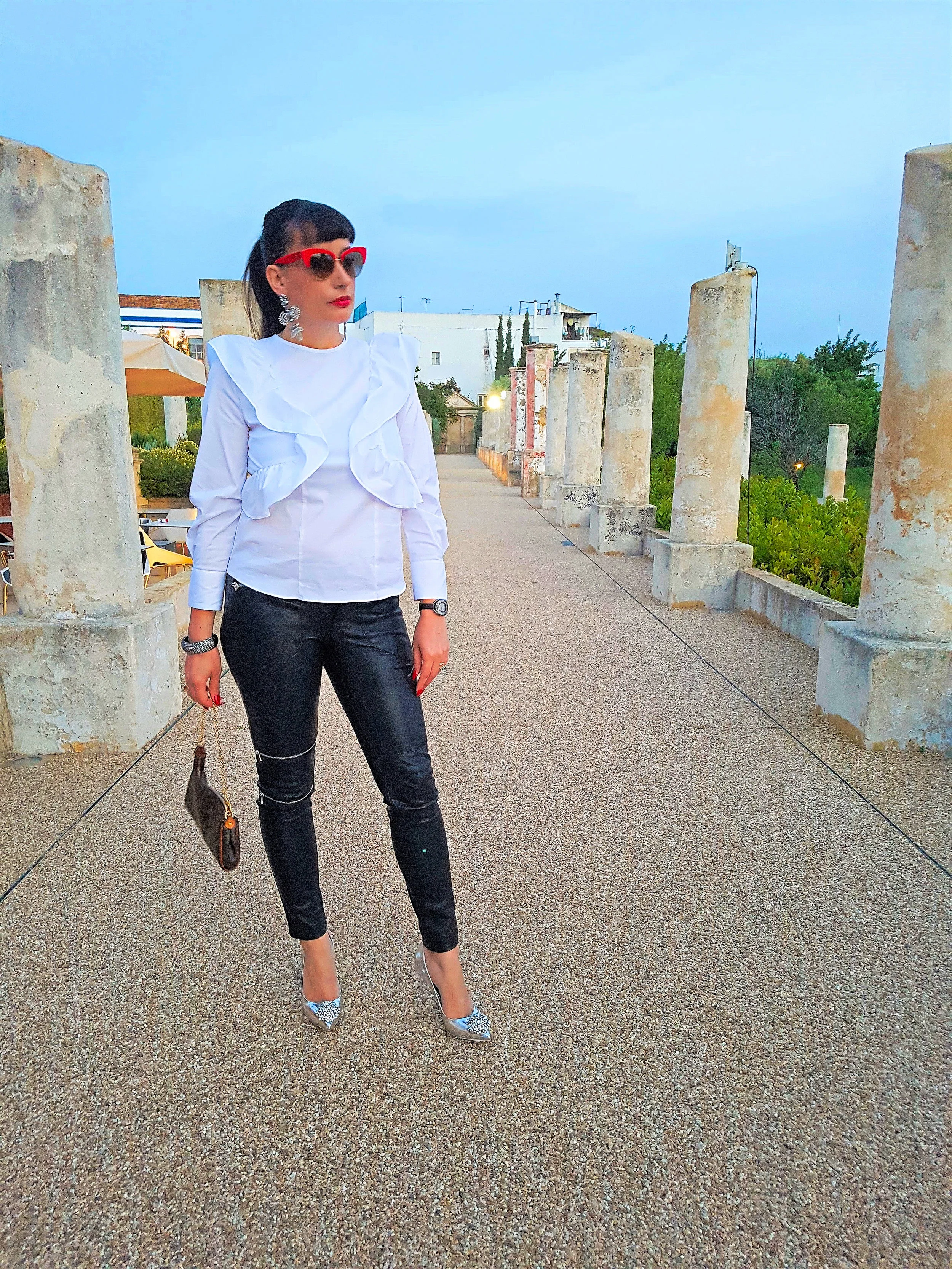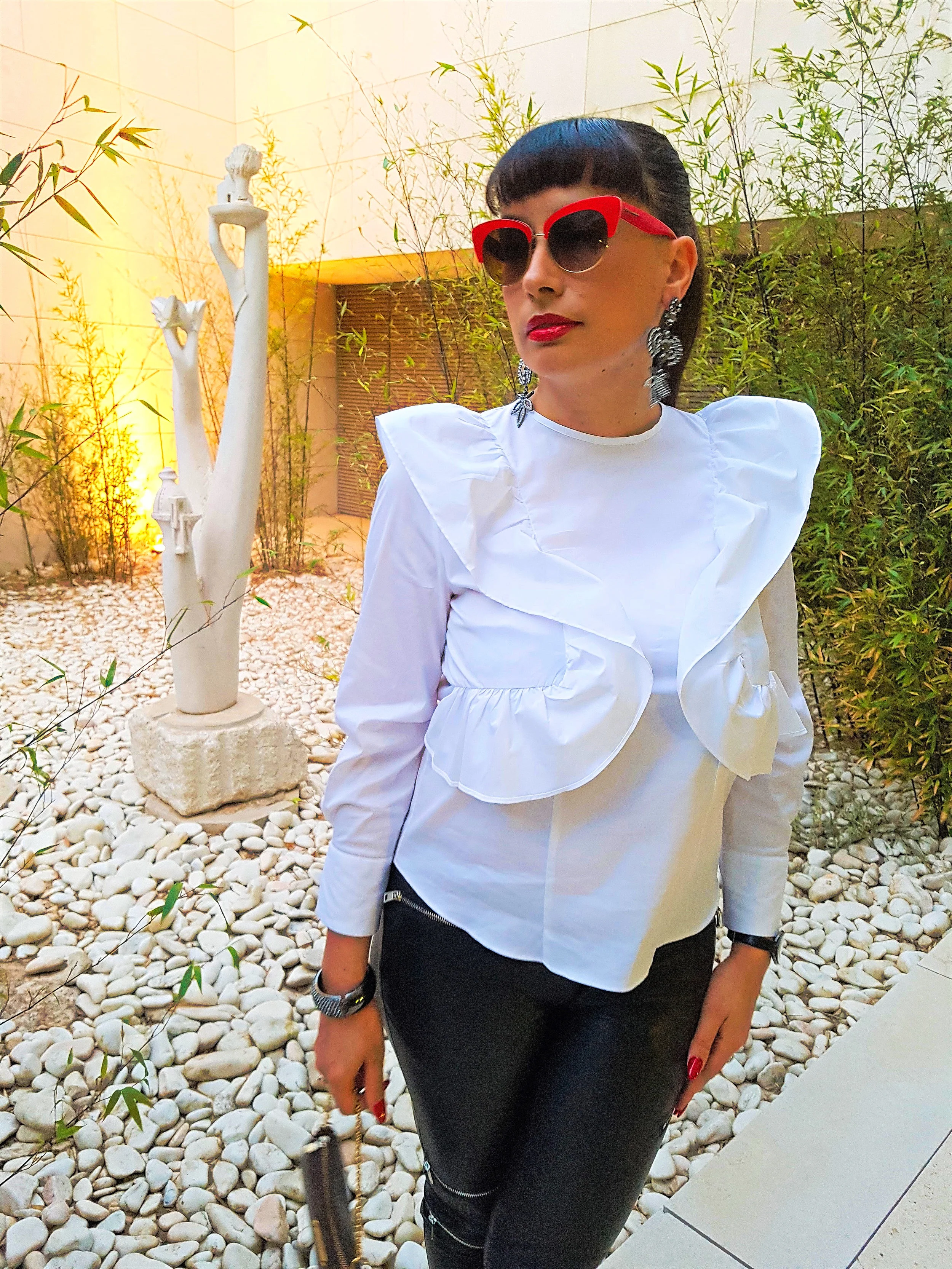 This is a look that I put together starting with the shirt and adding pieces. I wanted to cut through the softness and romantic vibe of the ruffled shirt so I added the leather trousers. After that I wanted to keep adding contrast and interest to the outfit so I chose silver details like the pumps, cuff and earrings. The jacket was a nod to the romantic vibe of the shirt and finally the sunglasses are a pop of colour. The clutch I wore adds a neutral touch that wraps everything together.