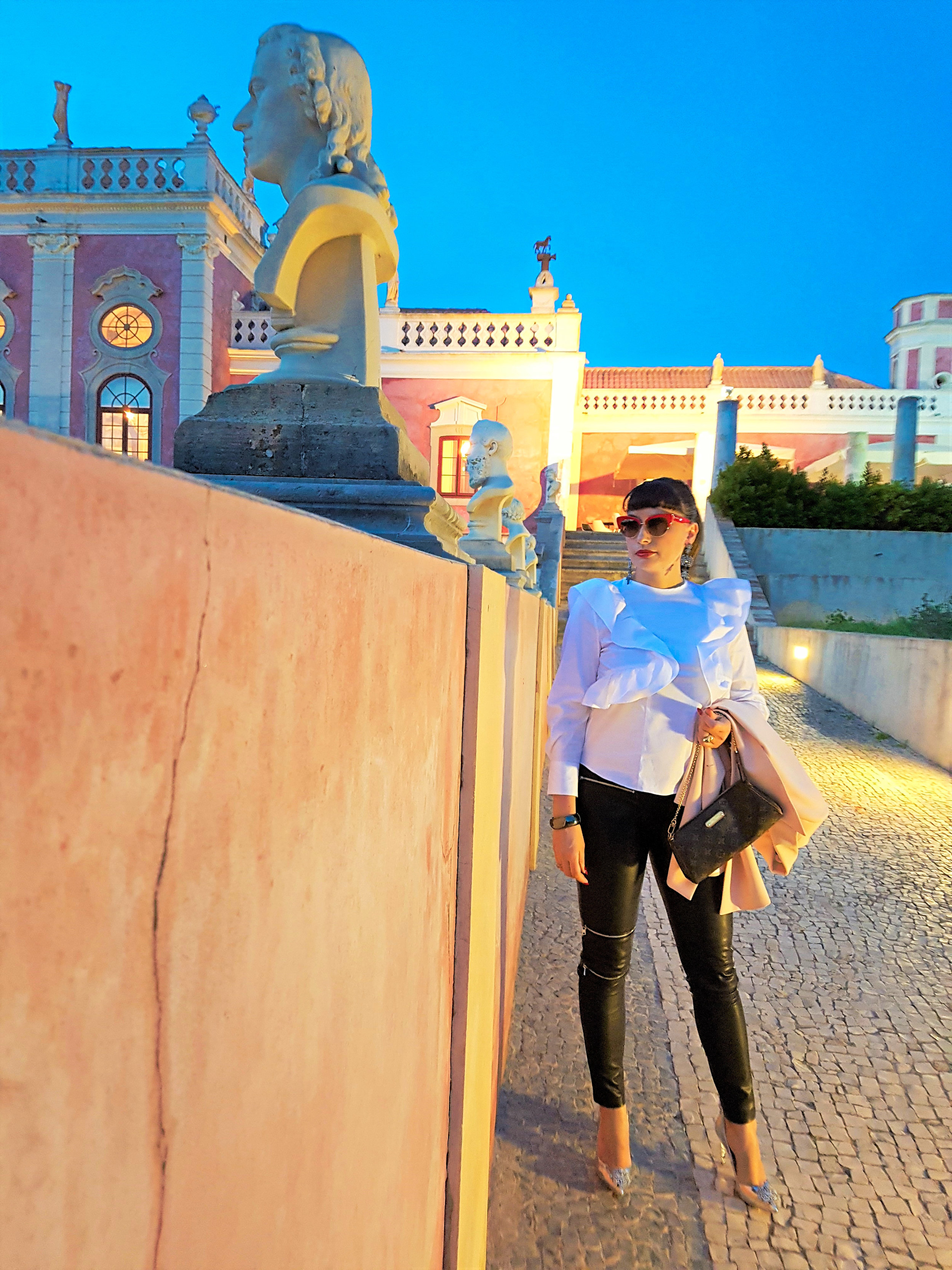 Este e um look que eu compus a partir da camisa ao adicionar pecas. Queria cortar o ar suave e romantico da camisa e foi por isso que acrescentei as calcas de cabedal. Depois quis continuar a adicionar contraste e interesse ao outfit e escolhi os detalhes prata: sapatos, pulseira e brincos. O casaco foi acrescentado para acentuar o ar romantico da camisa e finalmente os oculos-de-sol para dar um pouco de cor. A clutch que usei traz um elemento neutro ao conjunto que o unifica.
