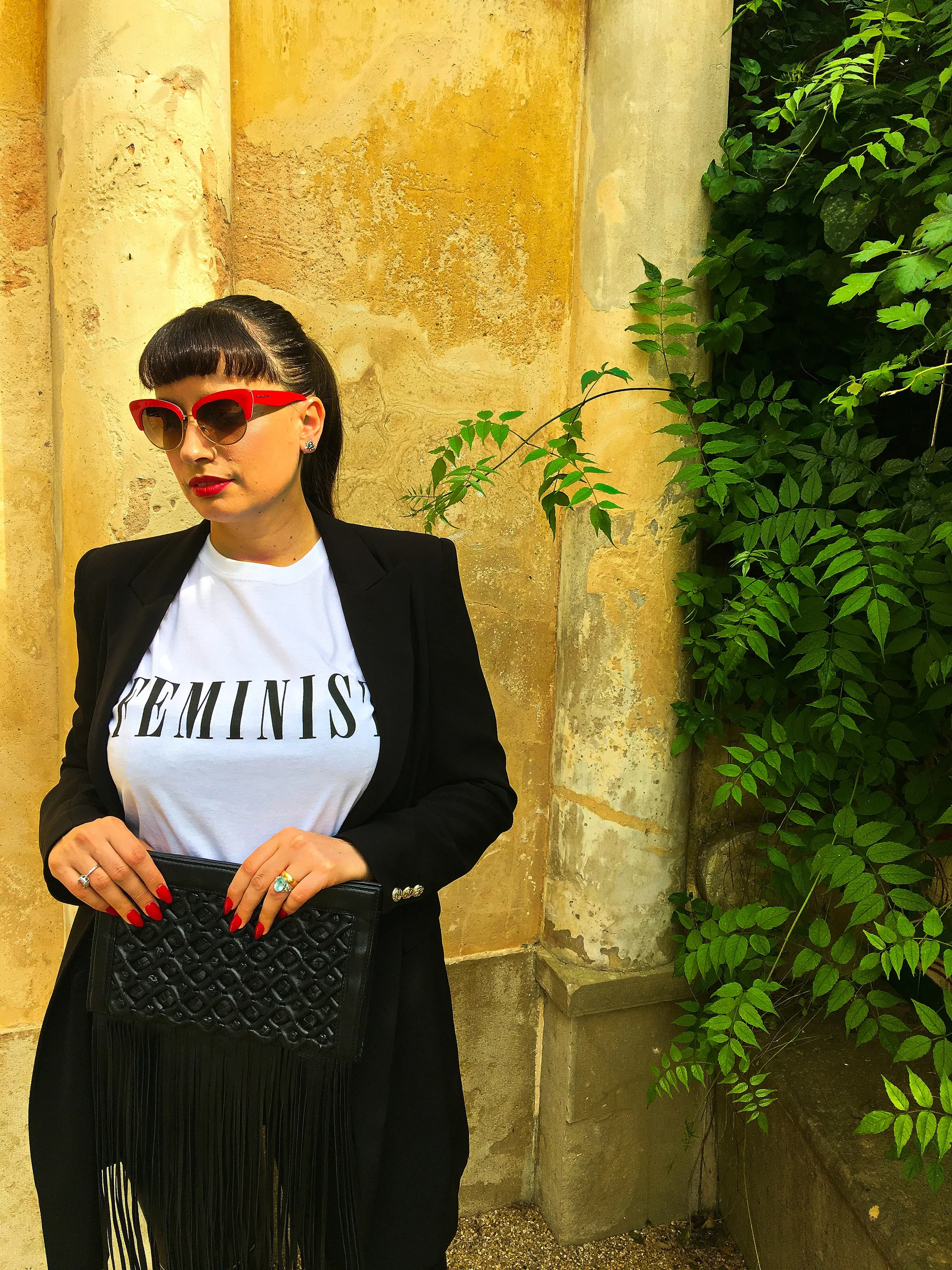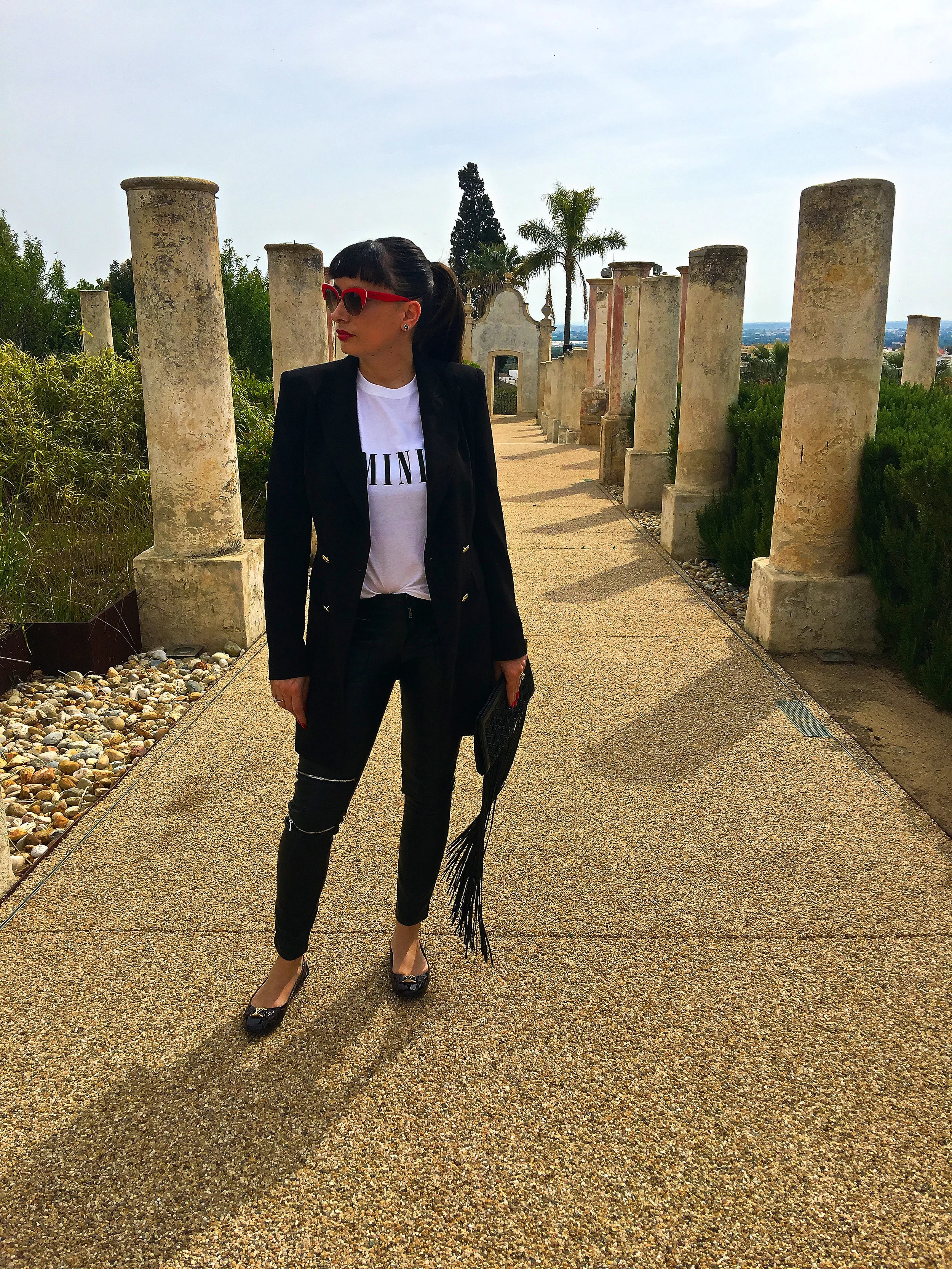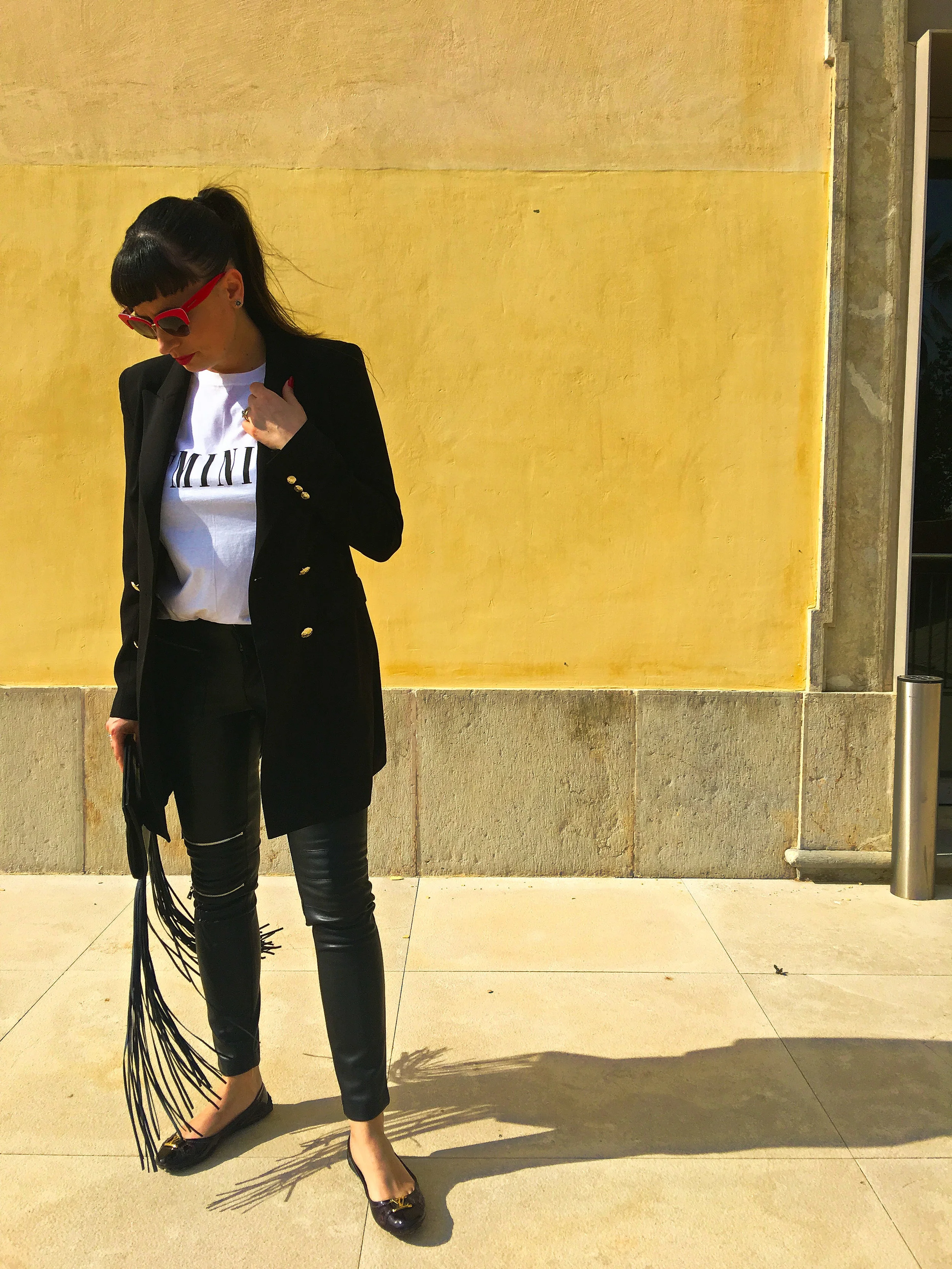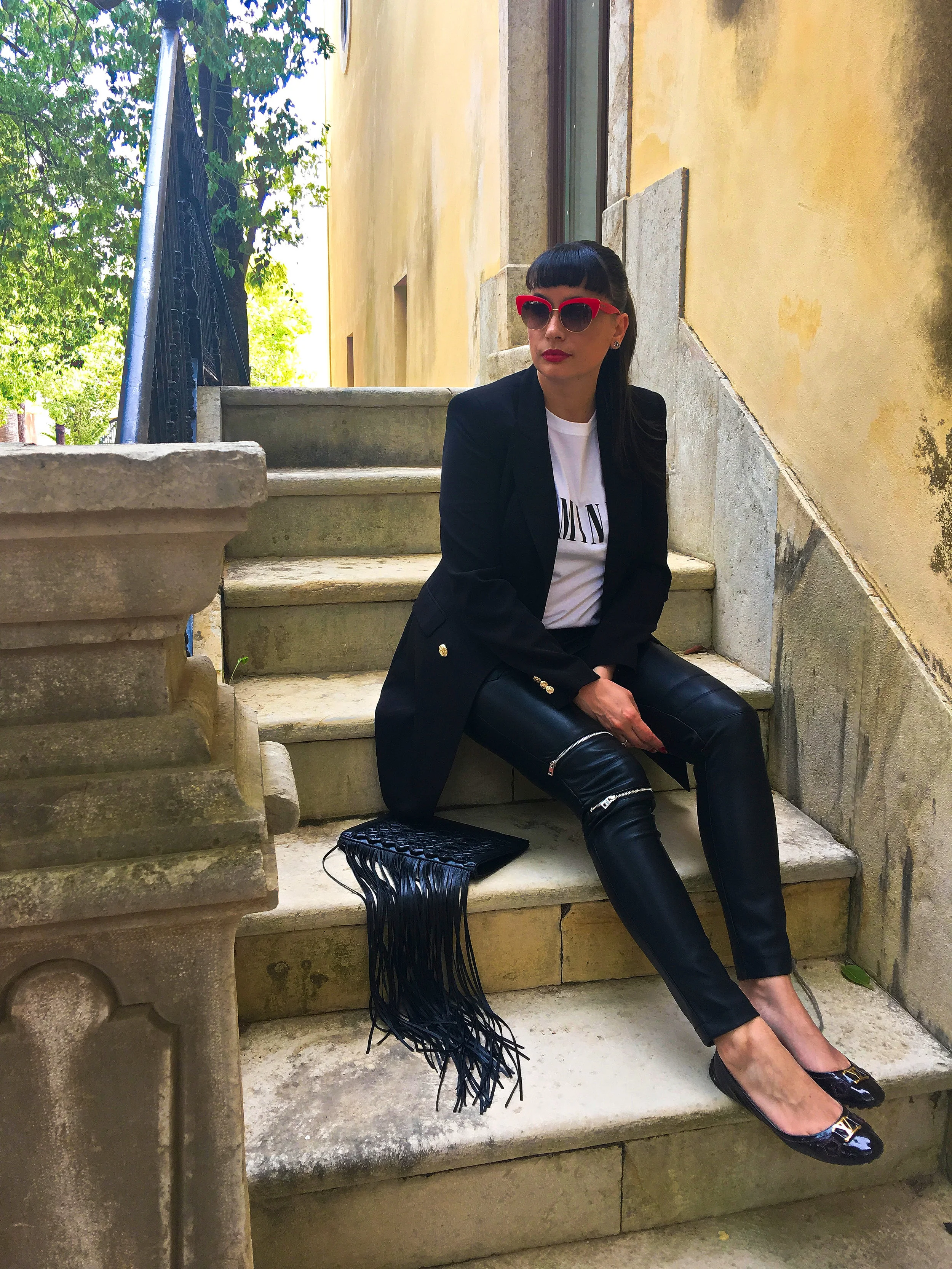 Eu usei uma t-shirt de slogan de afirmacao, branca, fabulosa e coordenei-a com um par de calcas de cabedal rockeiras e um casaco blazer comprido preto. Accessorizei com a minha clutch de franjas, oculos-de-sol vermelhos Doce &Gabbana, bailarinas da Louis Vuitton e brincos e relogio com cristais.