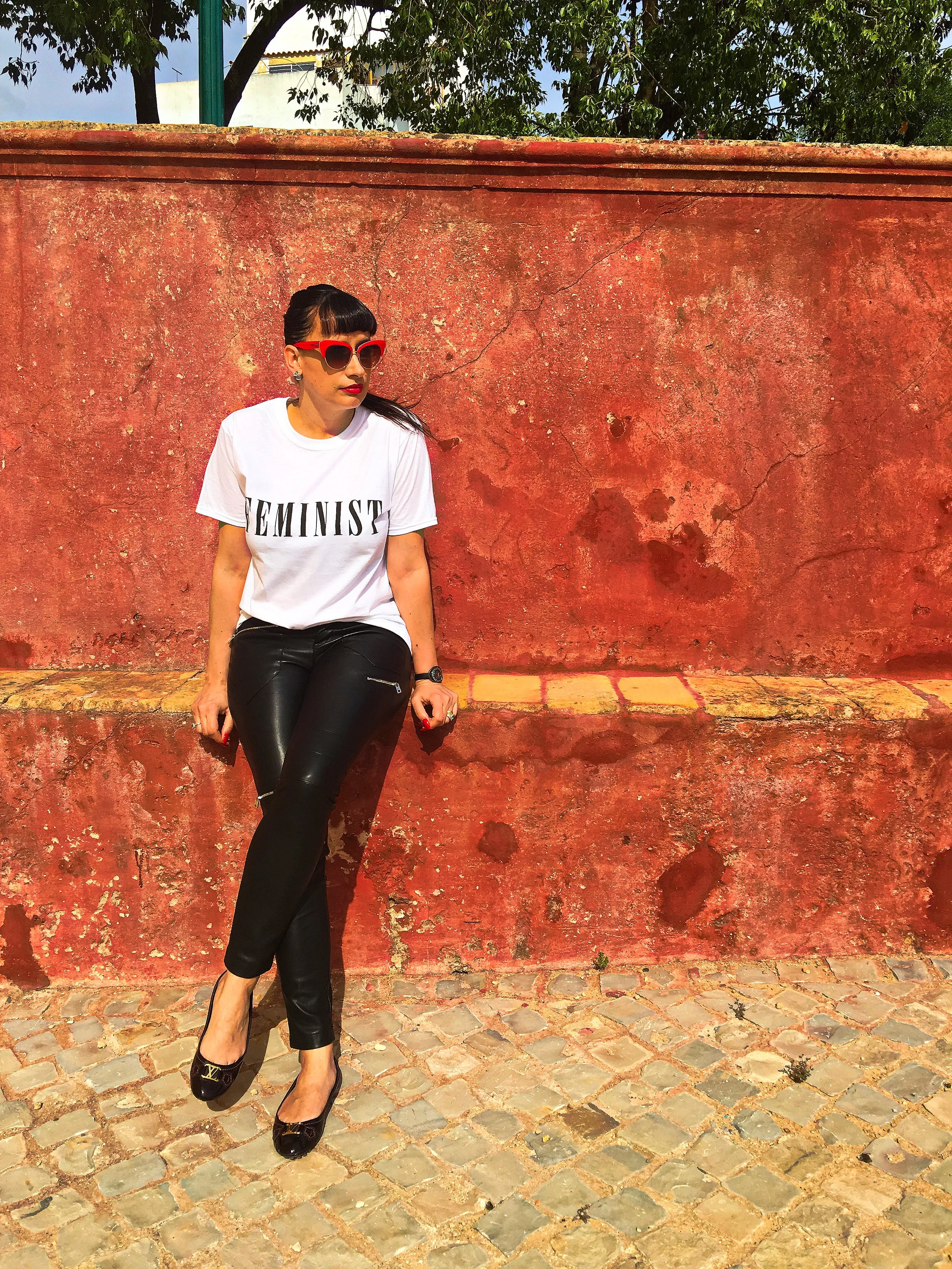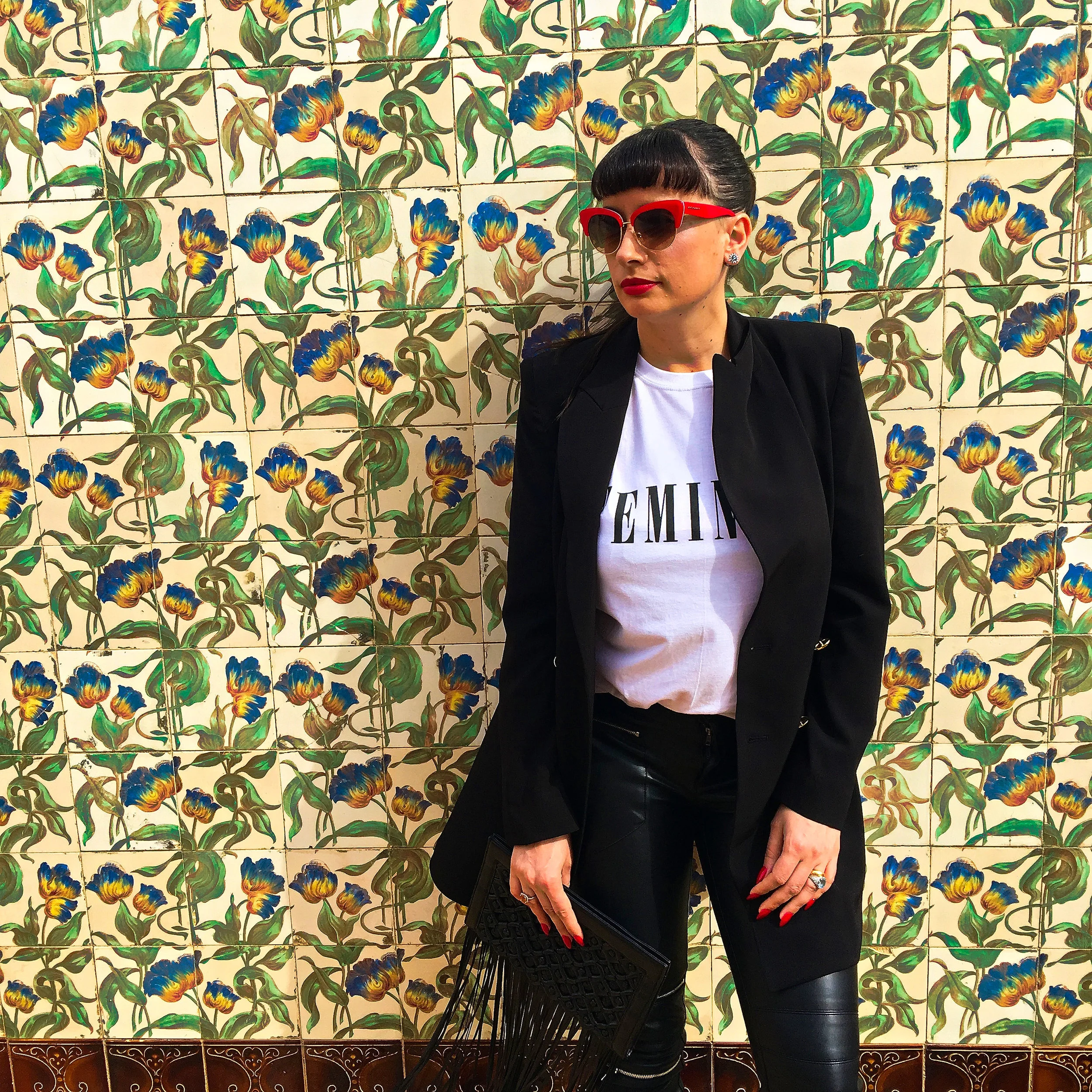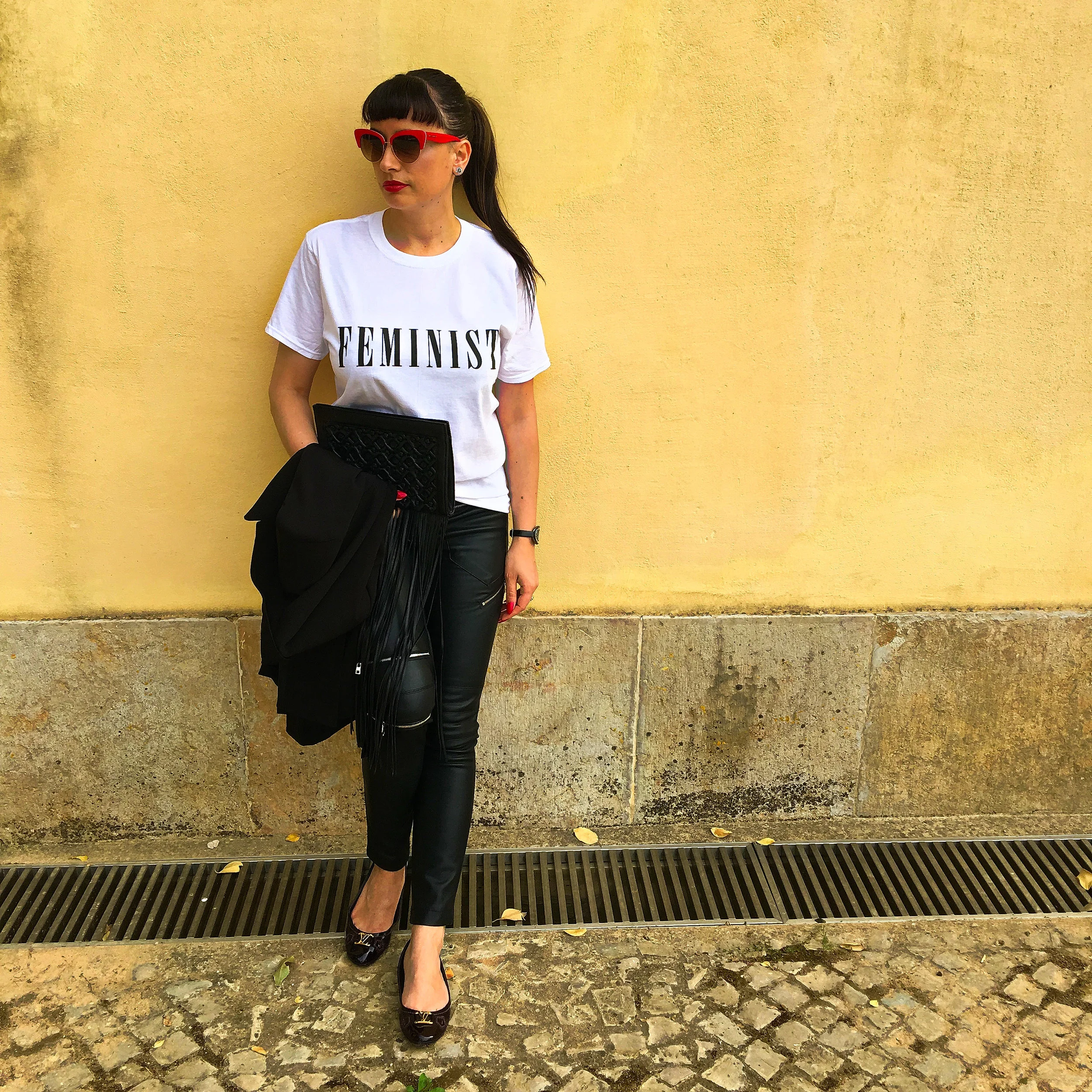 As t-shirts com slogan de afirmacao sao uma das grandes tendencias de moda para esta estacao e sao um "must" nos nossos guarda-roupas. Faceis de coordenar devido a sua simplicidade elas funcionam perfeitamente tanto em looks de dia como de noite. Elas tornam qualquer look mais simples de uma maneira fabulosa e sao uma maneira chic de transmitir uma mensagem. Neste look eu queria obter contraste e por isso escolhi o blazer e as calcas de cabedal mas esta t-shirt tambem pode ficar incrivel com uma saia longa e um par de saltos altos!