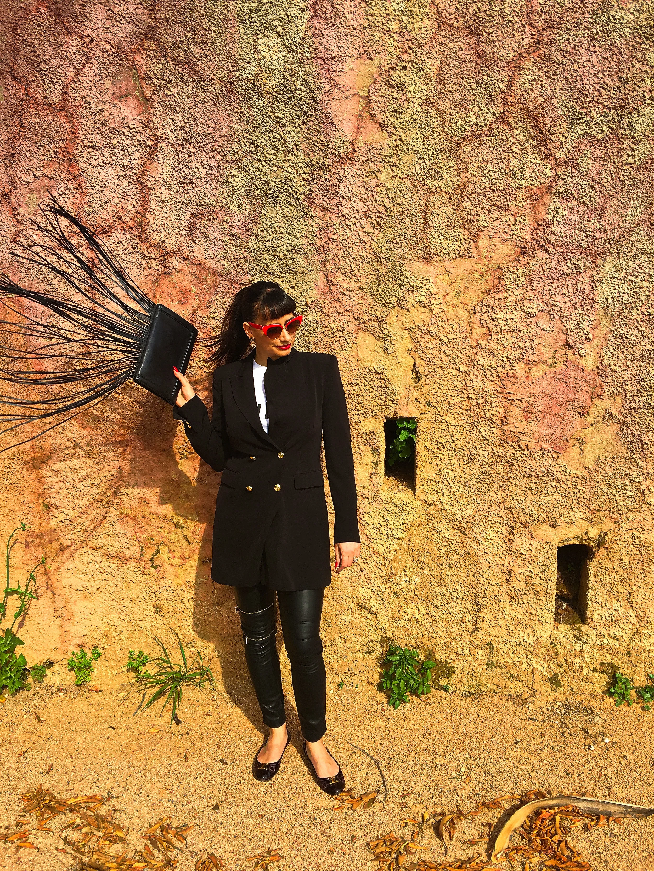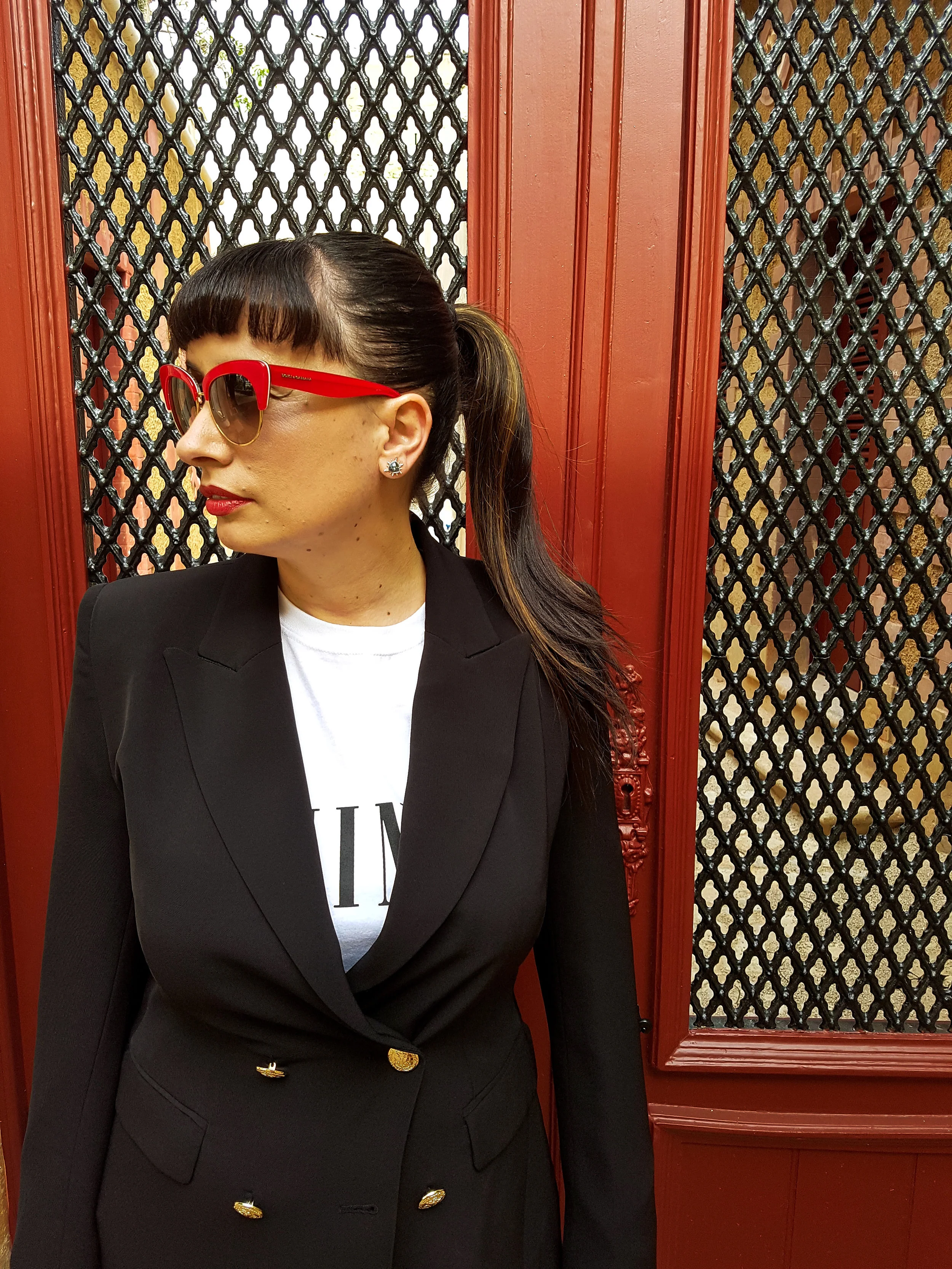 This was a super easy look to put together. I started with the t-shirt and I wanted to coordinate it to produce a chic, modern and grown up look. I chose this long black blazer to tone up the t-shirt feeling and then I added the leather trousers for the modern, rocker look. The accessories were chosen to give an edge to the look specifically the fringe clutch and sparkly accessories. The red sunglasses were the last item to be added just to give a little bit of colour and contrast. Easy!