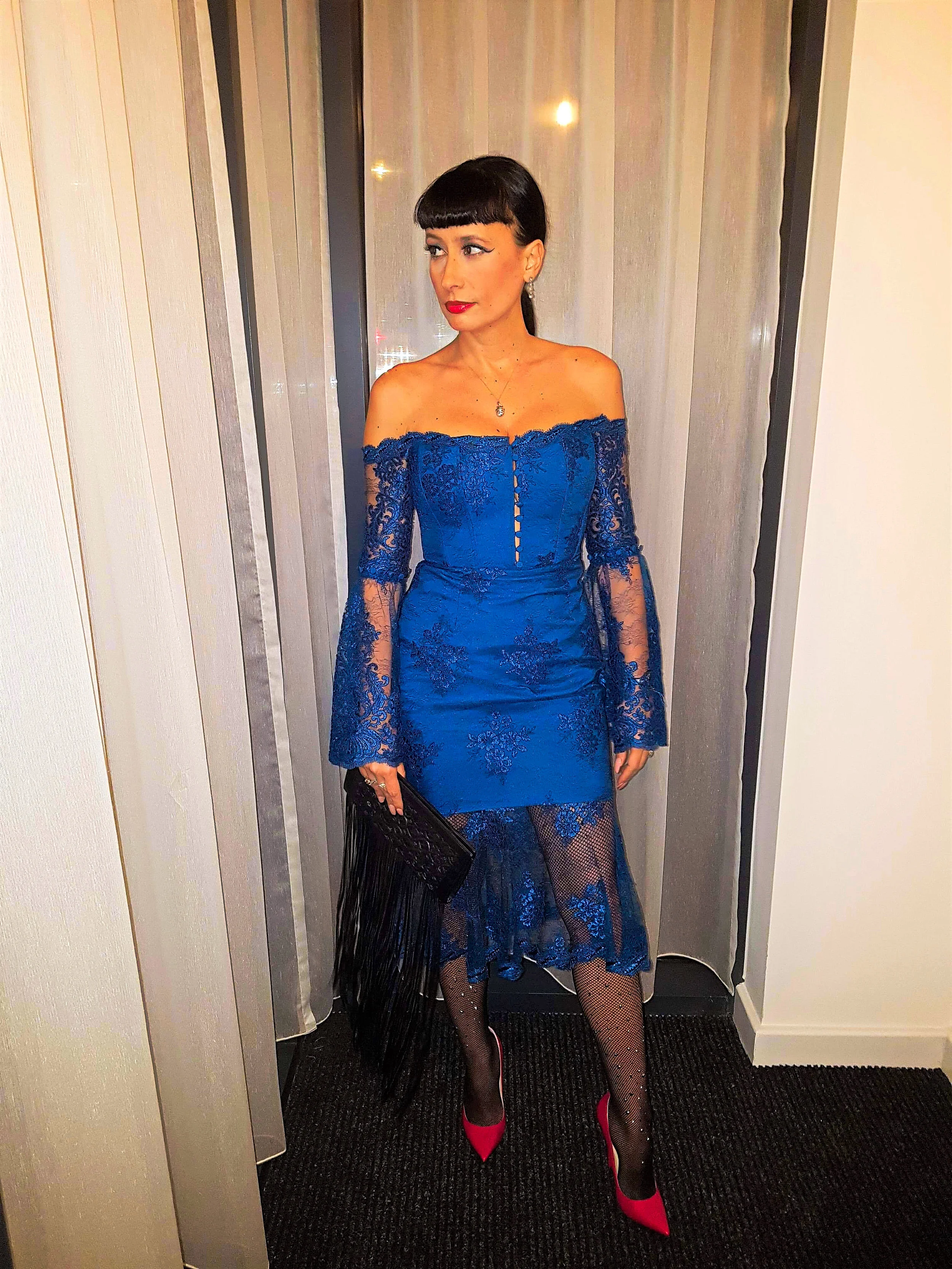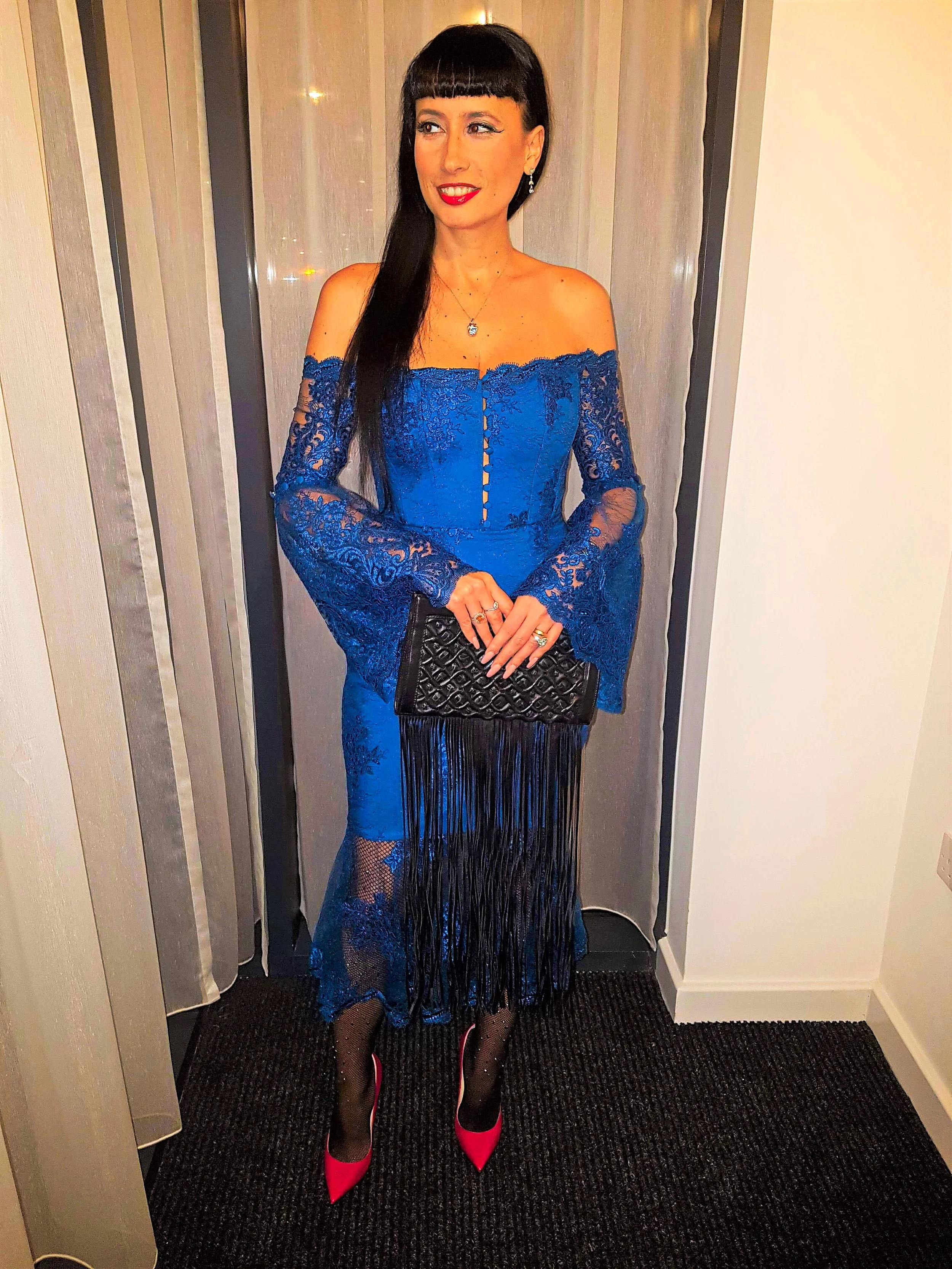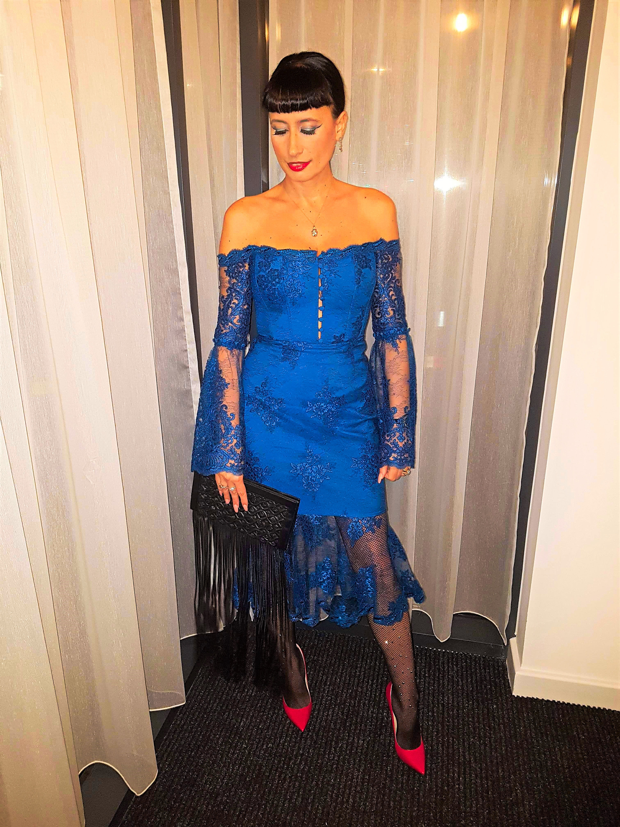 I wore this stunning blue dress with a pair of red high heels by Jimmy Choo (get them here), a fringed clutch by Uterque (similar here) and fishnet tights by Calzedonia (similar here).