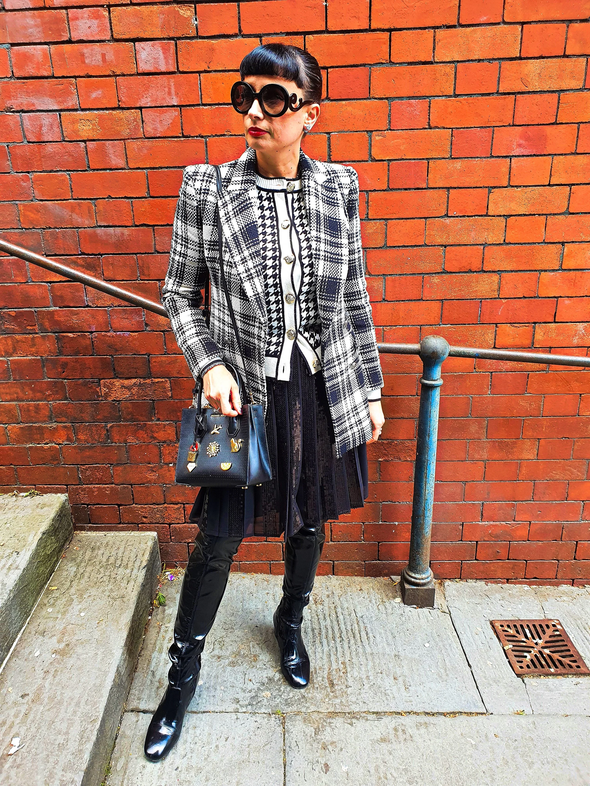 On this look I wore sequins, wool, vinyl, tweed and leather. All of these work perfectly together because they all tie up by the common black and white colors.