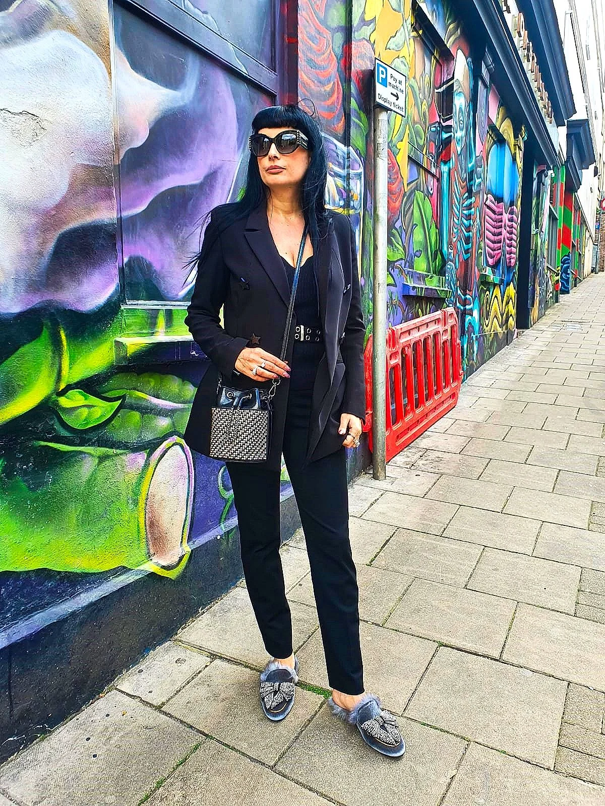 These fabulous, fur lined and crystal embroidered, sliders where the perfect pick to finish off this look because they bring a touch of glam but still coordinate with the neutral look with their grey shade.