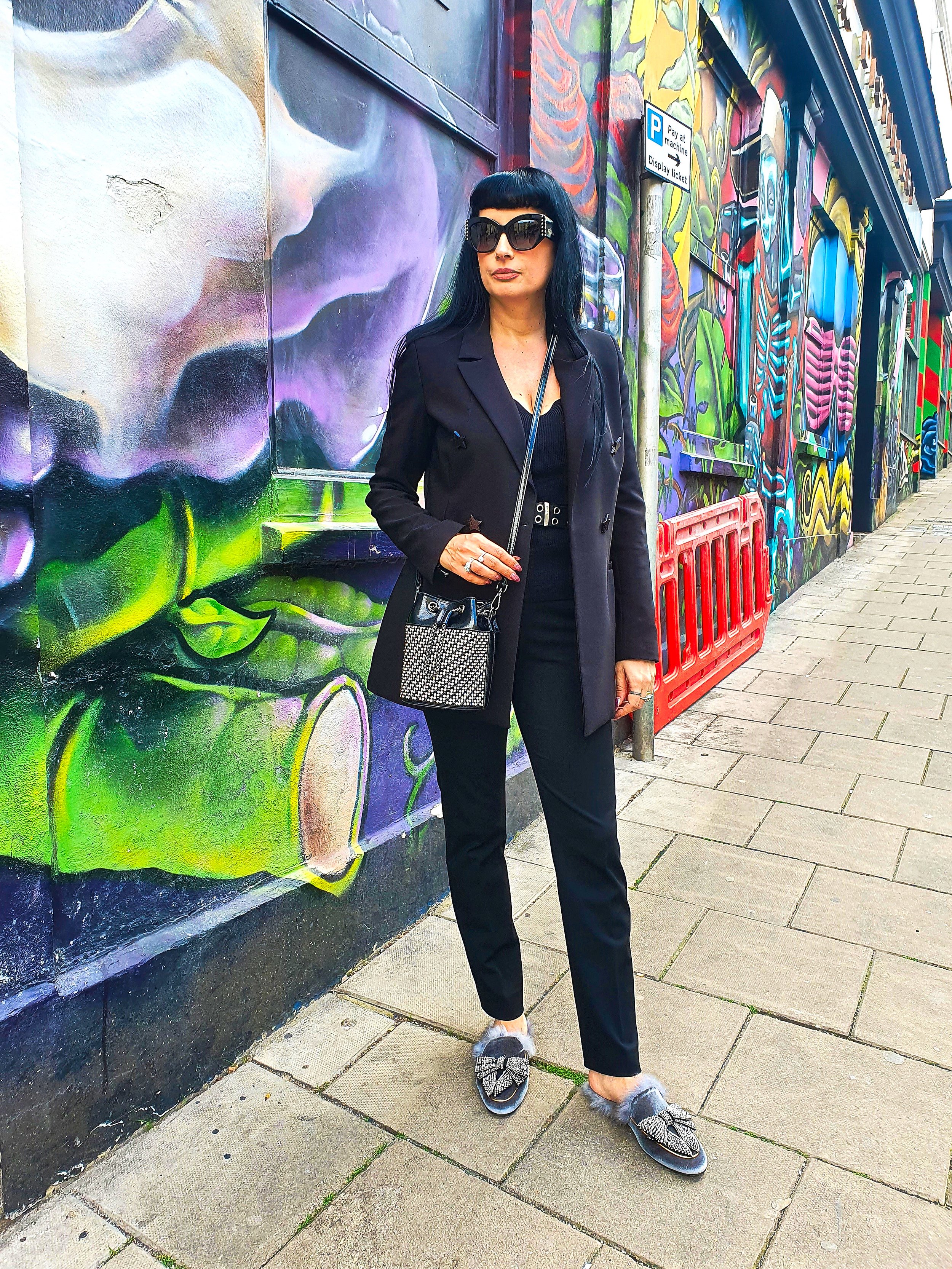 I chose this gorgeous bag because of it’s evening vibe (being patent leather and lined with rhinestones) but also because the cross body strap that makes it more casual for a day look.