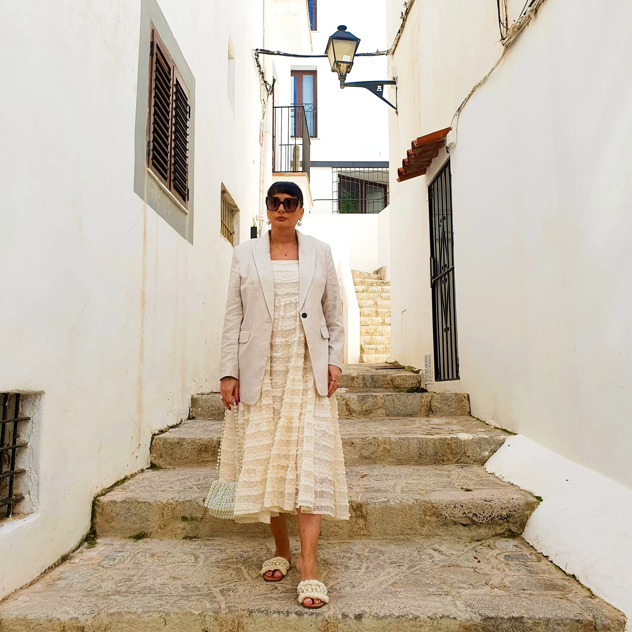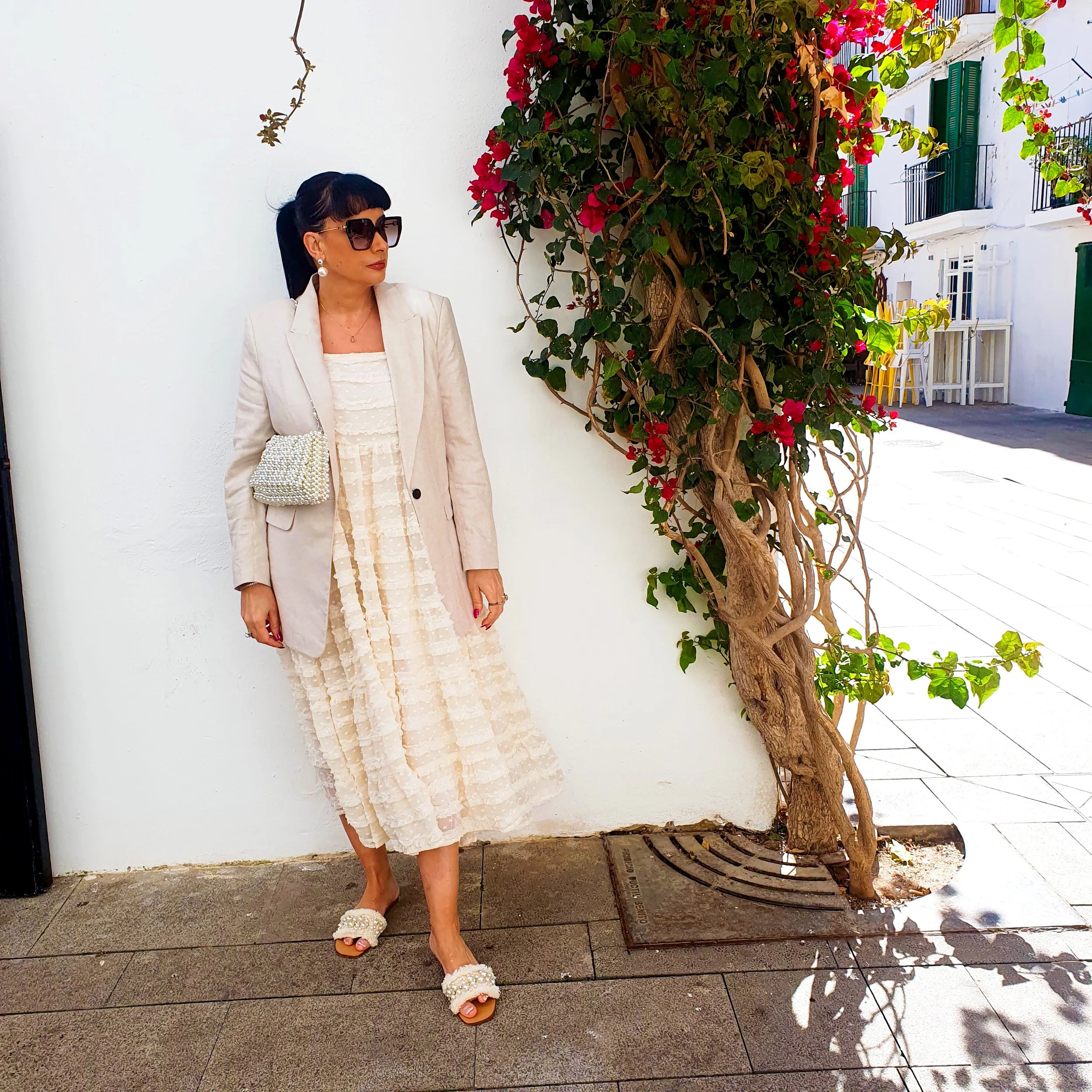 The light organza fabric of the dress together with the linen from the blazer and tweed from the mules were a perfect combination of textures that scream Ibiza, Summer and Holidays for me!