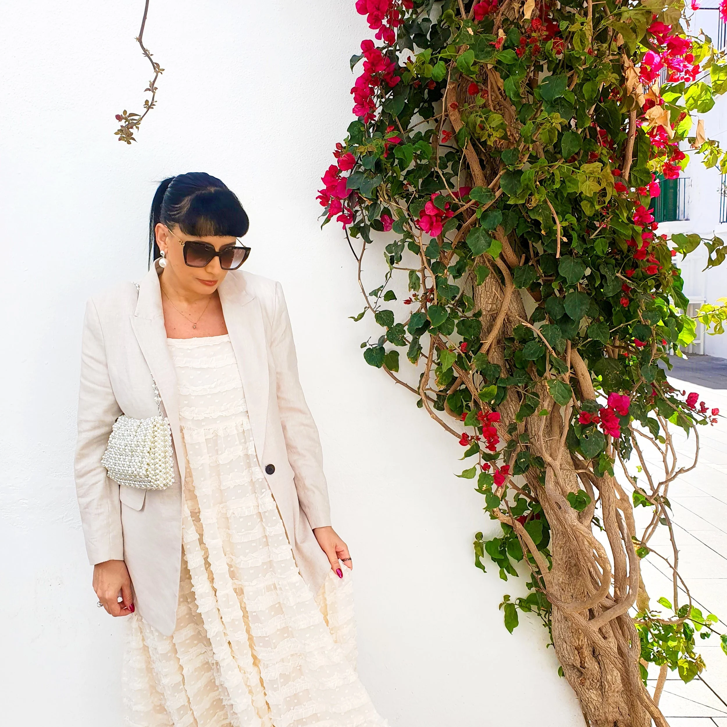 The weather was a perfect 21 degrees and sunny so I wore super light clothes that felt good on my skin but that also felt “Ibiza”! I always imagined the perfect outfit for Ibiza being a full white or off white look and that’s what I selected for this look. I also paired the light shade of the fabrics with pearls to elevate the casual style of the garments.
